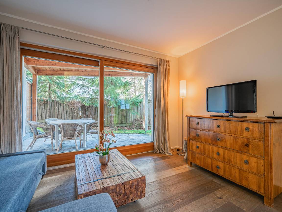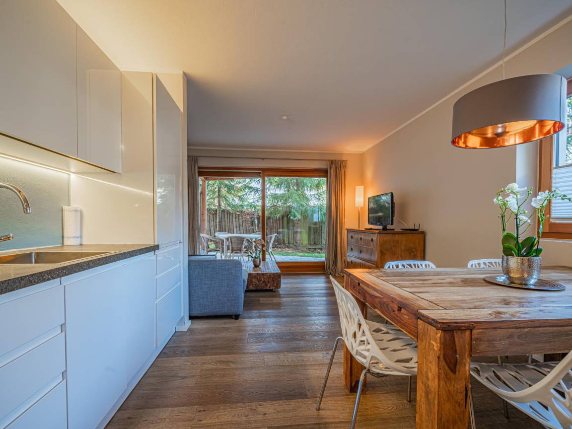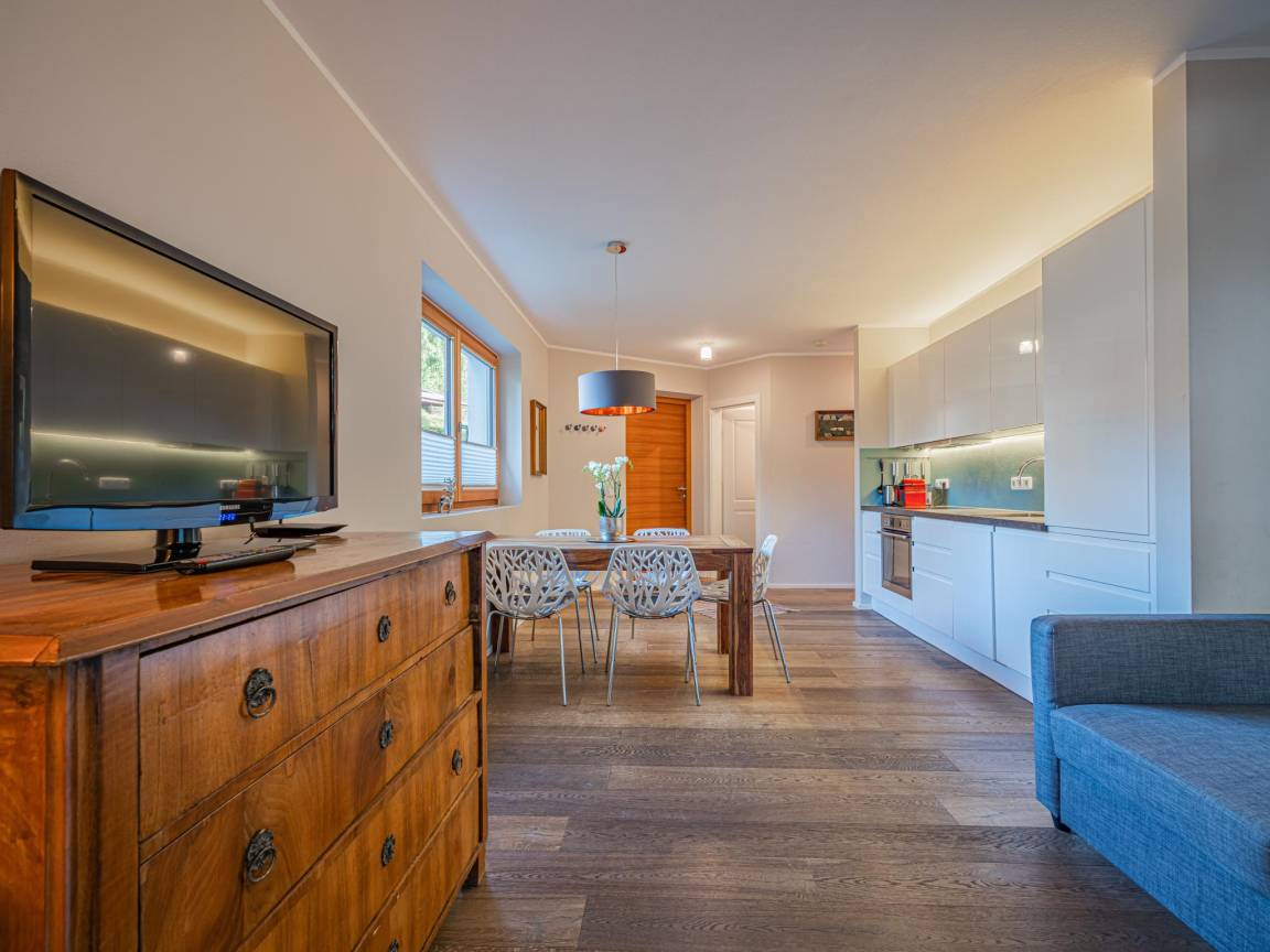 Hausbeschreibung : Dieses gemütliche Apartment im Erdgeschoss bietet eine kleine Terrasse mit Garten, ideal, um die frische Bergluft zu genießen. Der Wohnbereich ist modern eingerichtet und lädt mit Essbereich und voll ausgestatteter Küche zu geselligen Abenden ein. Die zwei stilvollen Schlafzimmer bieten erholsamen Schlaf in ruhiger Atmosphäre. Sanftes Licht und ein helles Design schaffen eine freundliche Stimmung – perfekt für eine entspannte Auszeit in Kitzbühel!