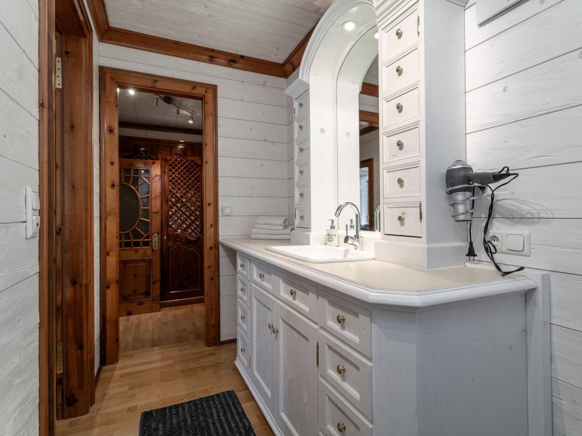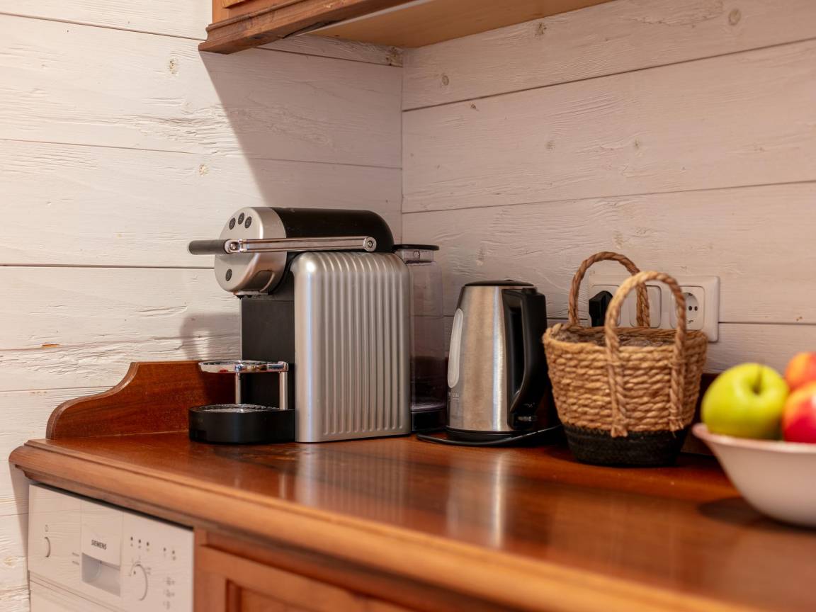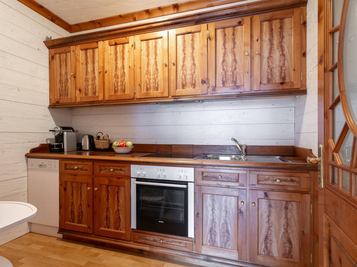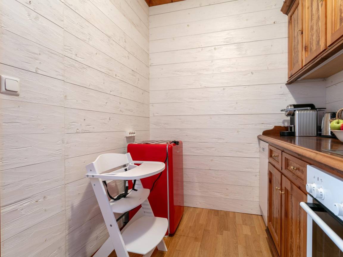 Layout : Parterre(privater Eingang): Eingang, Küche mit Bar(Esstheke), Wasserkocher, Kochherd(4 Kochplatten, Ceranfeld, elektrisch), Dunstabzugshaube, Kaffeemaschine(cups), Backofen, Mikrowelle, Geschirrspüler, Kühlschrank(+ Gefrierfach) , Wohn/Esszimmer mit Doppelschlafcouch(180 x 200 cm), TV, Esstisch, Ofen(Holz, Kachel), Sitzecke , Toilette mit Waschbecken, Toilette , Waschraum mit Waschbecken, Waschmaschine