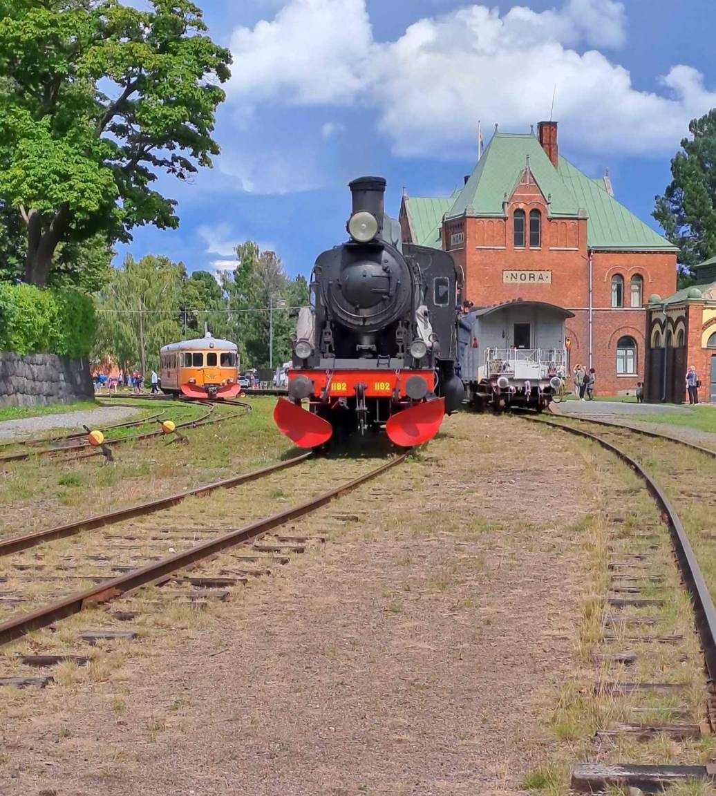 In Nora fährt im Sommer die historische Dampf-Eisenbahn, die ihr buchen könnt, durch die Landschaft.