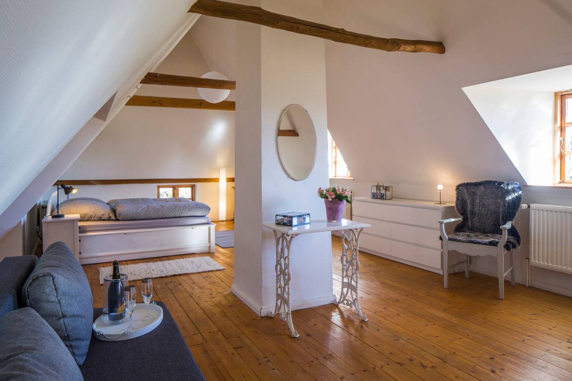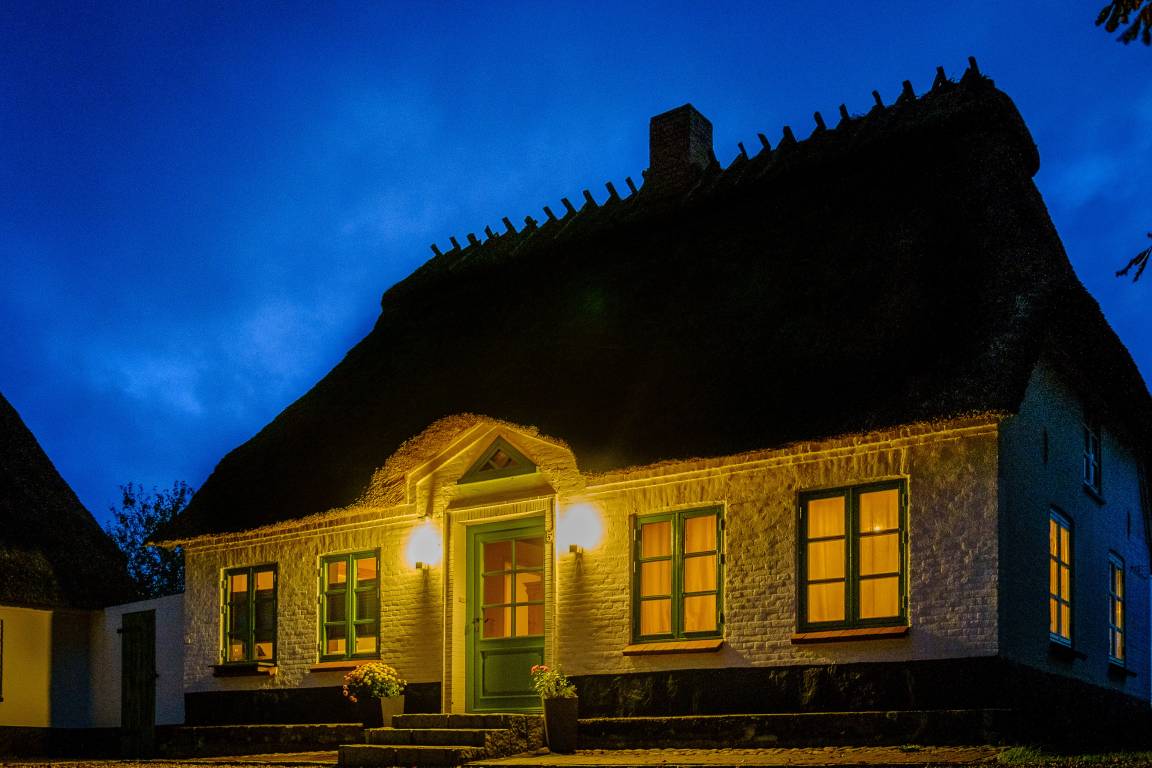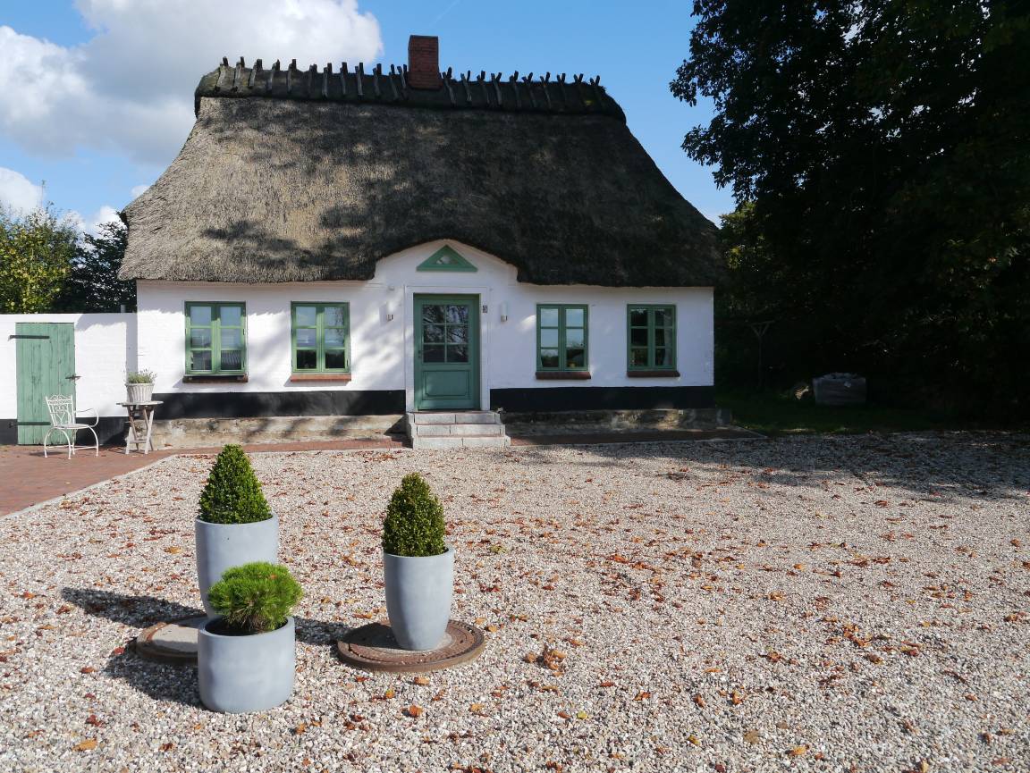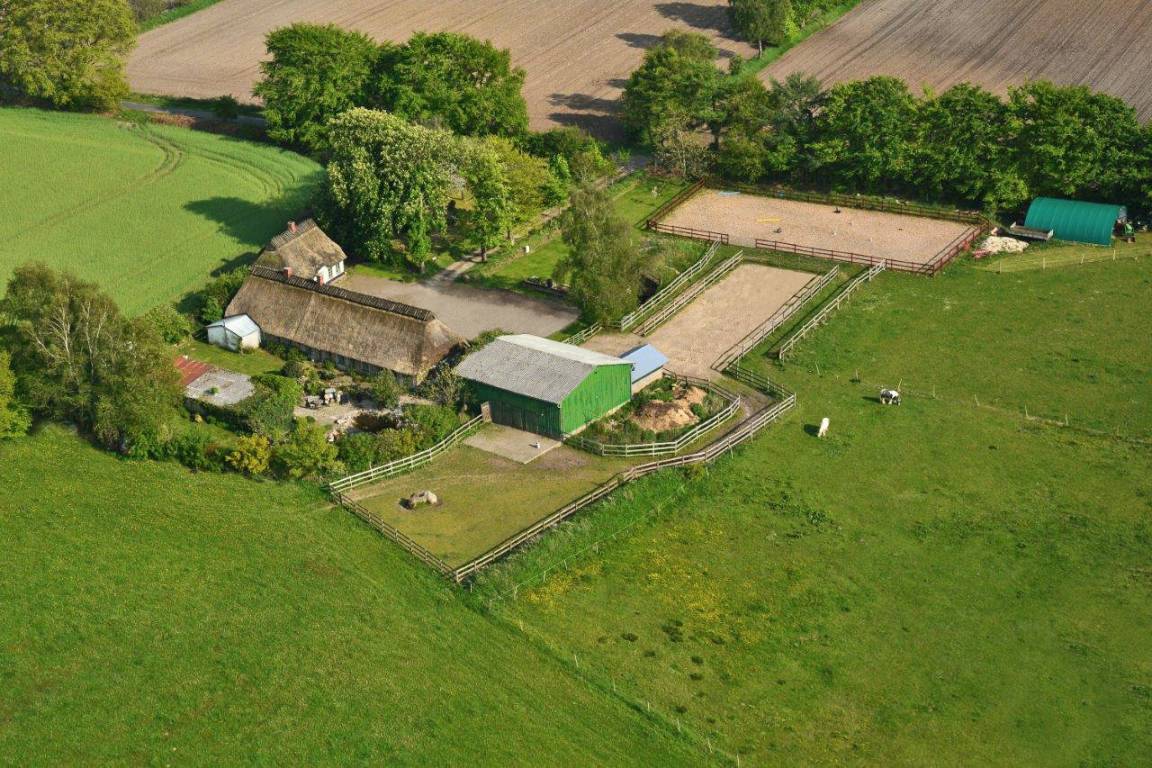 Den Gästen steht eine liebevoll restaurierte Reetdachkate auf einem 300 Jahre alten Hof in herrlicher Alleinlage zur Verfügung. Schlicht und unaufgeregt empfängt das Ferienhaus Elmholz seine Gäste. Dänische Sprossenfenster, knarrende Holzdielen, helle Farben und natürliche Materialien prägen den nordischen Wohnstil. Das Kaminfeuer heizt im Winter kräftig ein. Im Sommer, wenn es draußen richtig warm wird, hält das Reetdach das Haus angenehm kühl. Im Erdgeschoss befindet sich ein Schlafzimmer mit französischem Bett, das Wohnzimmer mit Kaminofen, Ess- und Sofaecke (Blick auf unsere Pferde inklusive), sowie Küche (Tür zur Terrasse mit Strandkorb und freiem Blick aufs Feld) und Dusch-Bad mit Fußbodenheizung. Im Obergeschoss bietet ein großes, zur Treppe hin offenes Wohn-Schlafzimmer viel Freiraum unter Reet. Im ganzen Haus sorgt der Glasfaseranschluss für schnelles Internet. Auf dem Hof befindet sich eine Ladestation für E-Autos. Zusätzlich zur Terrasse steht den Gästen ein eigener Garten mit weiteren Gartenmöbeln und Strandkorb zur Verfügung. Hier kann die Nachmittagssonne genossen und im Sommer auch gegrillt werden.