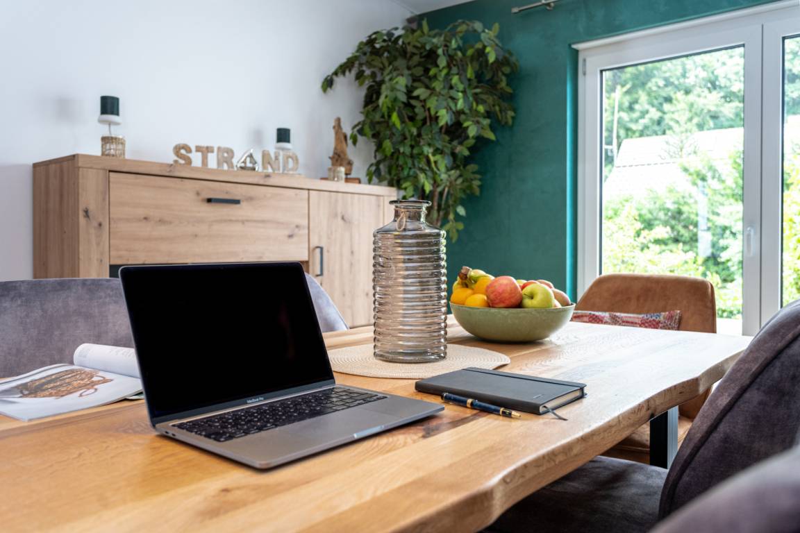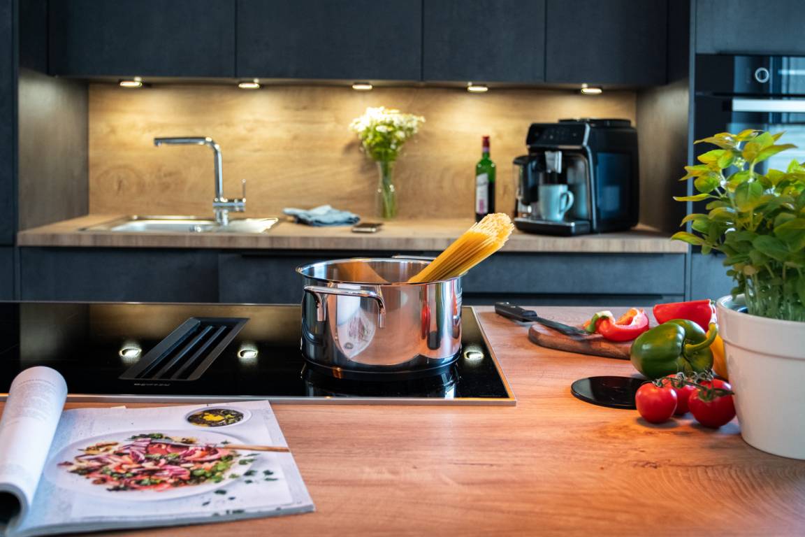 Der offene Wohnbereich im Erdgeschoss kombiniert Wohnen, Essen und Kochen in einem großzügigen Raum. Der Wohnbereich lädt mit einem Kaminofen zu entspannten Abenden ein. Ein 55-Zoll-Flachbildschirm und ein Bluetooth-Sound-System sorgen für beste Unterhaltung. Die voll ausgestattete Wohnküche mit Inselblock und Tresen bietet hochwertige Geräte, darunter Herd, Backofen, Kühl- und Gefrierschrank, sowie einen Kaffeevollautomaten, Kaffeemaschine, Mikrowelle, Toaster und Wasserkocher.