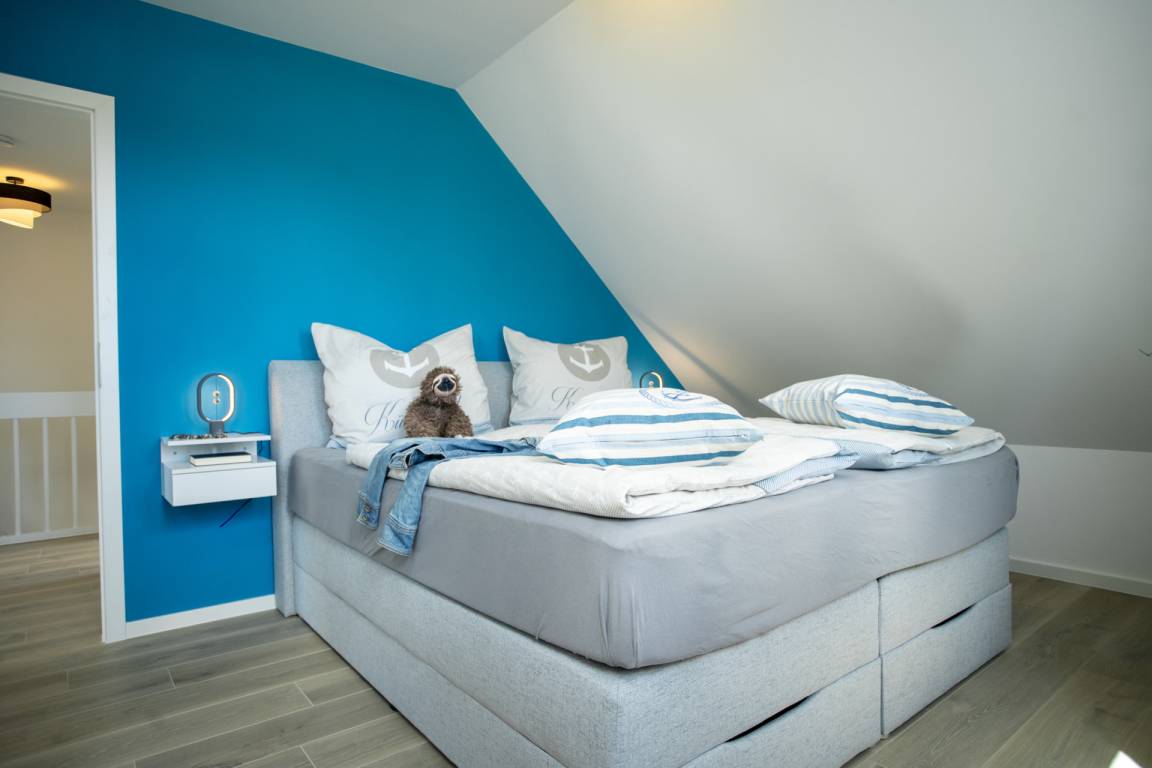 Die drei liebevoll gestalteten Schlafzimmer im Obergeschoss sind mit komfortablen Boxspringbetten ausgestattet – zwei Schlafzimmer jeweils mit einem 1,80 x 2,00 m Boxspringbett und großem Kleiderschrank. Das dritte Schlafzimmer mit zwei zusammen schiebbaren Einzelbetten je 1,00 x 2,00 m. Das Schlafzimmer verfügt über einen kleinen Kleiderschrank, Kommode, Nachttische und einen 40 Zoll Flatscreen-TV.