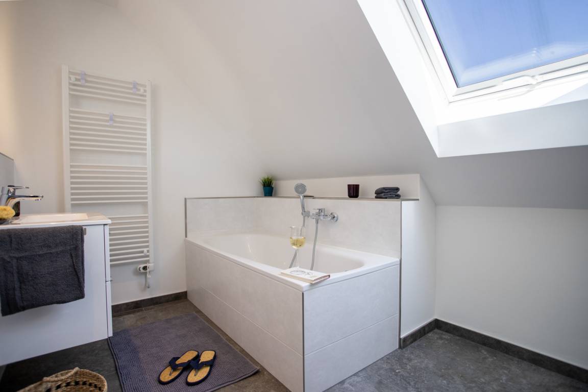 Das Haus bietet zwei moderne Badezimmer: im Obergeschoss ein Vollbad mit Badewanne und Schauerdusche, im Erdgeschoss ein weiteres Badezimmer mit Walk-in Schauerdusche.