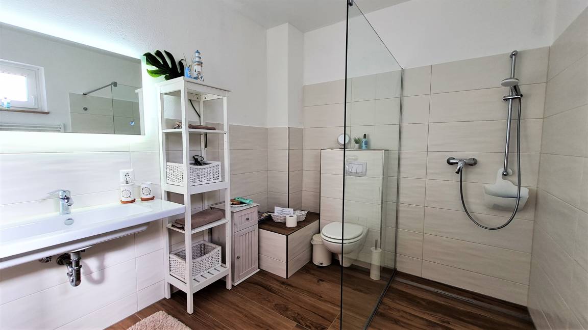 Die moderne Ferienwohnung wurde im Jahr 2020 eingerichtet und verfügt über ein Wohnzimmer mit offener Einbauküche samt Seepanorama, ein schönes kühles Schlafzimmer (durch die Hanglage), ein Bad mit Seeblick vom WC und Walk-in-Dusche sowie über Flur und zwei kleine Vorratsräume.