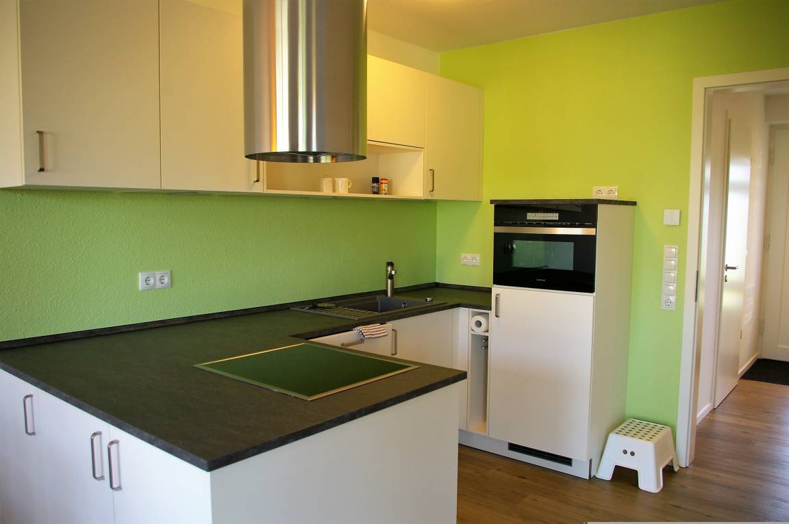 Die Küche ist mit einer großzügigen Küchenzeile und einer Essgruppe für 4 Personen ausgestattet, von der aus Sie durch die Terrassentür wieder den Blick auf den See genießen können. Auch in der Küche finden Sie alles, was eine moderne Küche benötigt (Cerankochfeld mit Backofen, Mikrowelle, Wasserkocher, Filter- und Pad- Kaffeemaschine, Toaster, Handrührgerät, Kühlschrank mit Eisfach, Topfset sowie modernes Geschirr und Besteck).