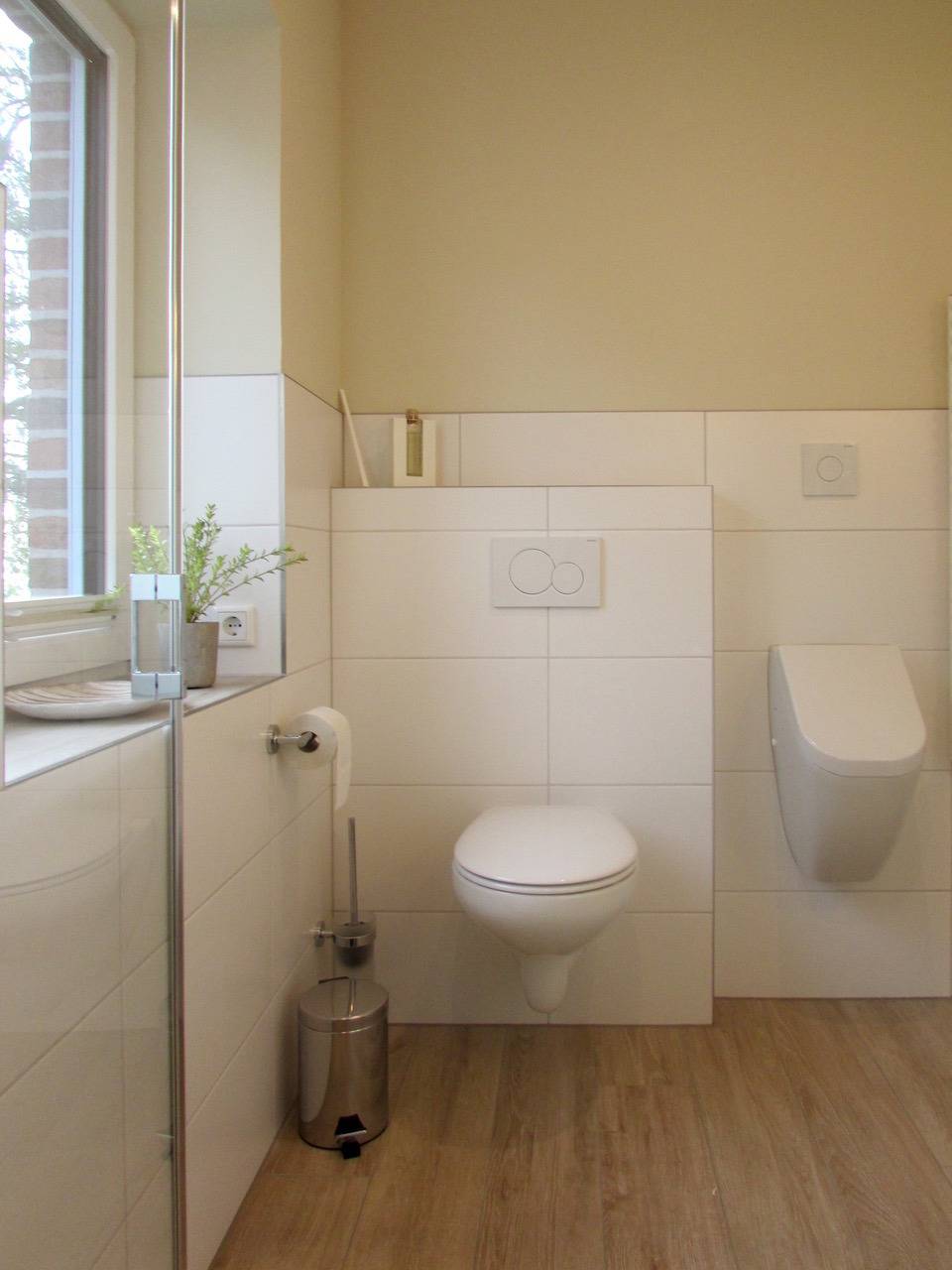 Das kleinere Bad ist ebenfalls hell und mit WC, Waschtisch, Pissoir und einem Fenster ausgestattet.