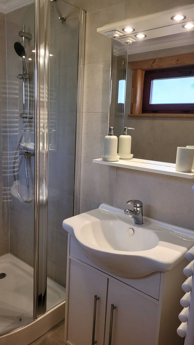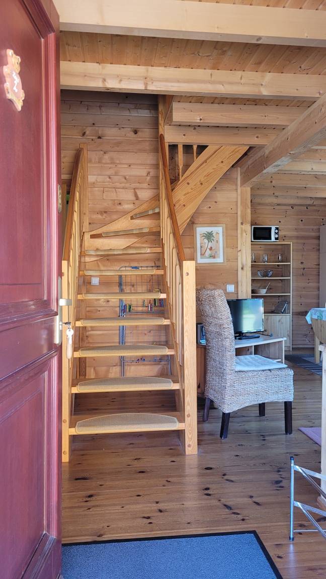Die Ferienwohnung erstreckt sich über 2 Etagen. Im Erdgeschoß befindet sich der Wohnraum, die Küche mit Eßecke und das Bad mit Dusche/WC und Waschtisch. Durch eine Balkontür gelangen Sie zur Außenterrasse. Wohnraum, Küche und Eßecke sind als offene Bereiche miteinander verbunden. Der Wohnbereich ist mit einem Sat-TV, CD-Player, Radio und einer gemütlichen Couch ausgestattet.