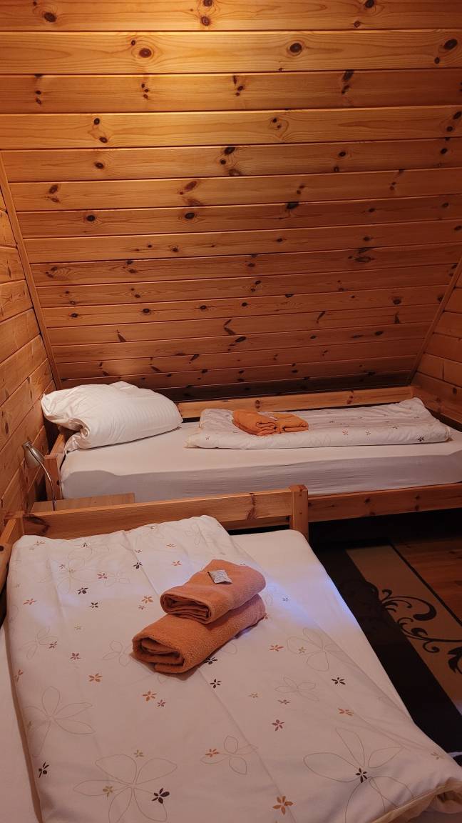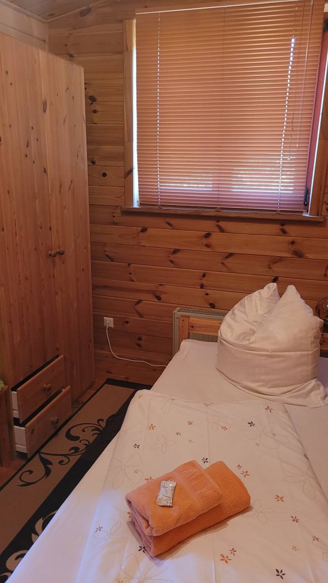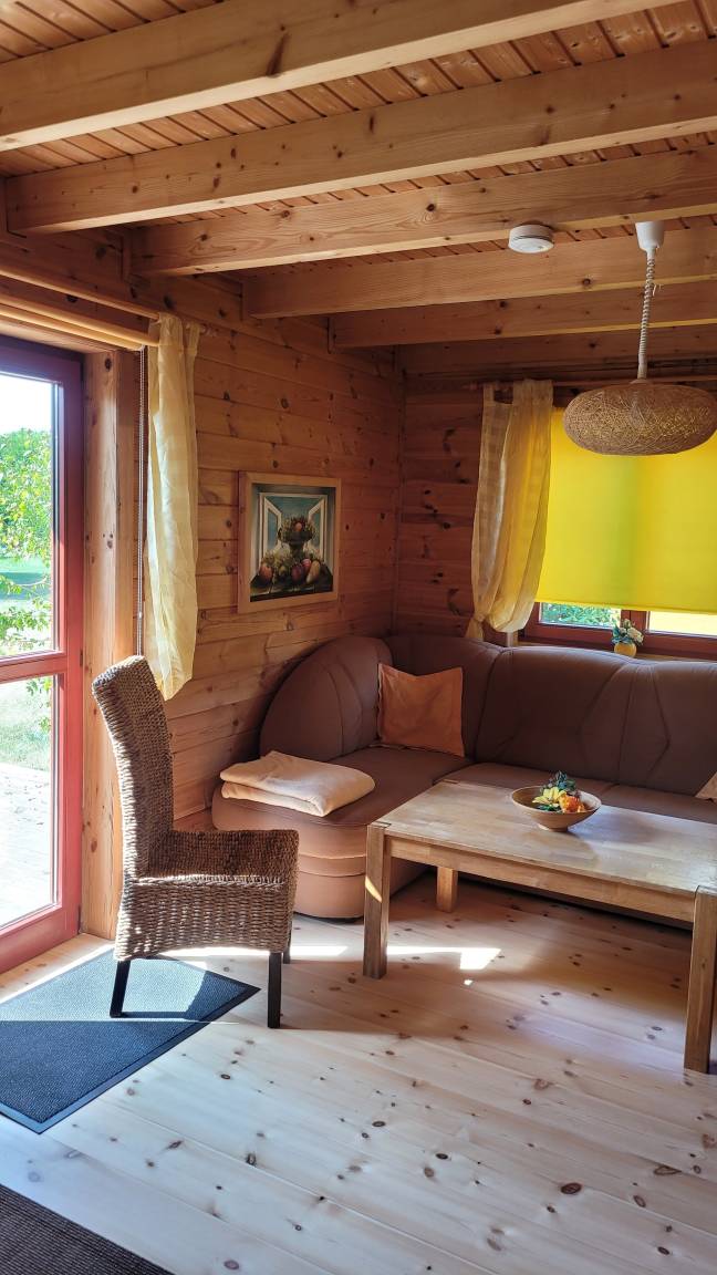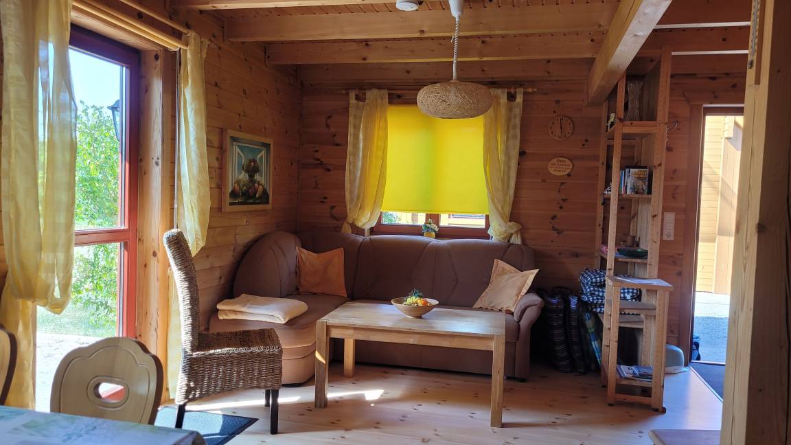 Gemütliches Ferienhaus als Doppelhaushälfte, im Blockbohlenstil, 1, 5-geschossig für 5 Personen möglich plus Baby. Sie können unsere Ferienhäuser, sowie das gesamte Grundstück mit dem Teich genießen.