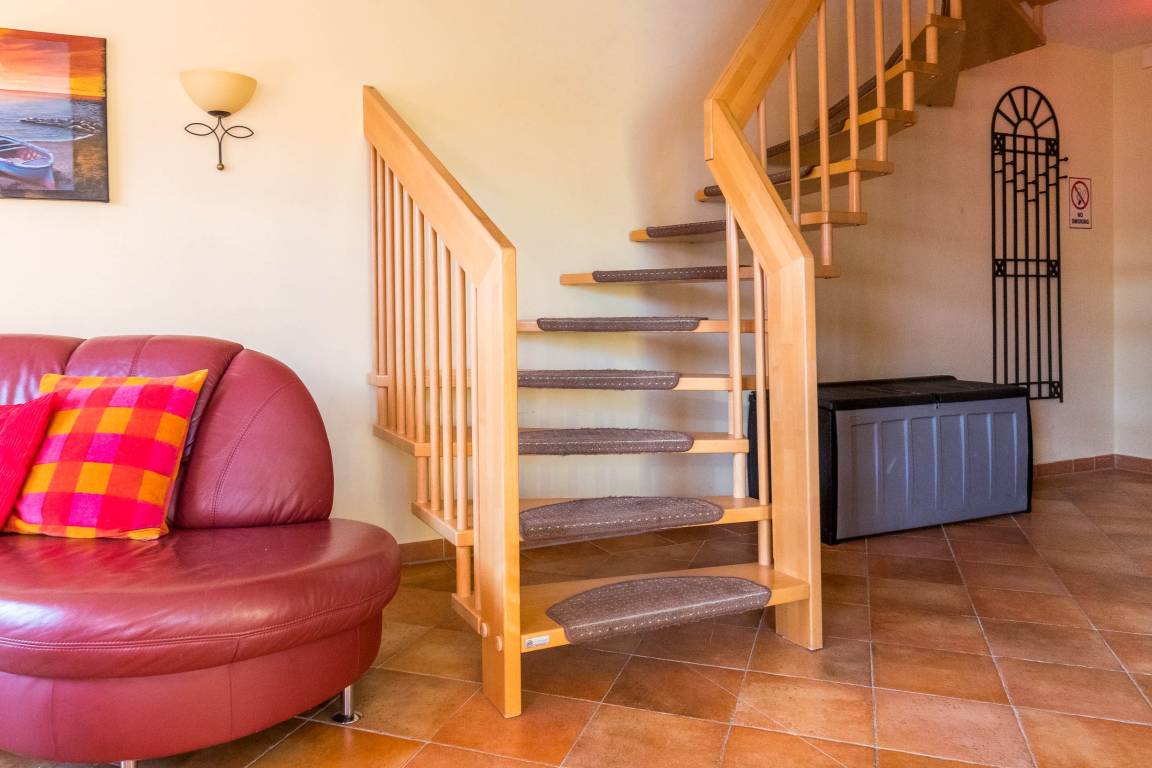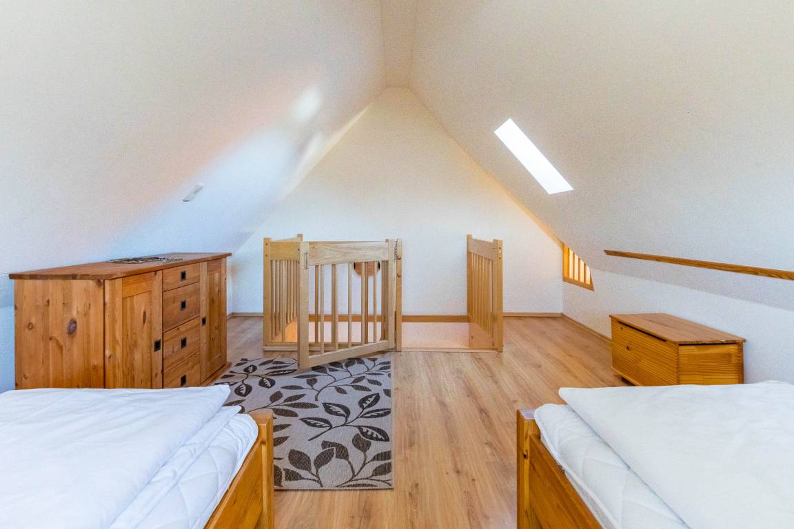 Das Obergeschoss verfügt über ein komfortables Schlafzimmer mit großem Kleiderschrank. Außerdem befindet sich hier das großzügige Duschbad, ausgestattet mit Dusche, Waschbecken, WC, Föhn, Waschmaschine und einer eigenen Sauna im Haus – ideal für entspannte Wellnessmomente. Auch hier sorgt eine Fußbodenheizung für wohlige Wärme. Ein weiteres Schlafzimmer liegt im Spitzboden und ist mit zwei Einzelbetten sowie einem Kinderbett ausgestattet – ein gemütlicher Rückzugsort, besonders für die kleinen Gäste.