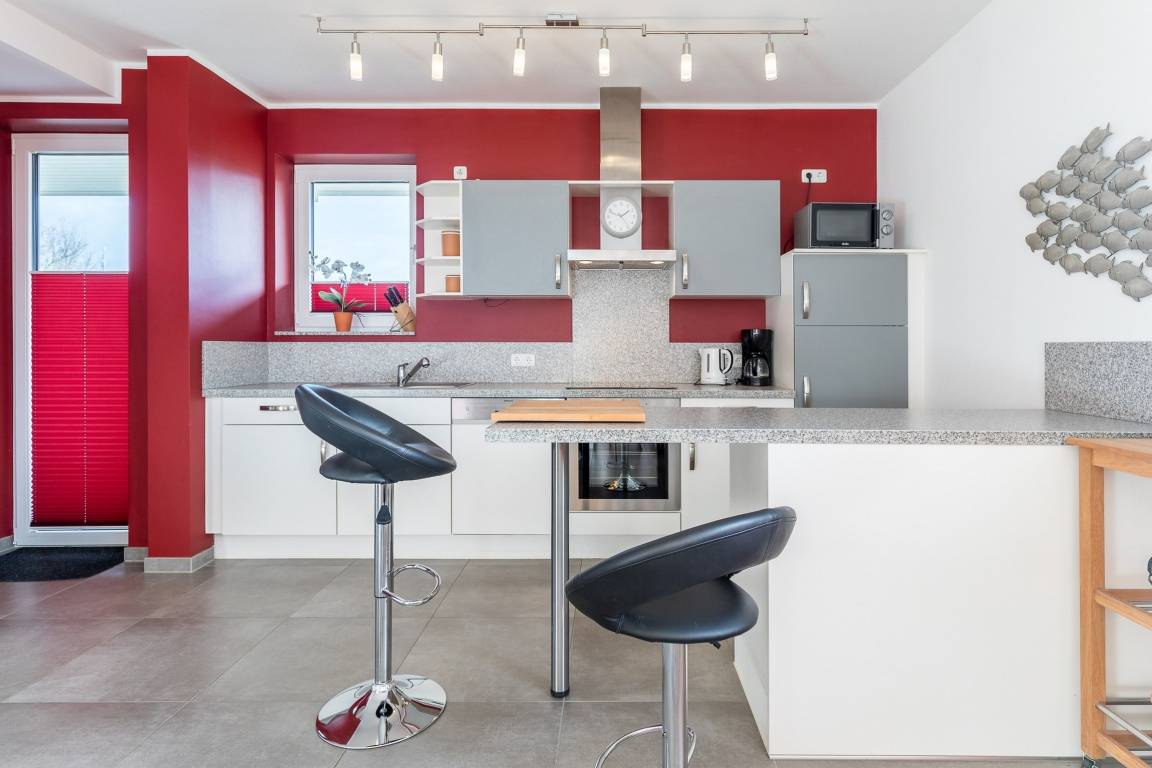 Direkt nach dem Betreten der Ferienwohnung kommen Sie in einen großen Raum, der modern ausgestatteten Küche - Wohn- und Esszimmer zugleich - in dessen Zentrum ein schöner, großer Esstisch steht, an dem Sie gemütlich sitzen und den Urlaub auf sich wirken lassen können.