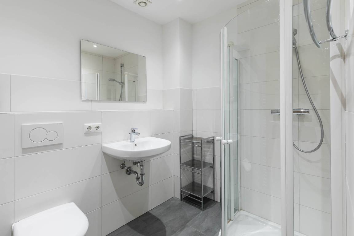 Im hell gefliesten Badezimmer finden Sie eine Dusche und WC.