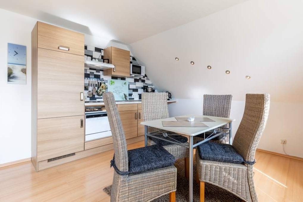 In der offen gestalteten Küche mit Küchenzeile gibt es einen kleinen Geschirrspüler, einen Mini-Backofen, einen Kühlschrank mit Gefrierfach, eine Mikrowelle, einen Toaster, einen Wasserkocher und eine Kaffeemaschine. Ihre Mahlzeiten können Sie bequem an der schönen Essecke einnehmen.
