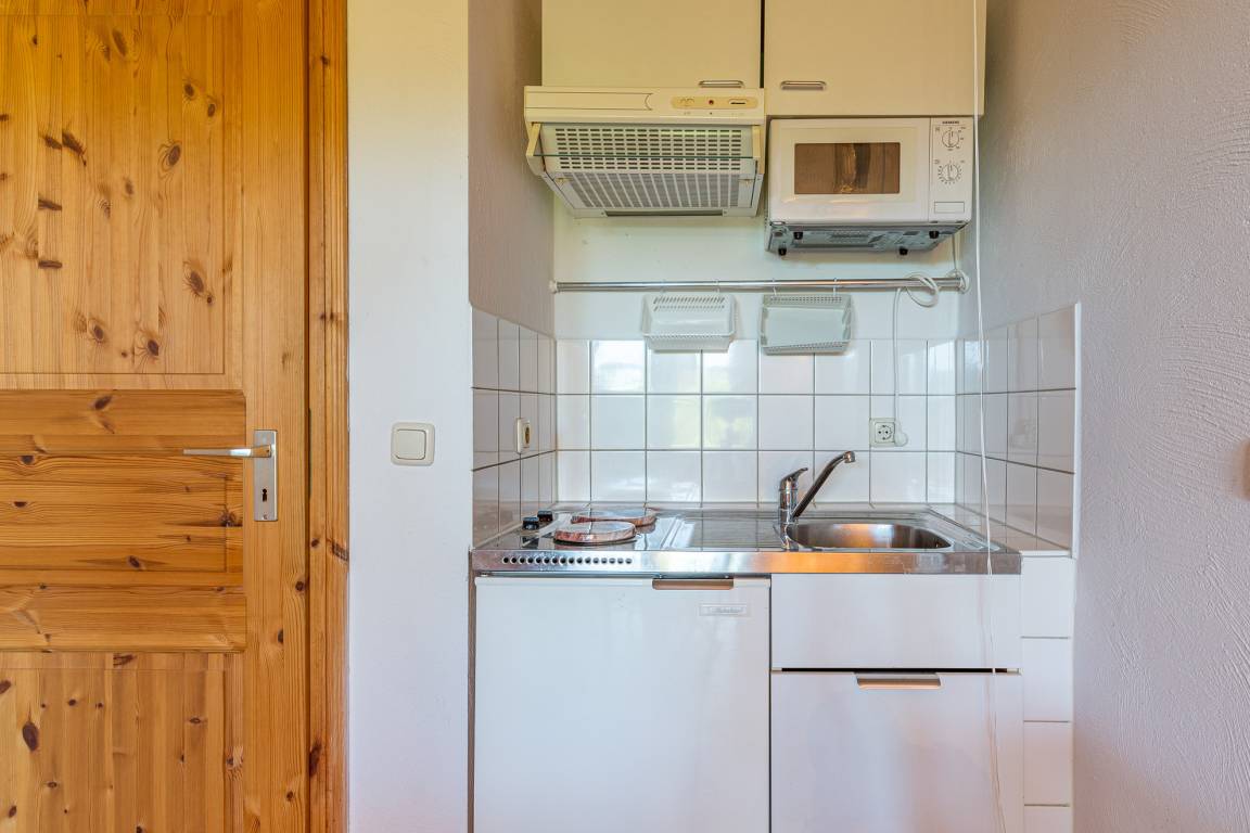 Außerdem besitzt die Wohnung eine voll ausgestattete Mini-Küche mit 2 Platten-Herd, Kühlschrank und Mikrowelle.