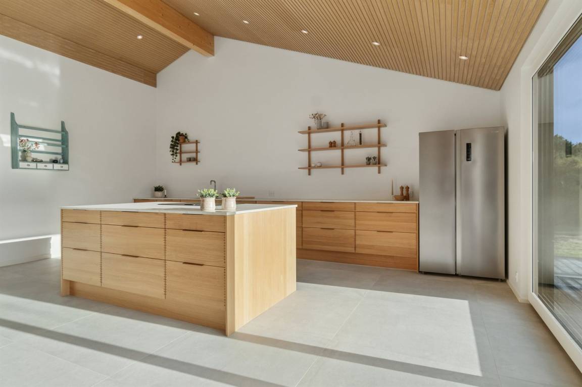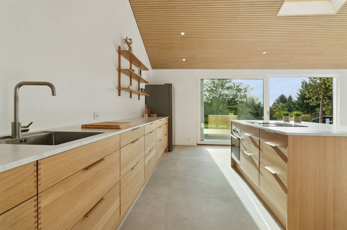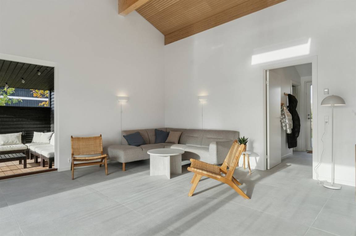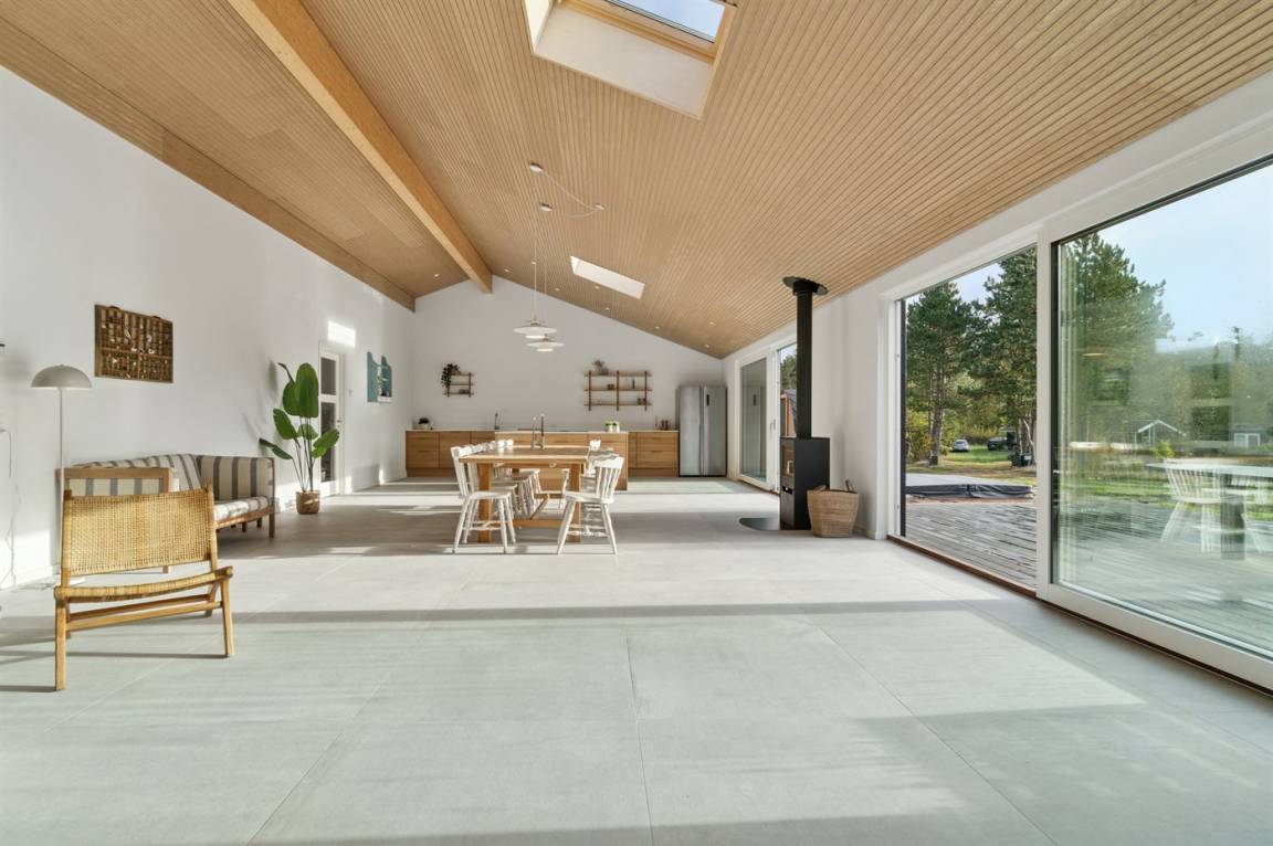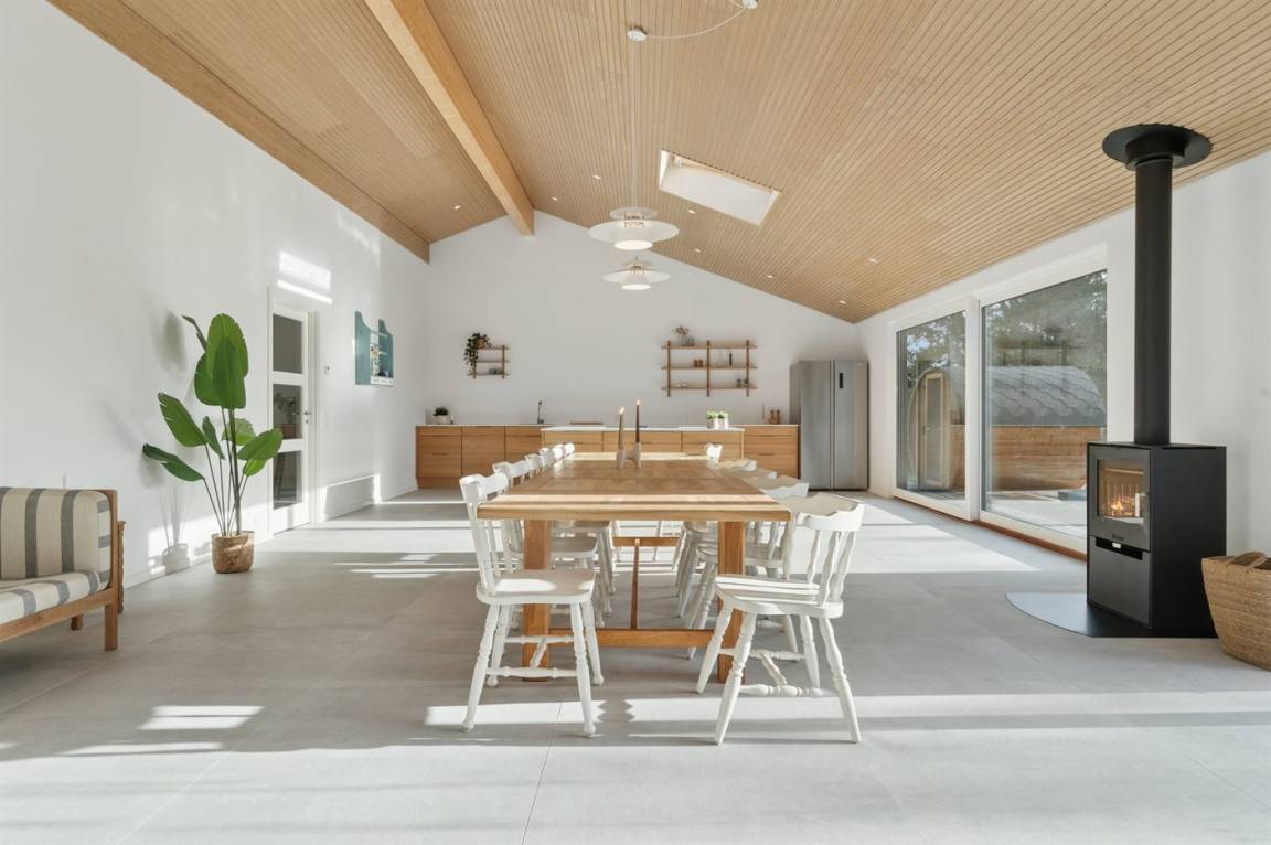 Im Inneren des Hauses gibt es große Fliesen, Eichenpaneele und Decken bis zum First. Die großen Fenster sorgen für ein gutes Lichteinfall in der Küche sowie dem Ess- und Wohnbereich, die als ein gemeinsamer Aufenthaltsraum gestaltet sind. Der Kaminofen sorgt für wohlige Wärme.