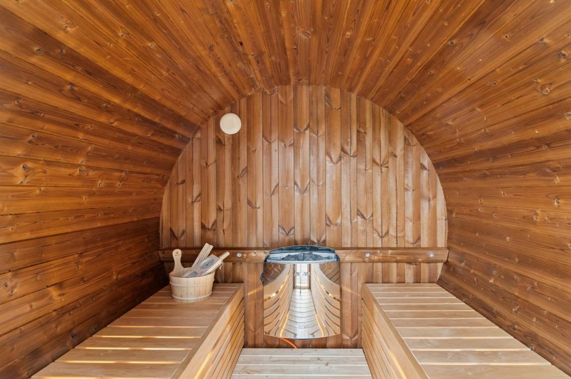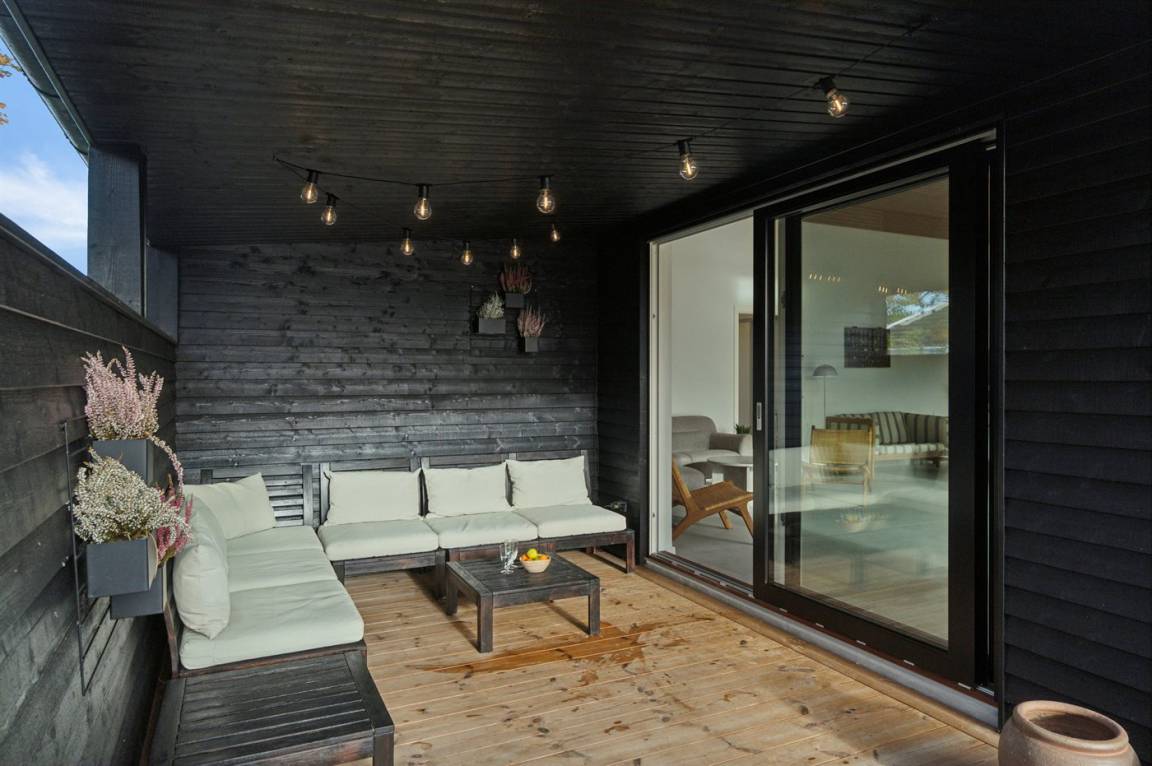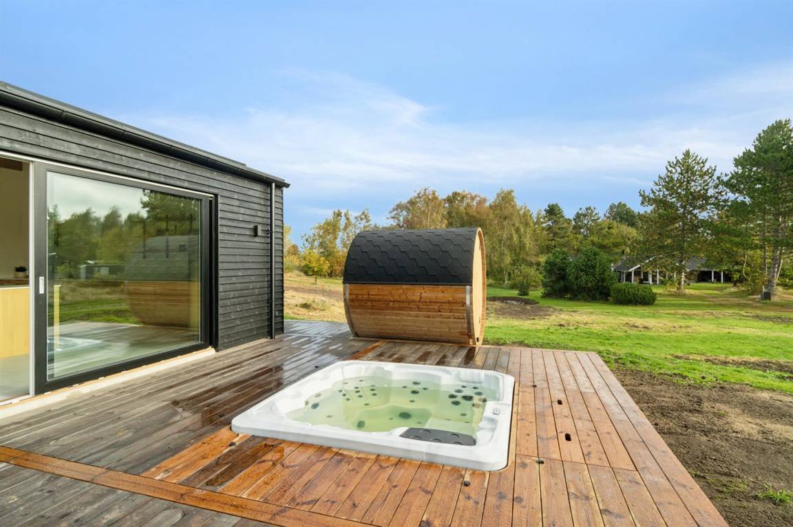 Das Haus besticht mit seiner schwarzen Fassade und einer großen nach Süden ausgerichteten Terrasse. Hier findest du einen Whirlpool, eine Sauna,