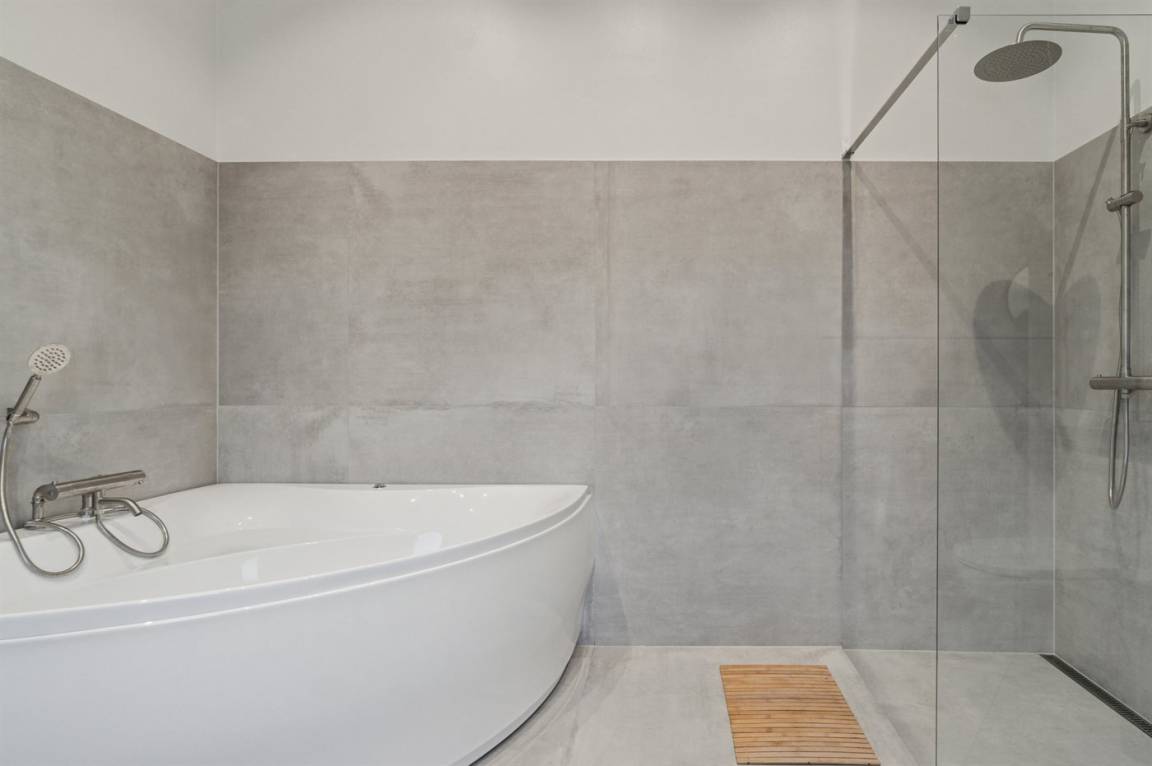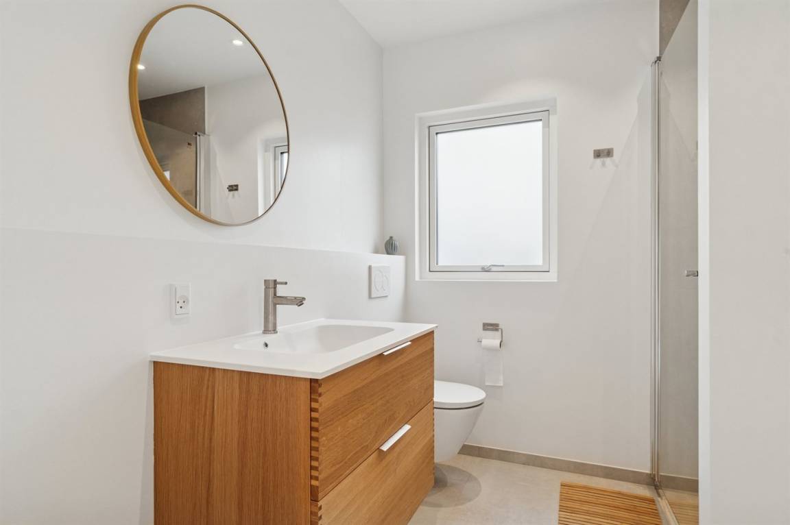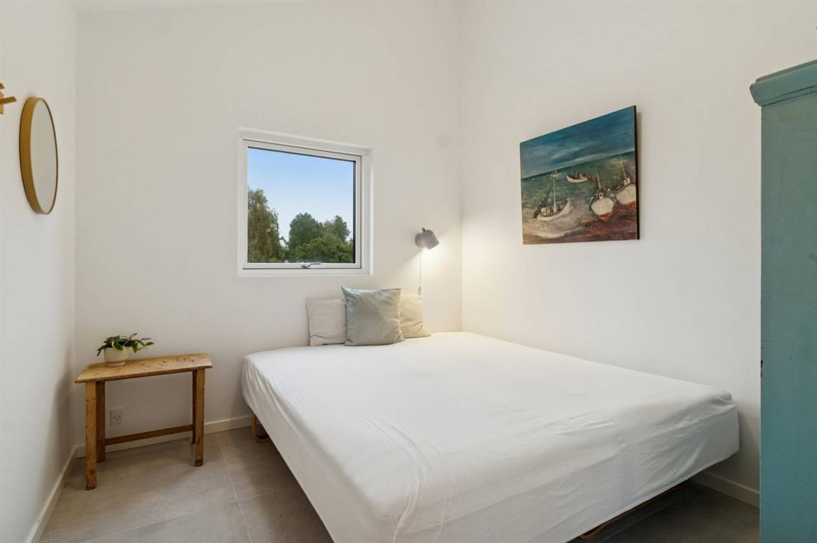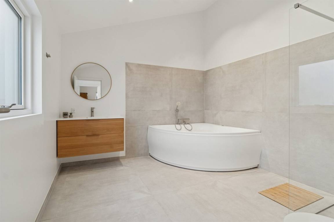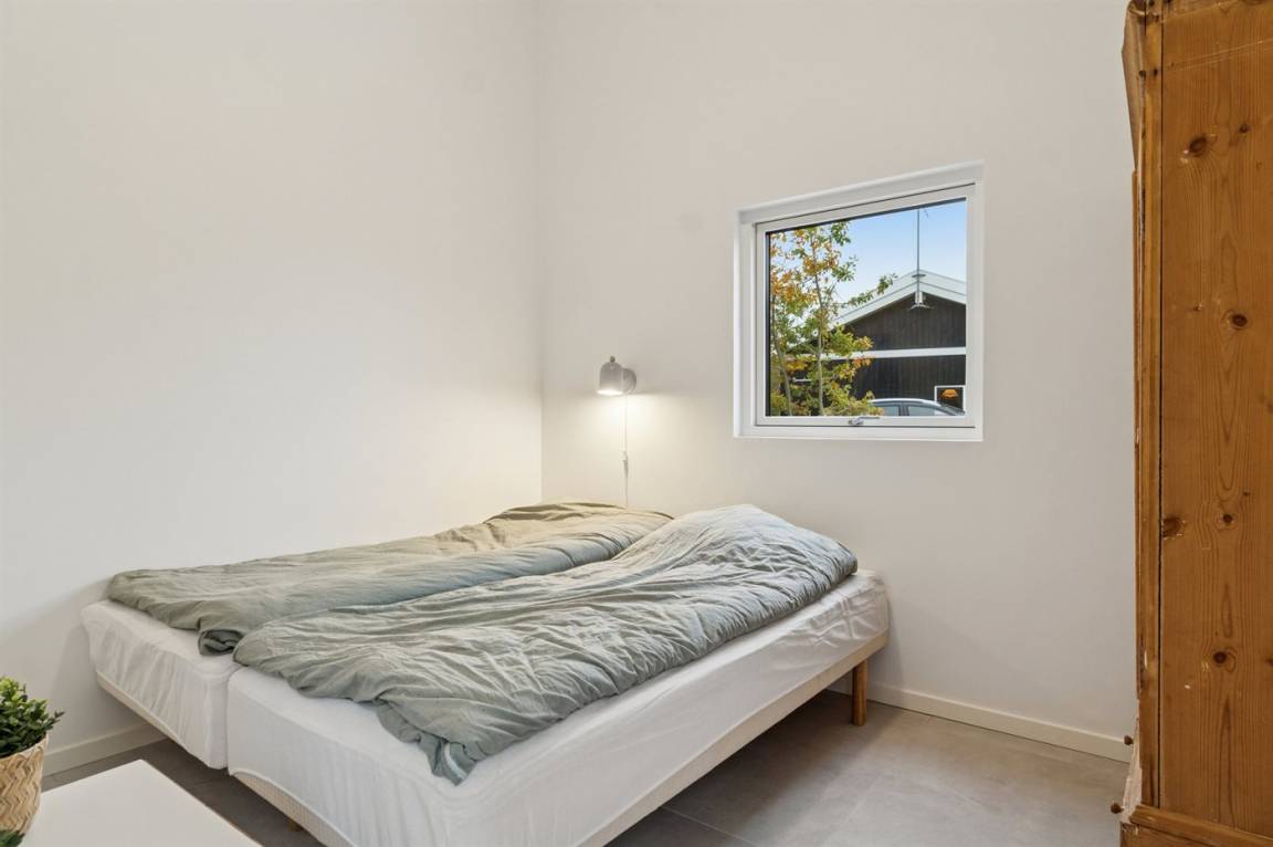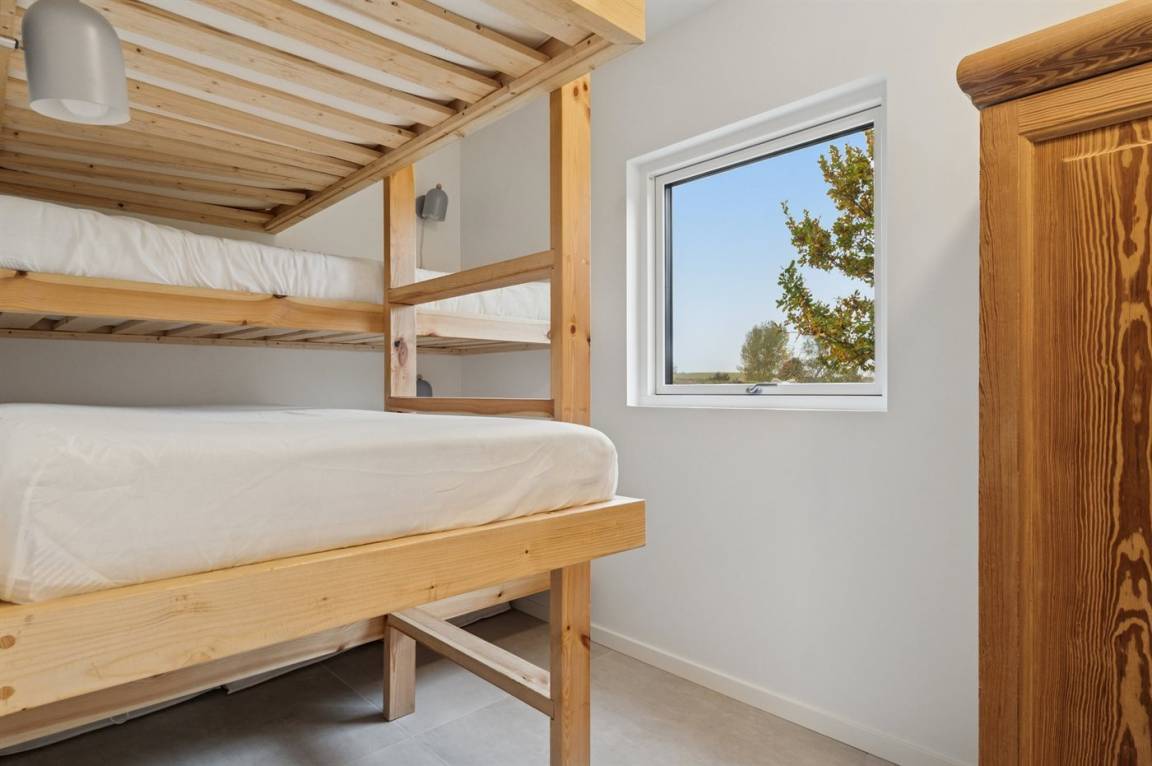 Das Haus verfügt über vier Schlafzimmer und zwei Badezimmer in denselben warmen Materialien. Eines davon ist sowohl mit Whirlpool als auch mit Duschnische ausgestattet. Alles tritt hell und funktional hervor – mit Platz für bis zu 10 Personen.