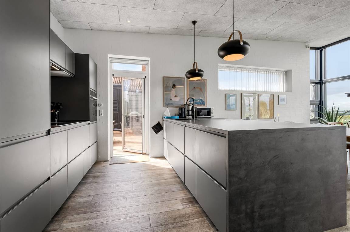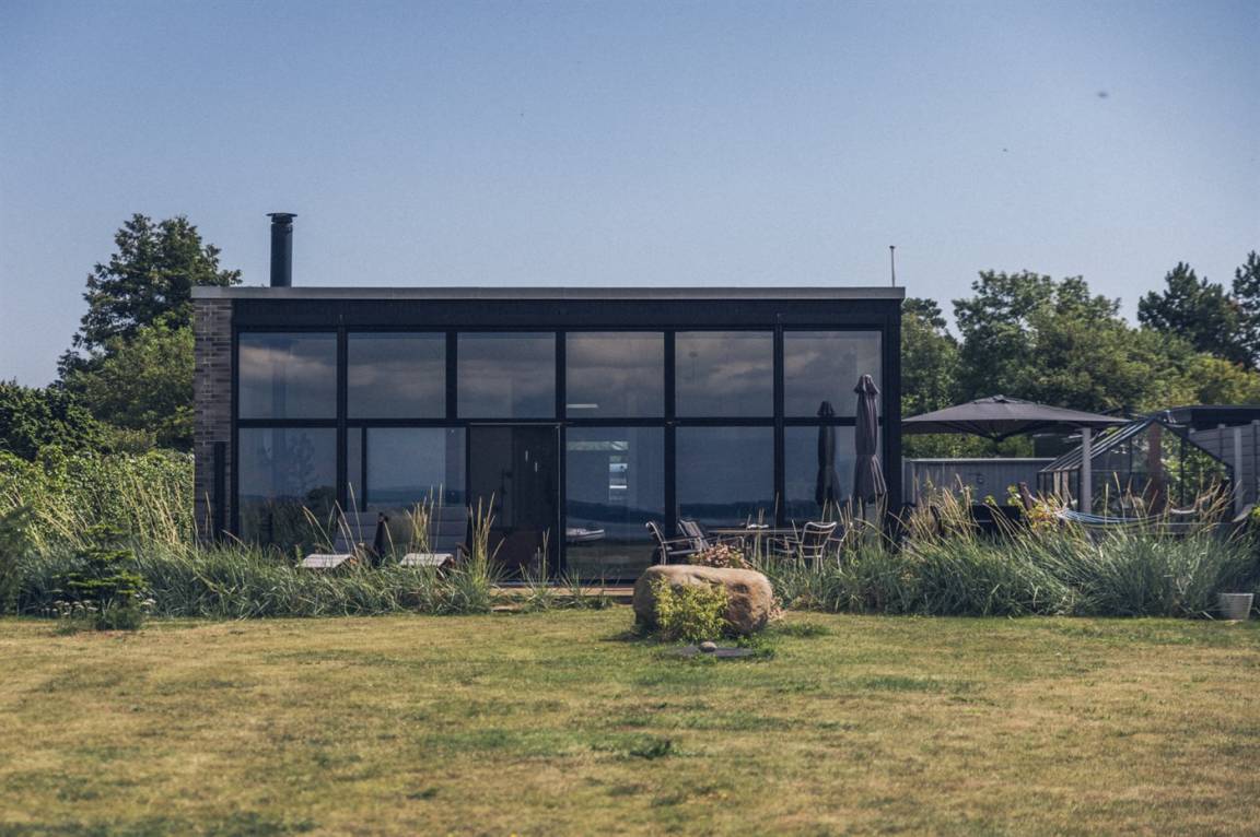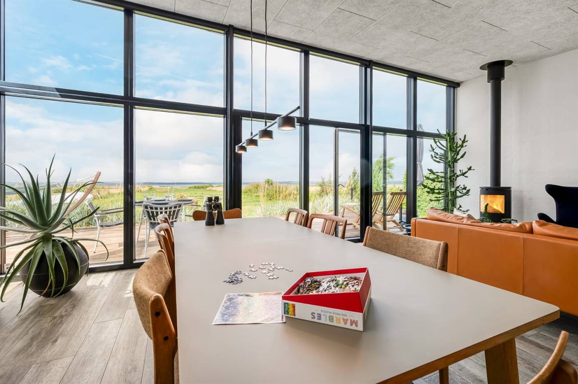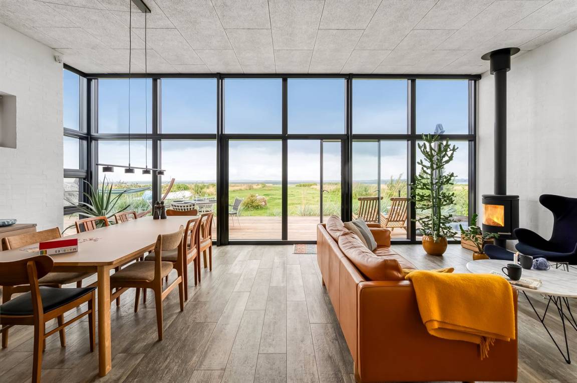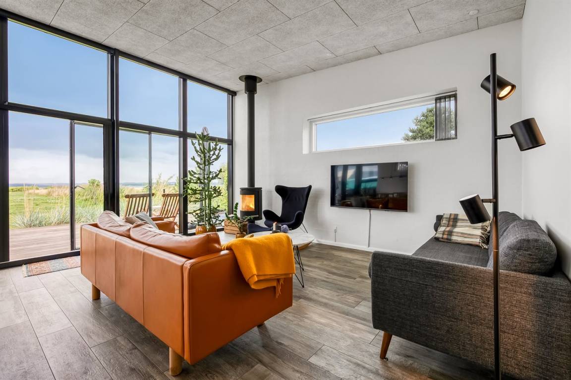 Innen sind Wohnzimmer und Küche in einem offenen, hellen Raum mit großen Fensterfronten vereint, sodass die Aussicht immer präsent ist. Wenn es kühl wird, sorgt der Kaminofen für Wärme und Gemütlichkeit, und das Haus ist generell so ausgestattet, dass du es das ganze Jahr über nutzen kannst – ohne dass dabei das einfache Ferienhausgefühl verloren geht.