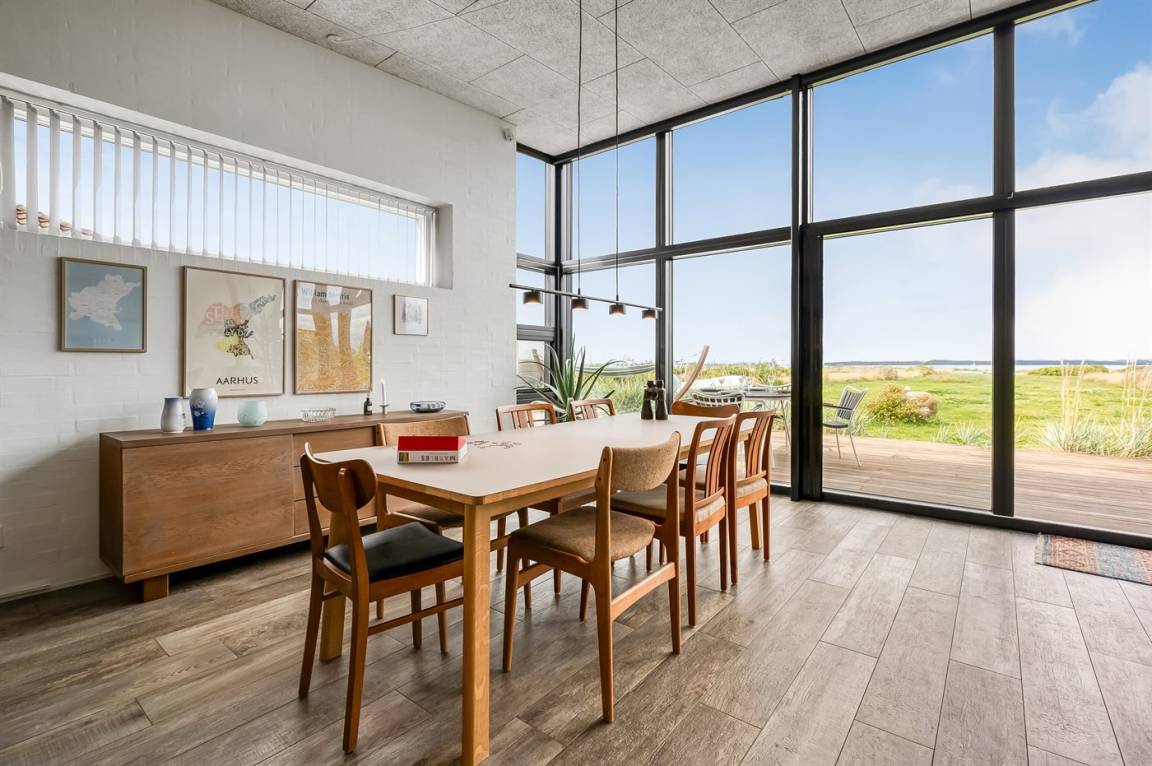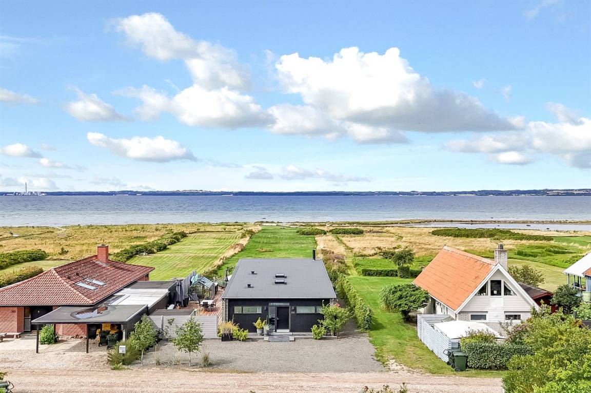 Hier wirst du in einem Ferienhaus in absolut erster Reihe – direkt an der Aarhus-Bucht und dem ruhigen Strand bei Vrinners willkommen geheißen.