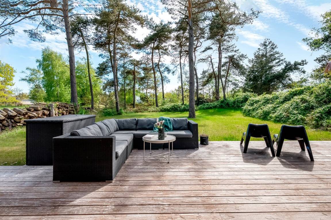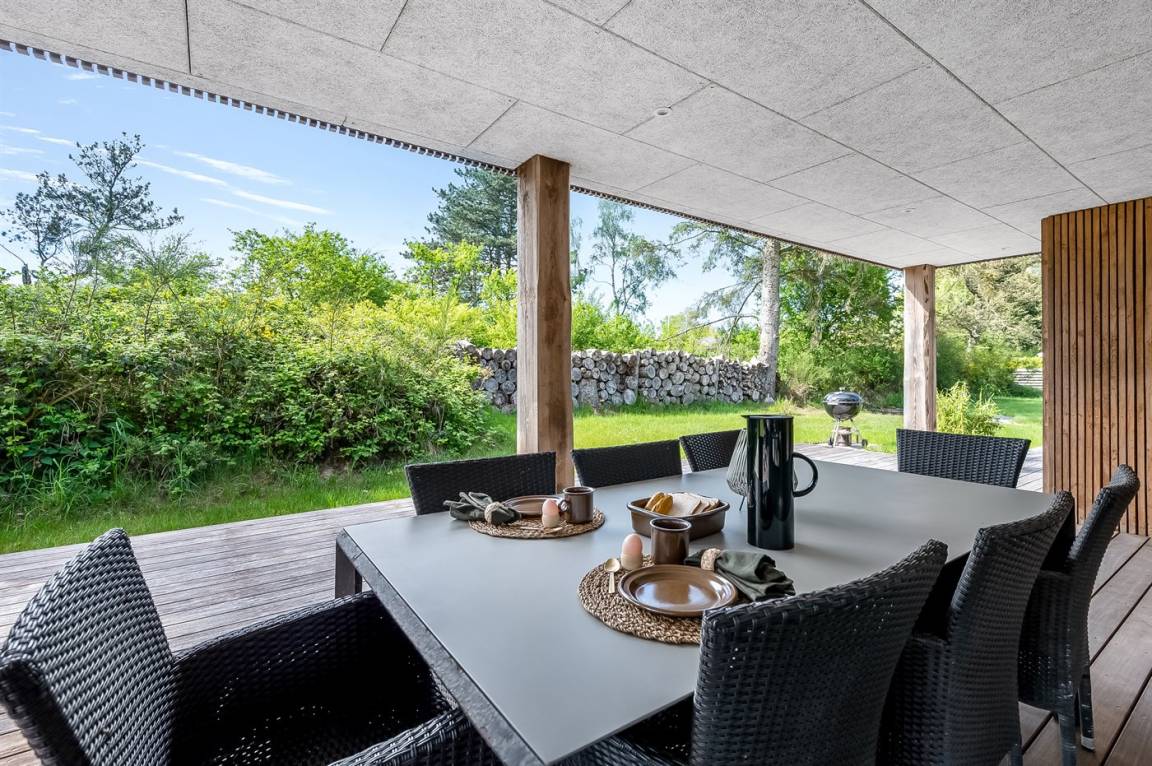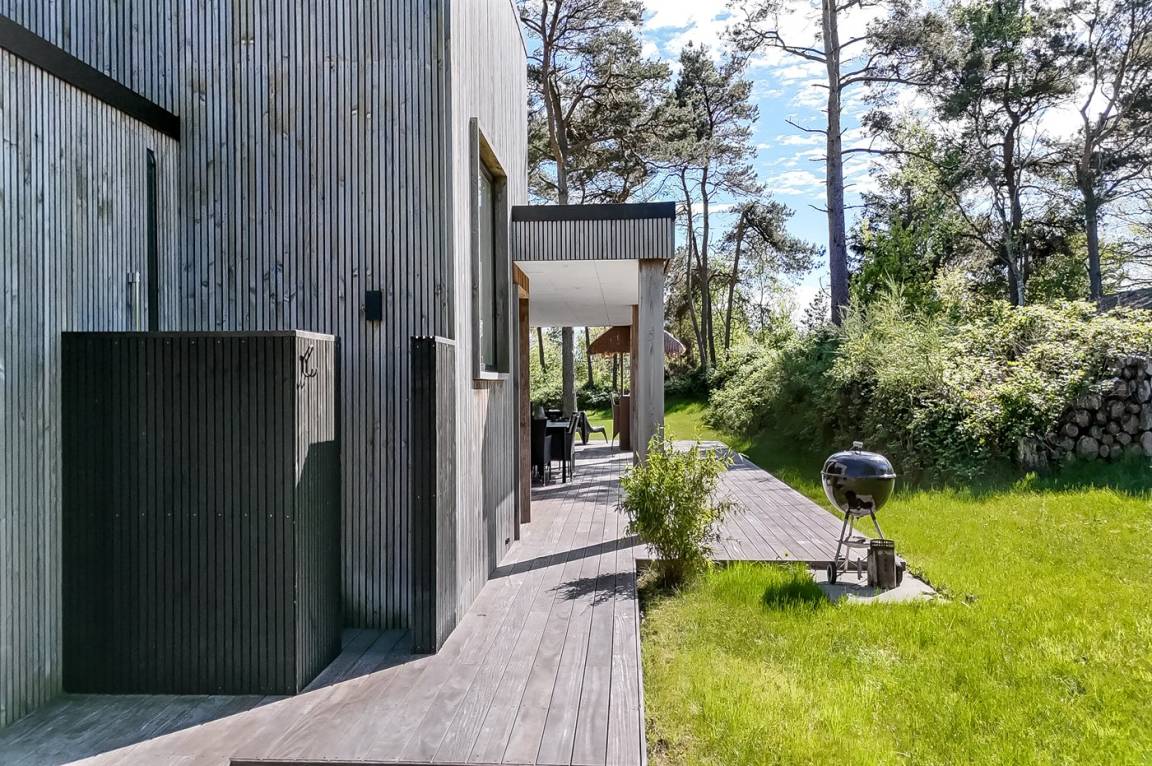 DraußenDie Ferienunterkunft liegt auf einem 2000 m² großen Naturgrundstück. Die Entfernung zum Meer beträgt 150 m. Die nächste Einkaufsmöglichkeit liegt 4000 m entfernt. Es steht ein 170 m² Terrassenareal zur Verfügung. Außerdem gibt es 60 m² überdachte Terrasse. Trampolin. Außendusche. Es steht ein Carport zur Verfügung. Parkplatz auf dem Grundstück.