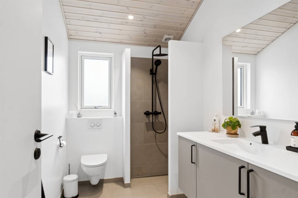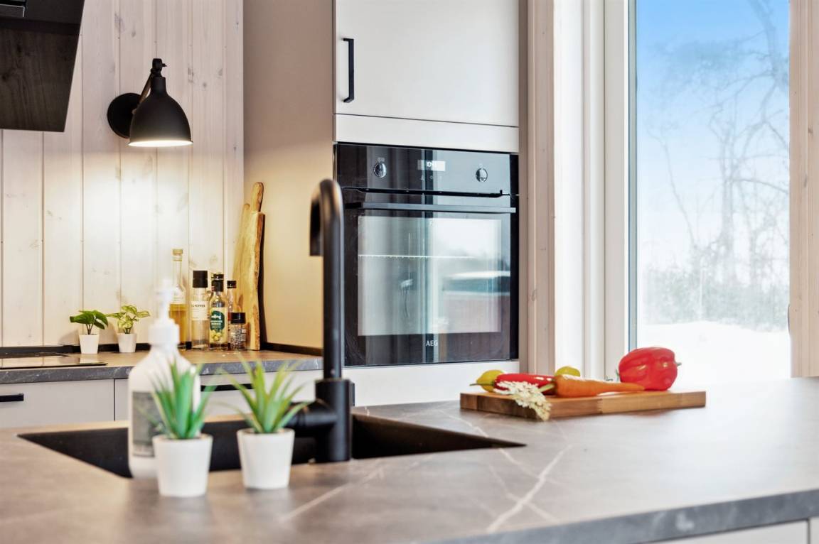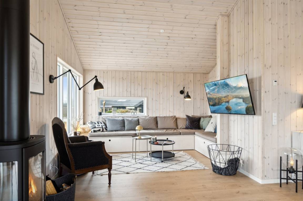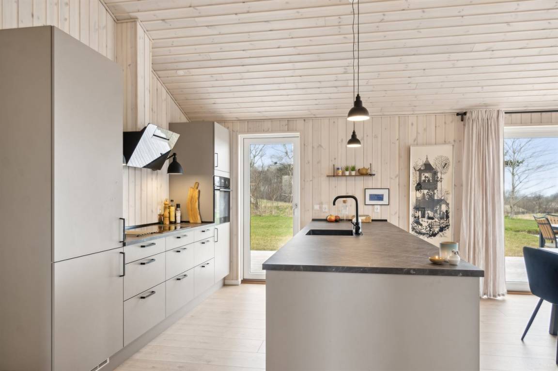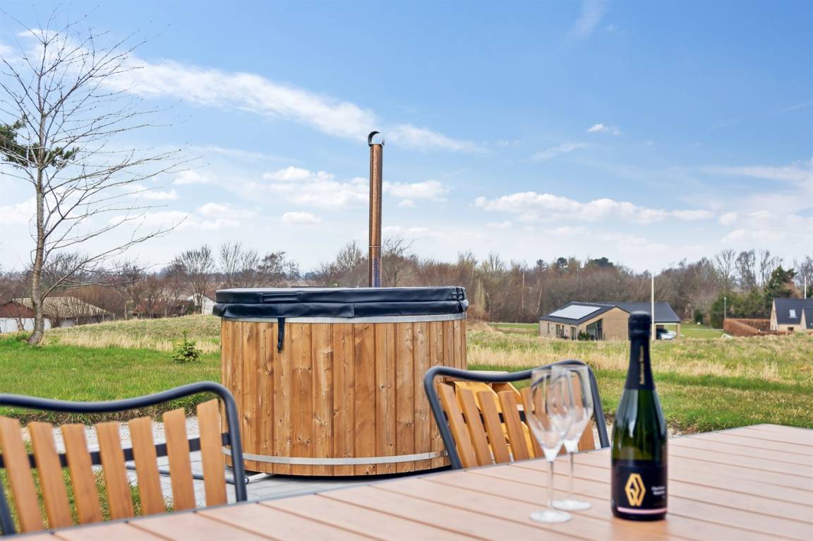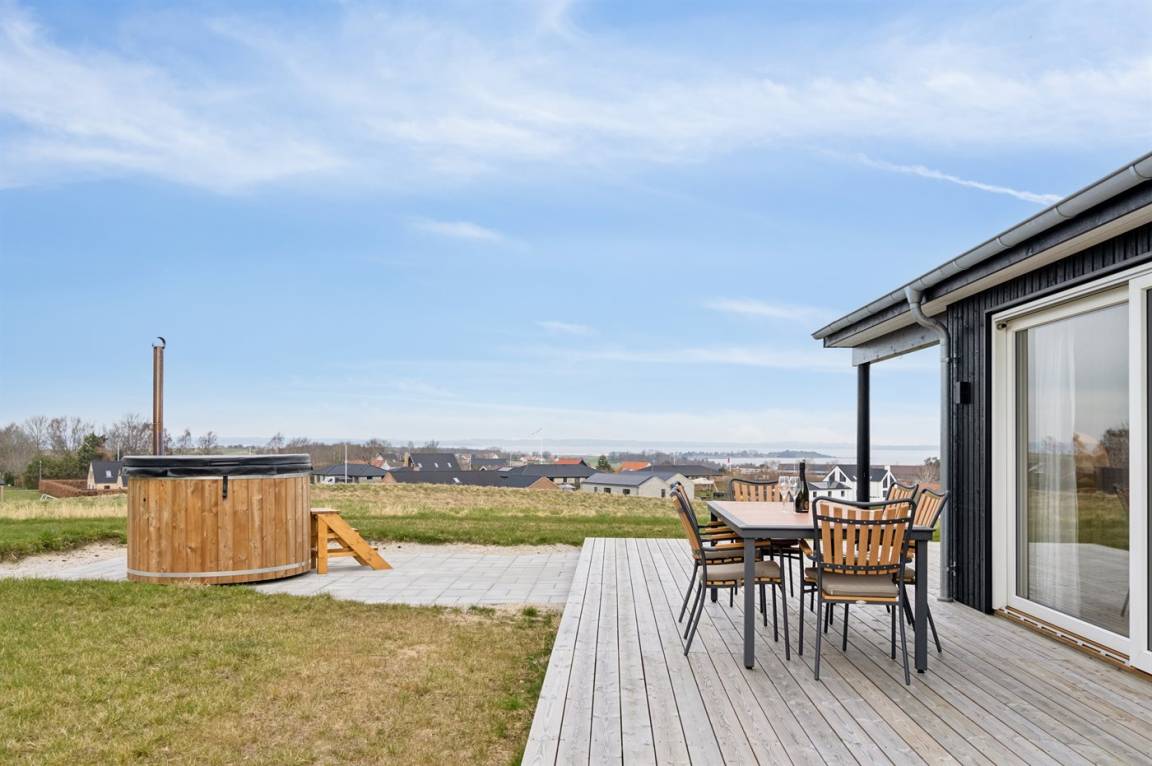 Das Ferienhaus ist wirklich gut gestaltet und hat einen durchdachten Grundriss, der gut zu einer Familie oder auch zu Reisenden mit Großeltern passt. Das Ferienhaus ist sehr modern, unter anderem mit einer großen, schönen Küche, die mit dem Wohnzimmer kombiniert ist. Von hier aus bietet sich durch die vielen Fenster ein herrlicher Blick über das Gebiet mit dem Meer im Hintergrund. Von der guten Terrasse, die praktisch das ganze Haus umgibt, kann man die feine Aussicht ebenfalls in vollen Zügen genießen. Die ganze Familie kann sich im Whirlpool entspannen, der perfekt auf der großen Terrasse platziert ist - auch von hier aus hat man einen Blick auf das Meer.