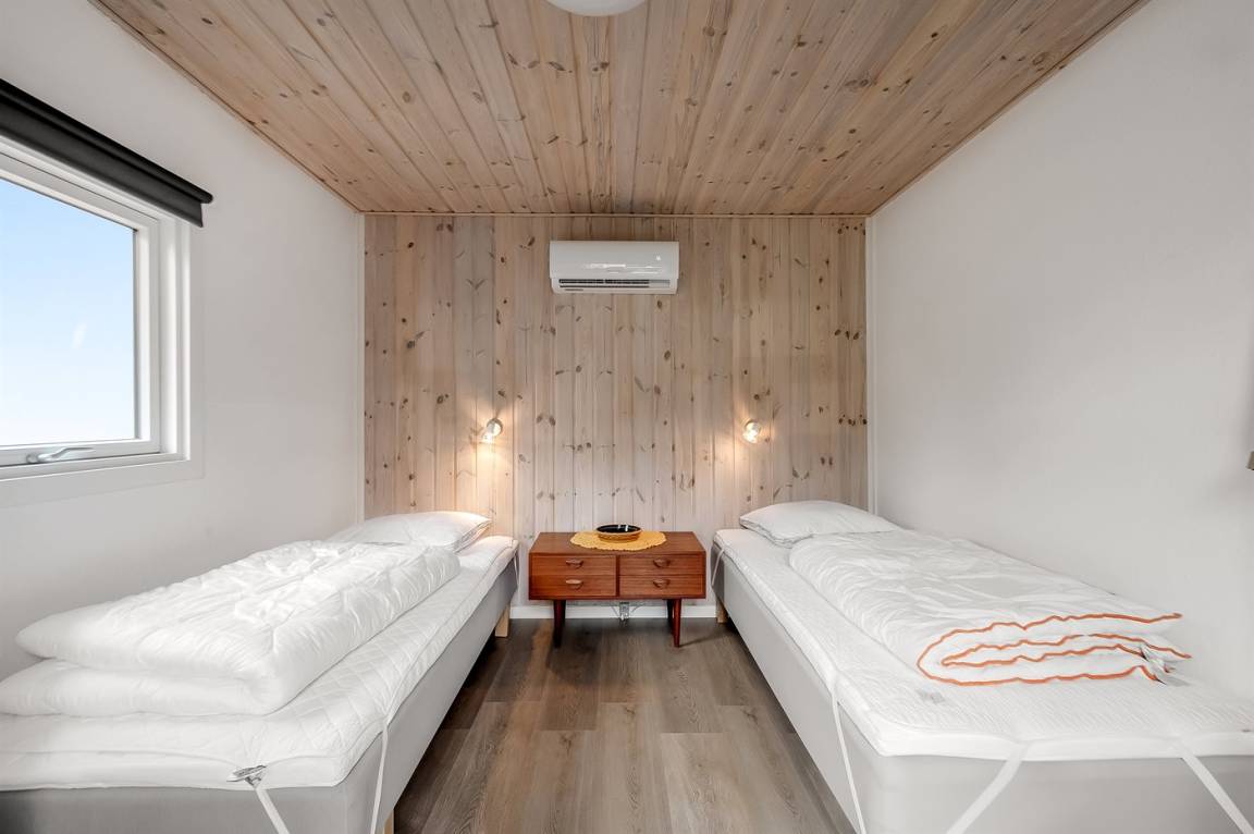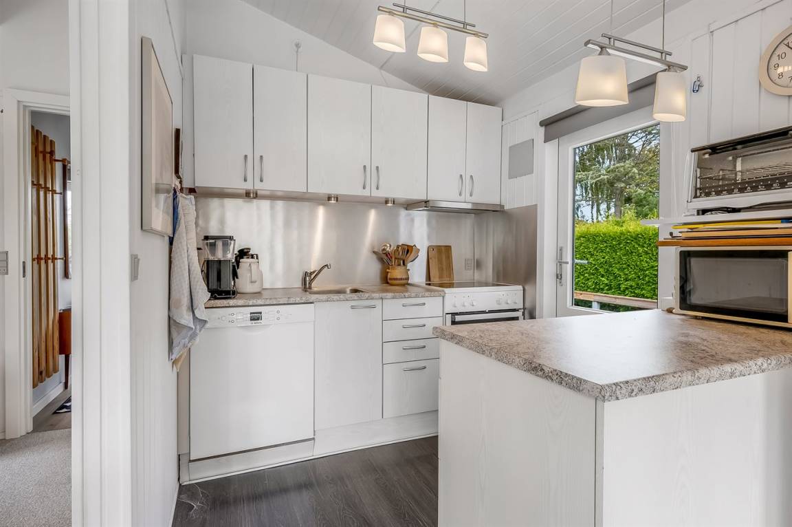 Das Haus bietet dir 60 helle und gut genutzte Quadratmeter mit zwei Schlafzimmern, einem modernen Badezimmer mit Fußbodenheizung sowie eine offene und funktionelle Küche, die direkt in das einladende Wohnzimmer mit Decken bis zum First und große Fensterfronten übergeht. Vom Esstisch aus hast du Meerblick – das macht jede Mahlzeit zu etwas ganz Besonderem.