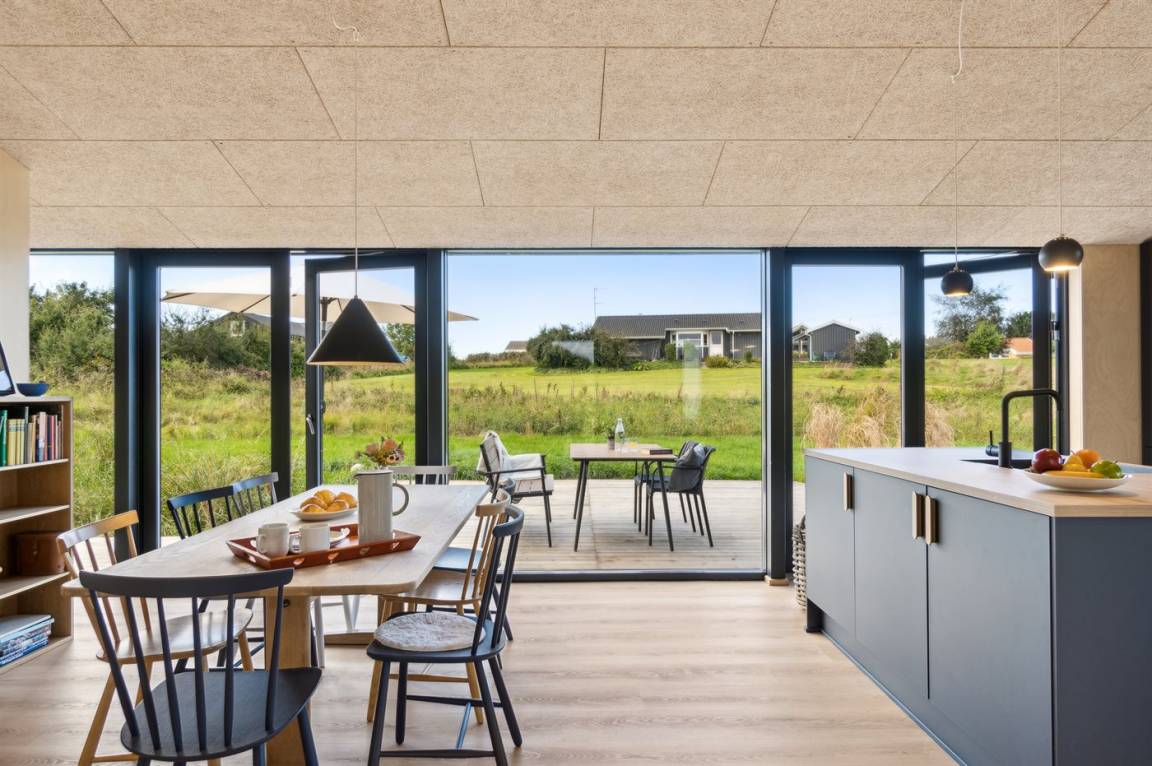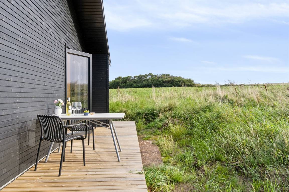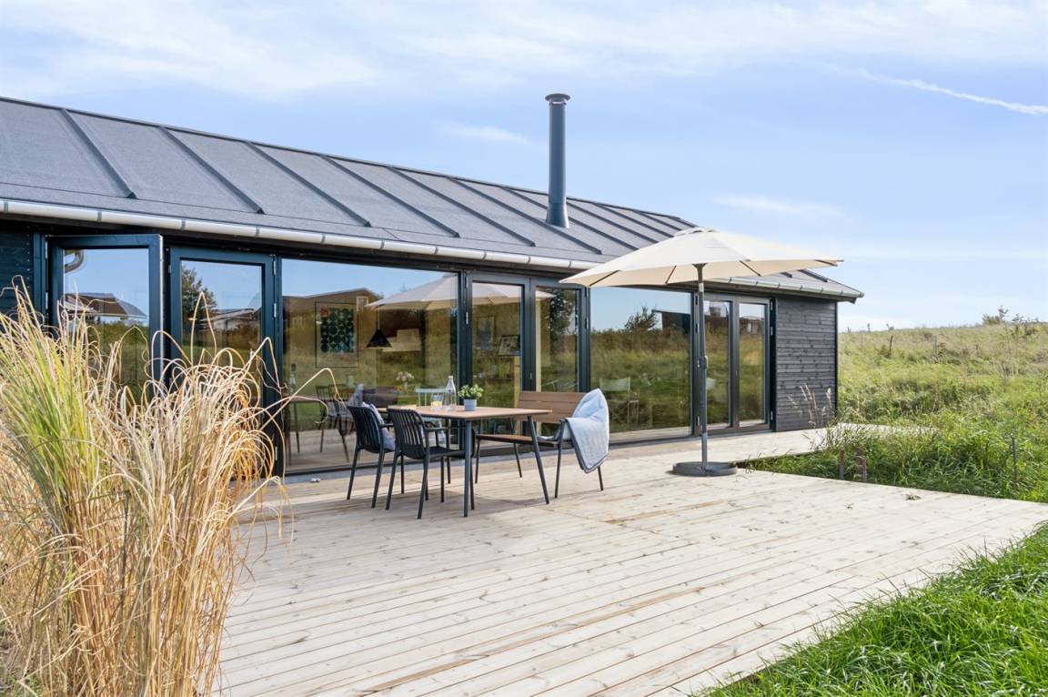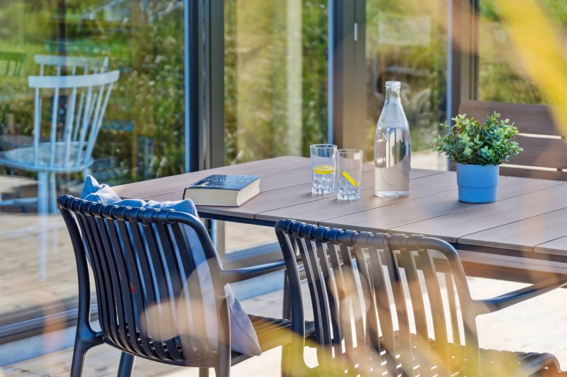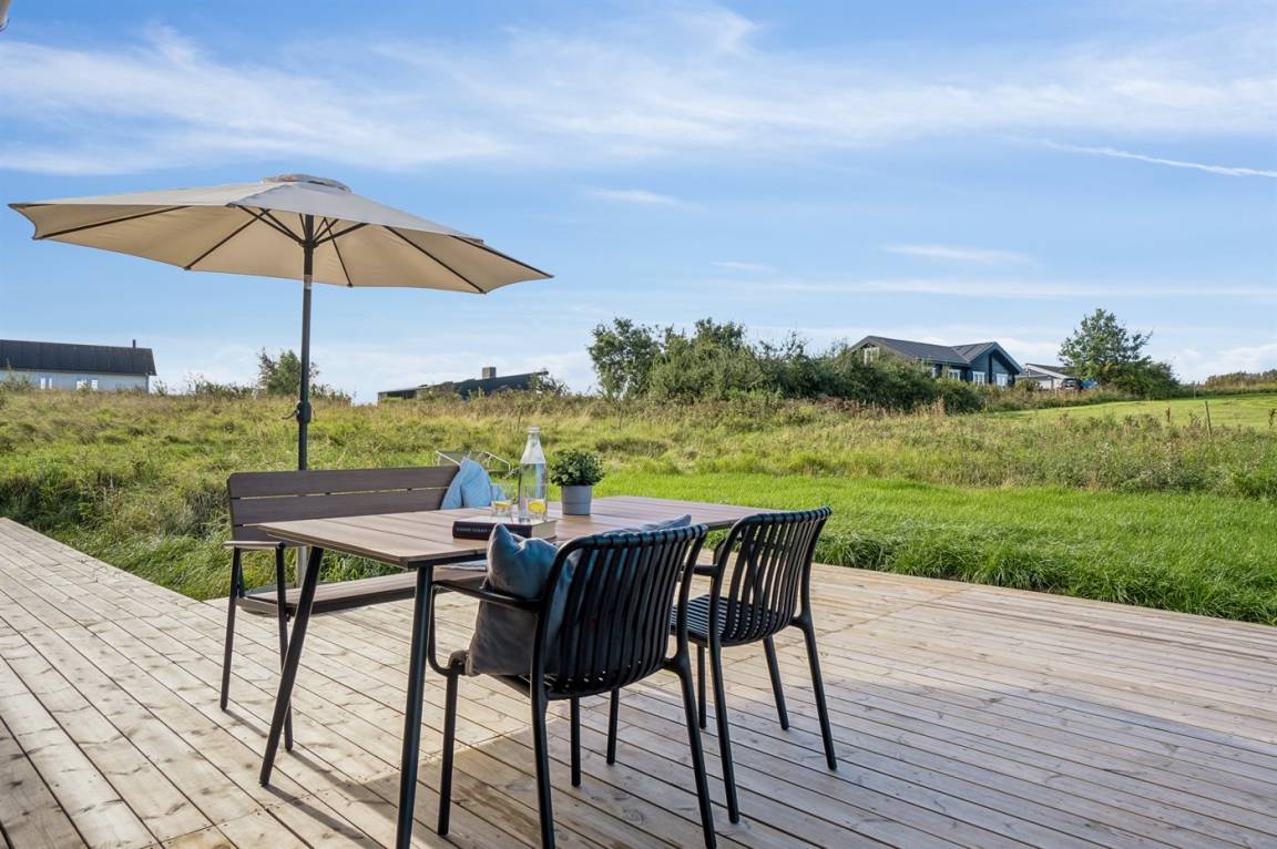 Das Ferienhaus ist durchdacht aufgeteilt und präsentiert sich genau so, wie man es von einem neu gebauten Ferienhaus erwartet. Der Mittelpunkt des Hauses ist die große und einladende Wohnküche mit integriertem Wohnzimmer, wo viel Platz ist – ein idealer Ort, um die Familie zu versammeln. Von hier hat man direkten Zugang zur schönen Terrasse, die das ganze Haus umgibt und es leicht macht, eine geschützte Ecke zu finden, um die Sonne zu genießen. Von der Terrasse hat man einen guten Blick auf den Garten, wo die Kinder spielen können, während die Erwachsenen eine Tasse Kaffee oder ein Glas Wein genießen.