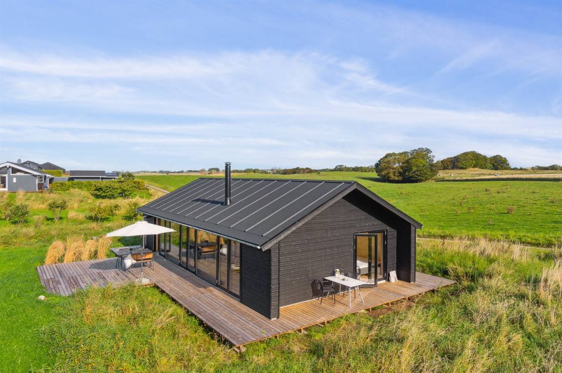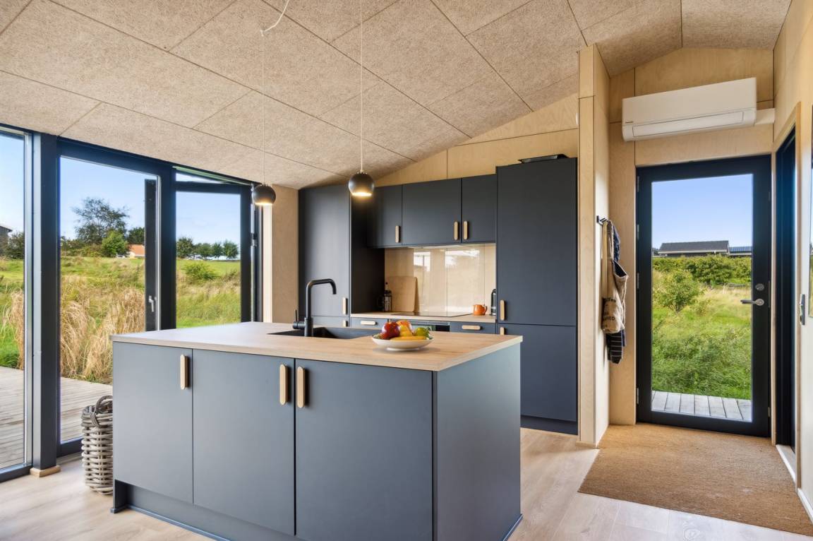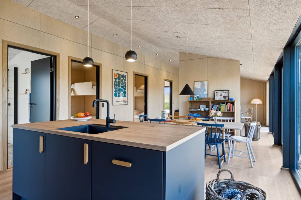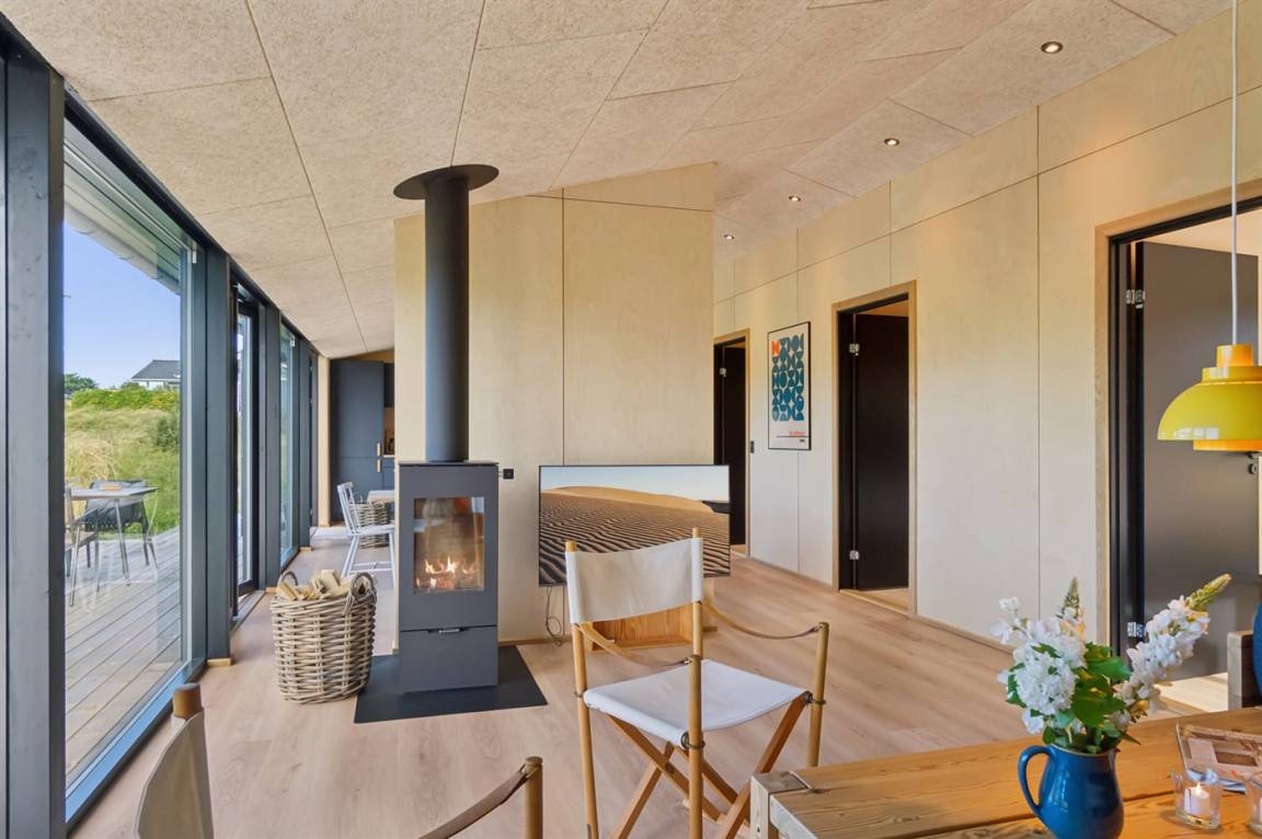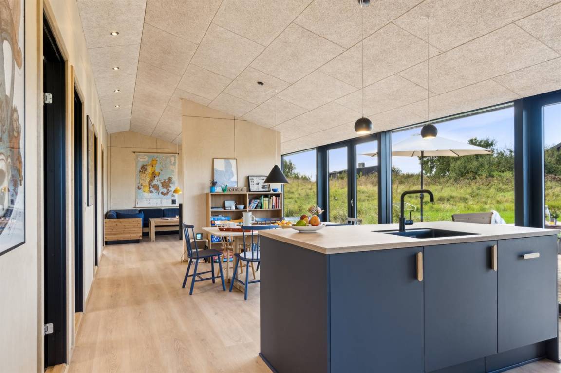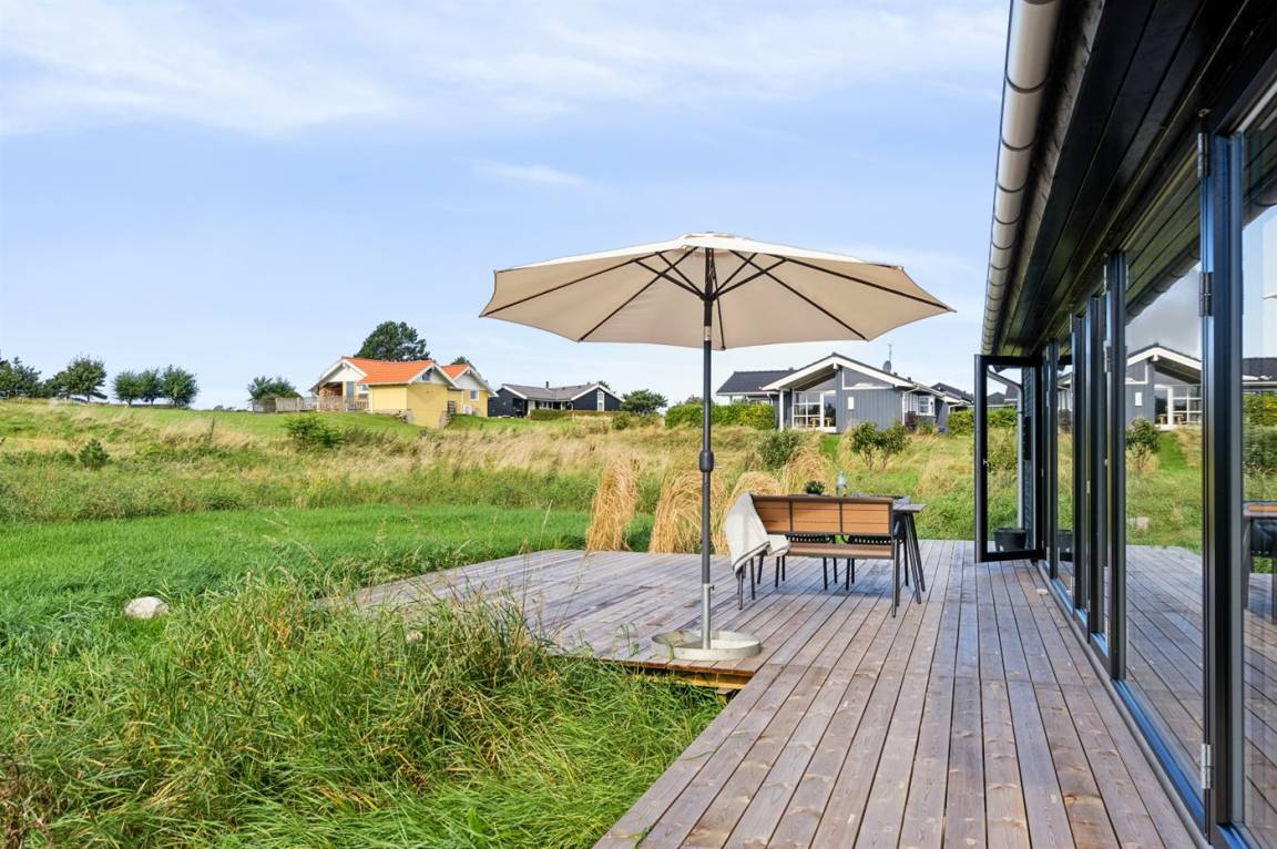 Das Ferienhaus ist durchdacht aufgeteilt und präsentiert sich genau so, wie man es von einem neu gebauten Ferienhaus erwartet. Der Mittelpunkt des Hauses ist die große und einladende Wohnküche mit integriertem Wohnzimmer, wo viel Platz ist – ein idealer Ort, um die Familie zu versammeln. Von hier hat man direkten Zugang zur schönen Terrasse, die das ganze Haus umgibt und es leicht macht, eine geschützte Ecke zu finden, um die Sonne zu genießen. Von der Terrasse hat man einen guten Blick auf den Garten, wo die Kinder spielen können, während die Erwachsenen eine Tasse Kaffee oder ein Glas Wein genießen.