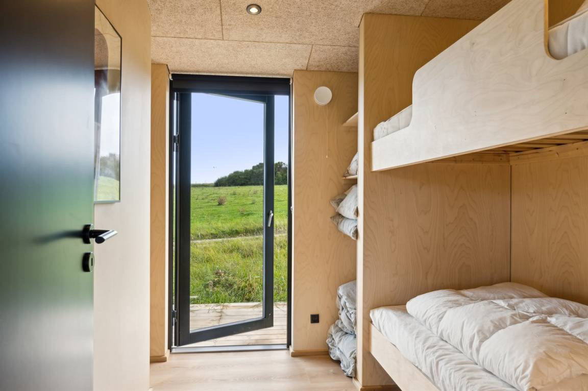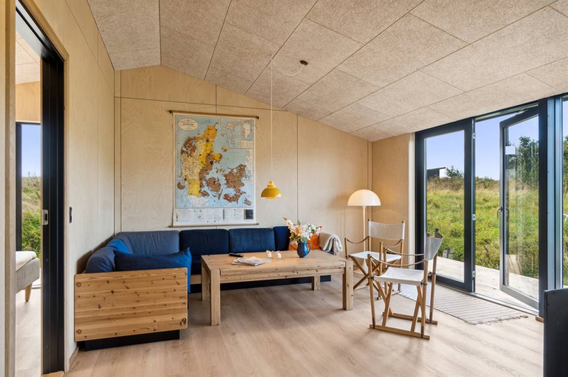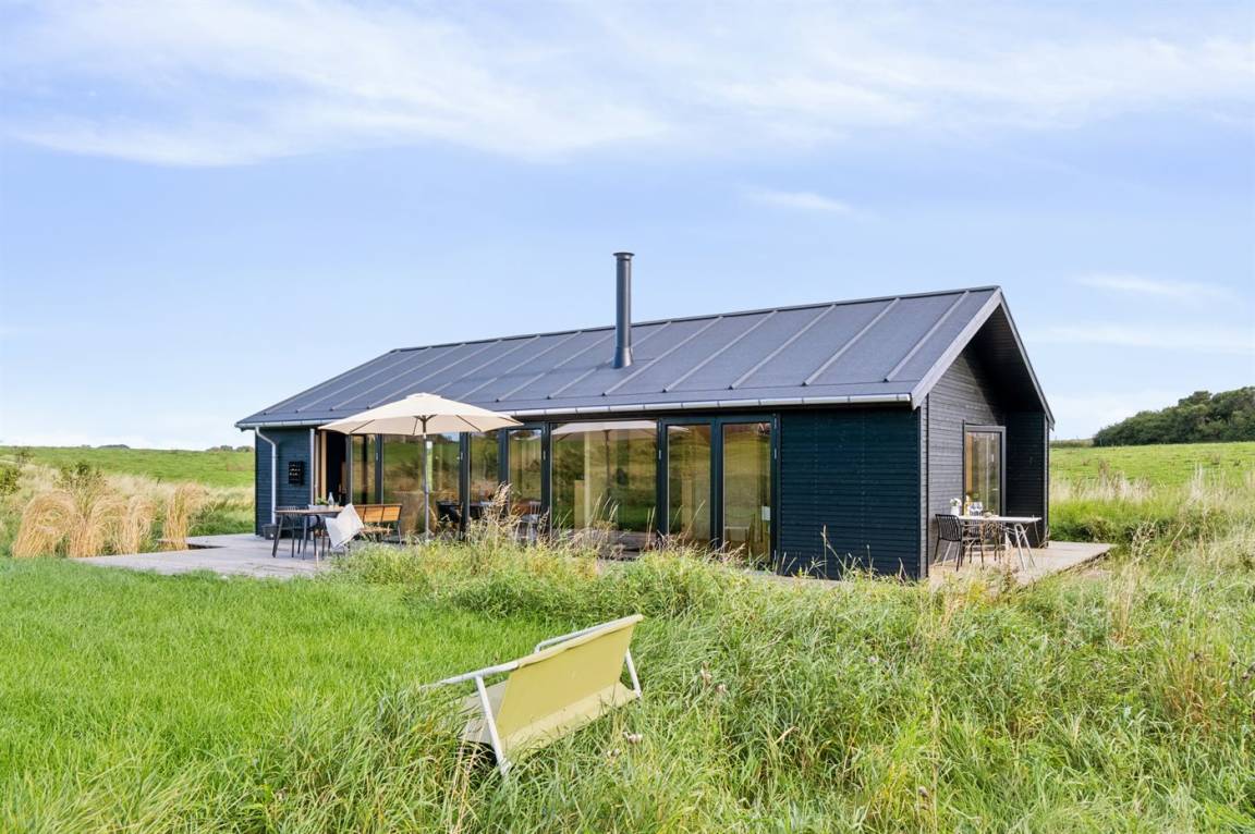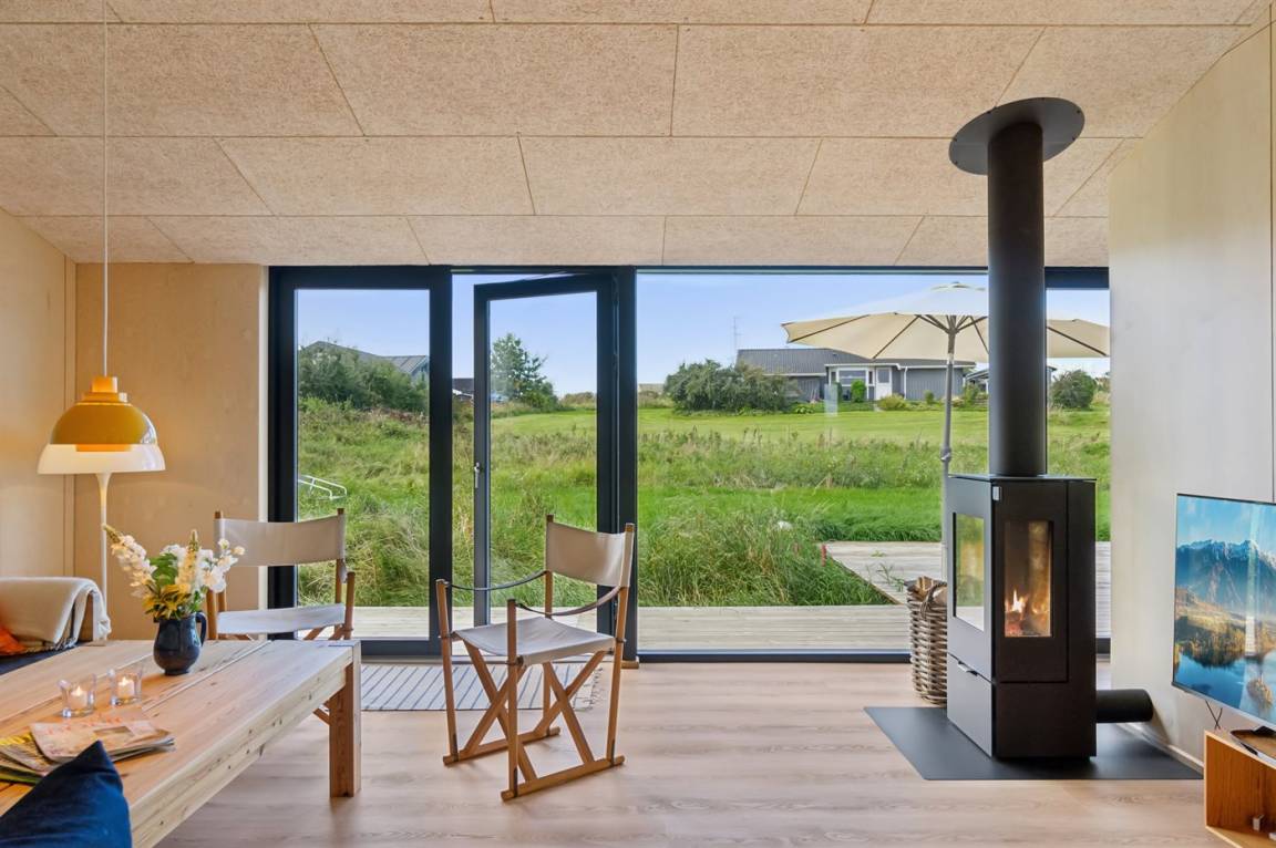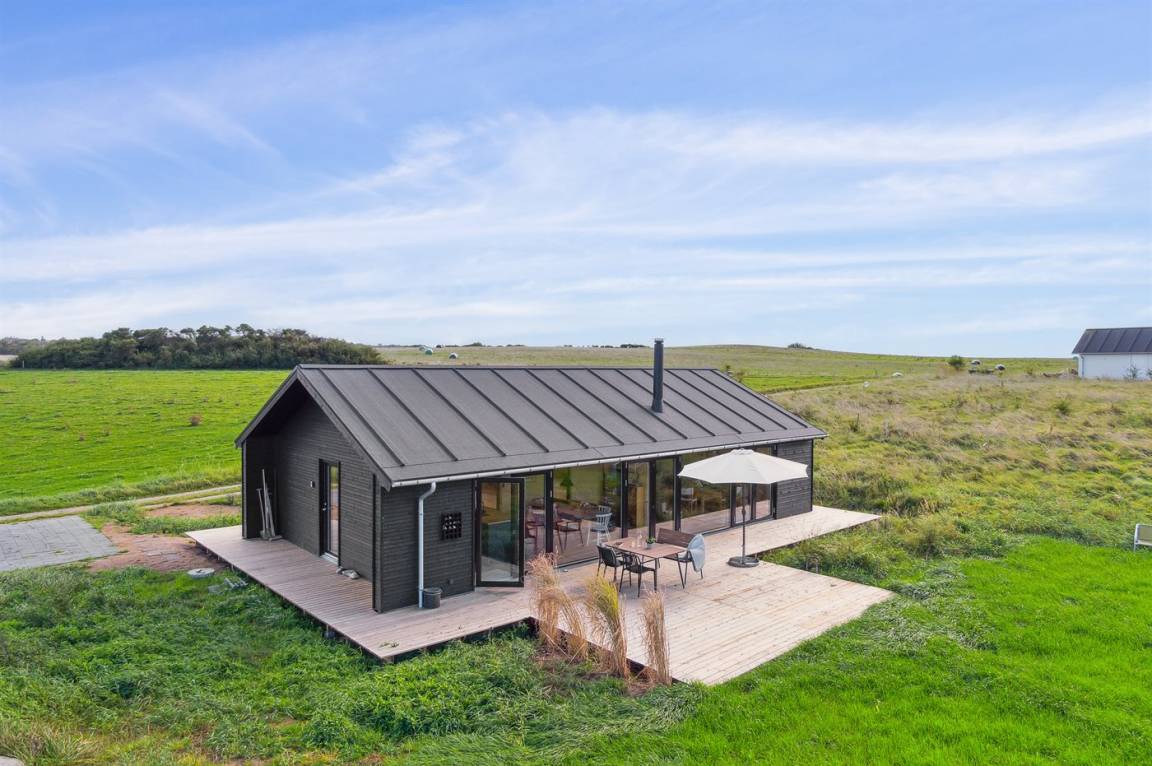 Das Ferienhaus ist durchdacht aufgeteilt und präsentiert sich genau so, wie man es von einem neu gebauten Ferienhaus erwartet. Der Mittelpunkt des Hauses ist die große und einladende Wohnküche mit integriertem Wohnzimmer, wo viel Platz ist – ein idealer Ort, um die Familie zu versammeln. Von hier hat man direkten Zugang zur schönen Terrasse, die das ganze Haus umgibt und es leicht macht, eine geschützte Ecke zu finden, um die Sonne zu genießen. Von der Terrasse hat man einen guten Blick auf den Garten, wo die Kinder spielen können, während die Erwachsenen eine Tasse Kaffee oder ein Glas Wein genießen.
