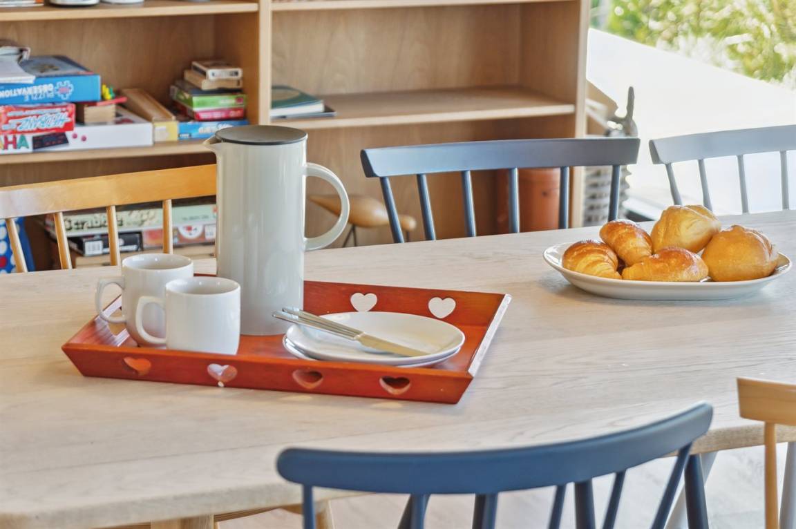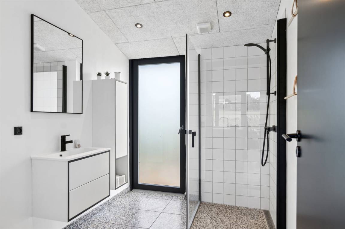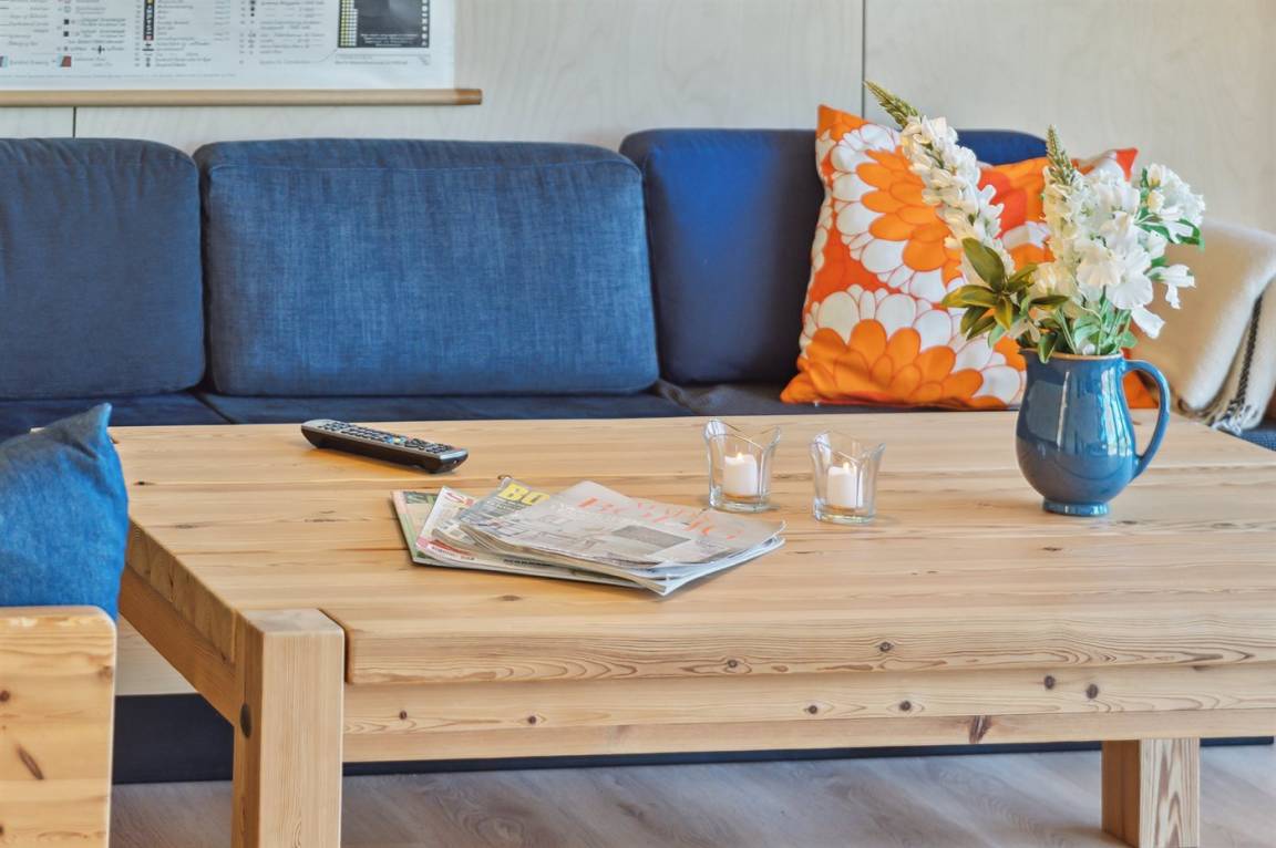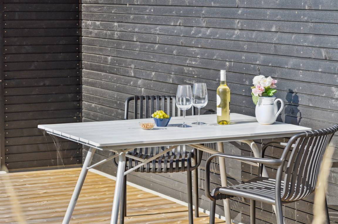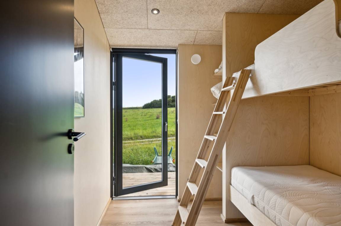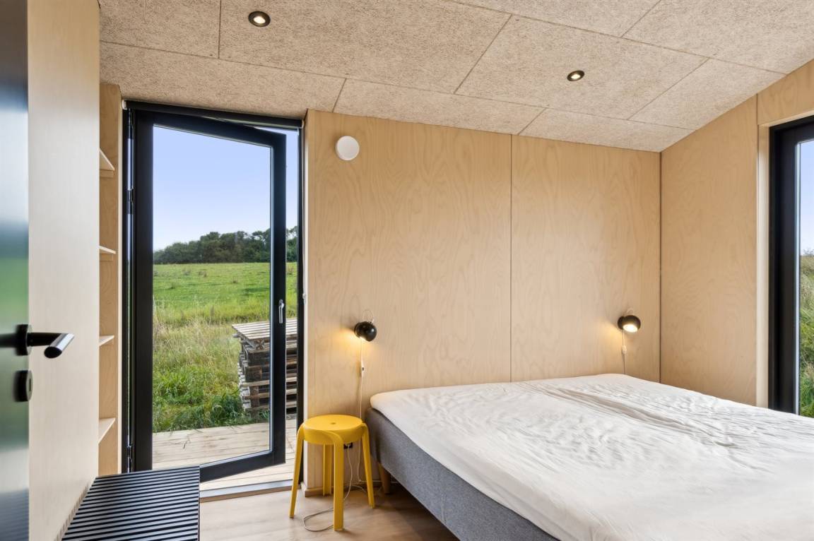 Das Ferienhaus ist durchdacht aufgeteilt und präsentiert sich genau so, wie man es von einem neu gebauten Ferienhaus erwartet. Der Mittelpunkt des Hauses ist die große und einladende Wohnküche mit integriertem Wohnzimmer, wo viel Platz ist – ein idealer Ort, um die Familie zu versammeln. Von hier hat man direkten Zugang zur schönen Terrasse, die das ganze Haus umgibt und es leicht macht, eine geschützte Ecke zu finden, um die Sonne zu genießen. Von der Terrasse hat man einen guten Blick auf den Garten, wo die Kinder spielen können, während die Erwachsenen eine Tasse Kaffee oder ein Glas Wein genießen.