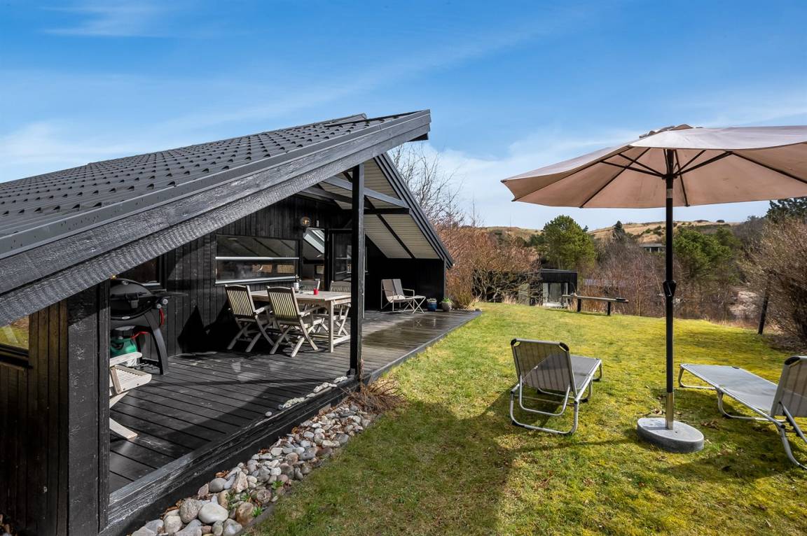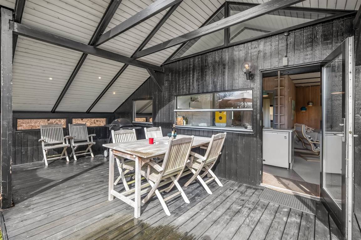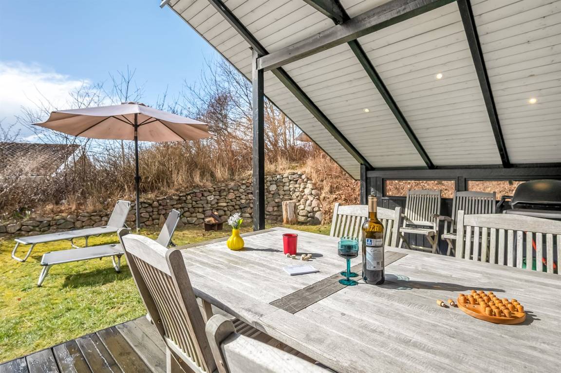 Zum Haus gehört eine gemütliche Terrasse mit Überdachung, auf der ihr windgeschützt sitzen und das Leben im Freien in ruhiger Umgebung genießen könnt. Hier ist Platz für die erste Kaffee am Morgen oder lange Sommerabende, an denen sich die Familie gemeinsam um den Tisch versammelt.