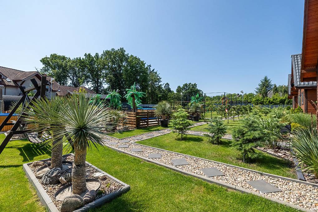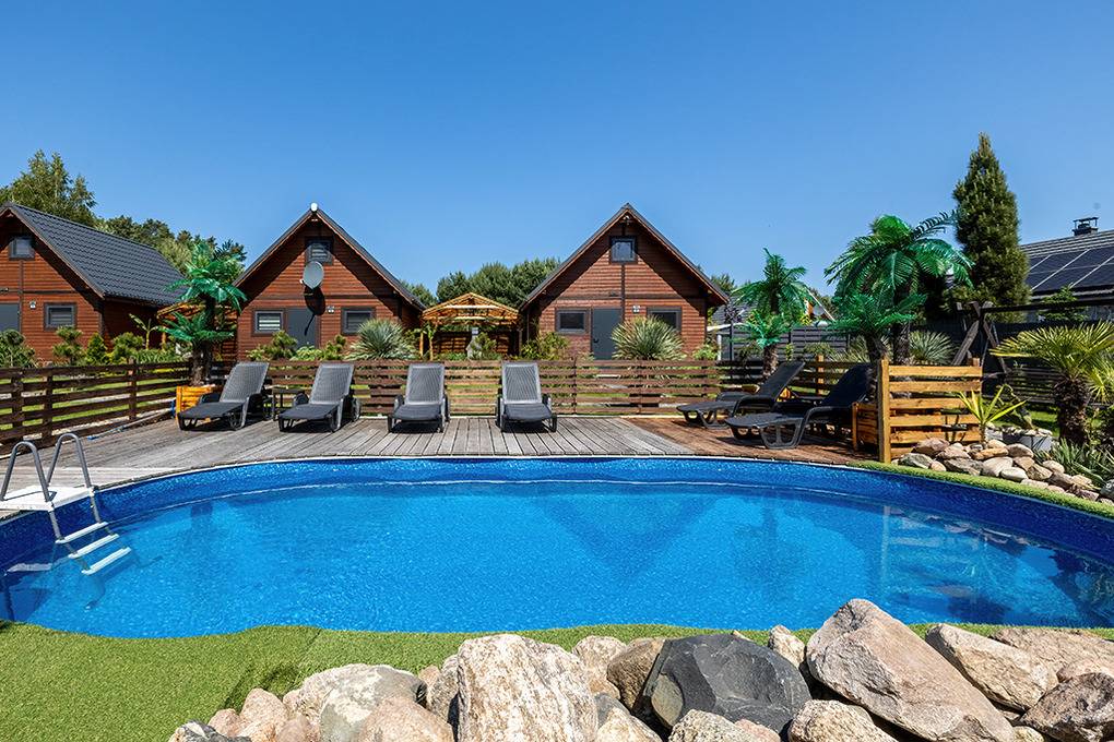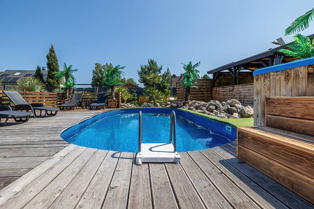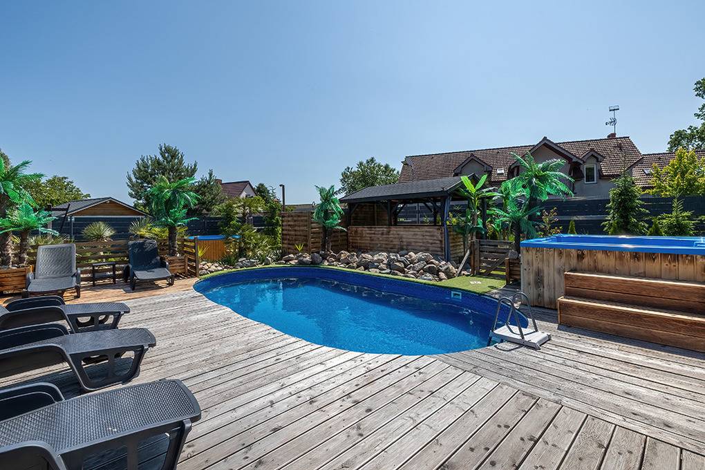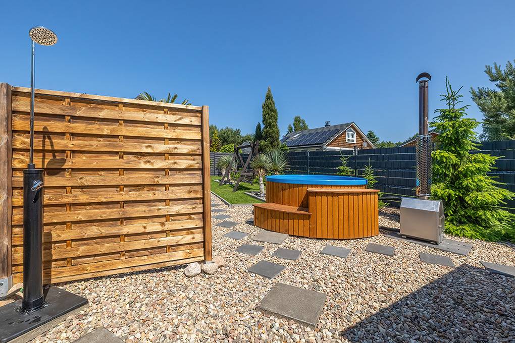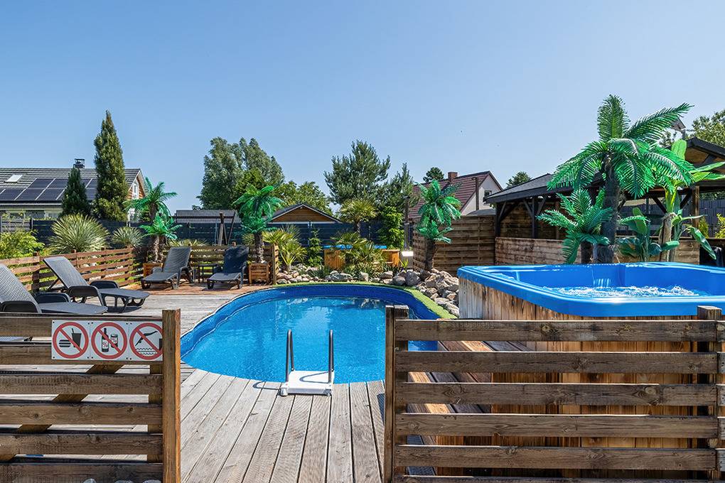 Haus: Drei sehr schöne, komfortable Ferienhäuser mit Sauna, Pool, Whirlpool, Hot Tub auf einem mit viel Liebe zum Detail begrüntem Grundstück, 2020 neu erbaut. Moderne Einrichtung mit gemütlichem Ambiente. Kostenloses Internet über WLan (LTE). Im Erdgeschoß Klimaanlage mit Heizfunktion, E-Radiatoren auf Wunsch, Warmwasser über Durchlauferhitzer. Große, überdachte Terrasse mit Sitzmöbeln, gemauertem Grill, Blick auf den Garten: gemeinschaftliches Sauna-Häuschen, Hot Tub, Whirlpool (Gebühr), Pool mit Liegen, Außendusche, Hollywoodschaukel, Holz Pavillon mit Kicker Tisch, Billard. Kinderspielplatz mit Sandkasten, Schwingbrücke, Schaukeln, Wippe, Rutsche, Trampolin. Kleiner Fußball Platz, Volleyball Feld.1 Pkw-Stellplätze/Haus im Mietpreis inklusiv. Hinweis: Die maximale Personenzahl darf 6 nicht überschreiten.