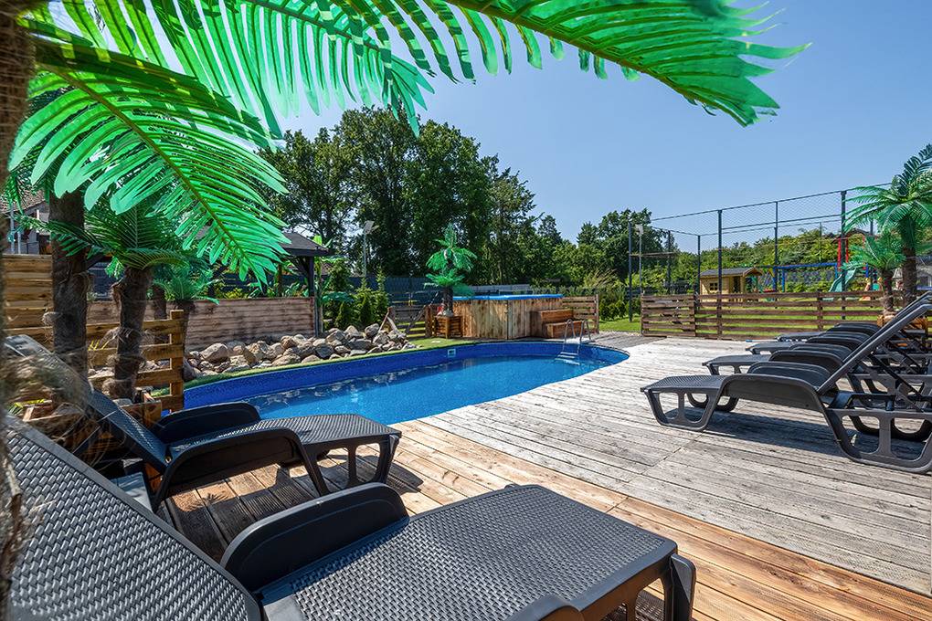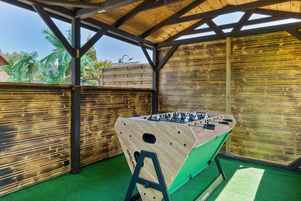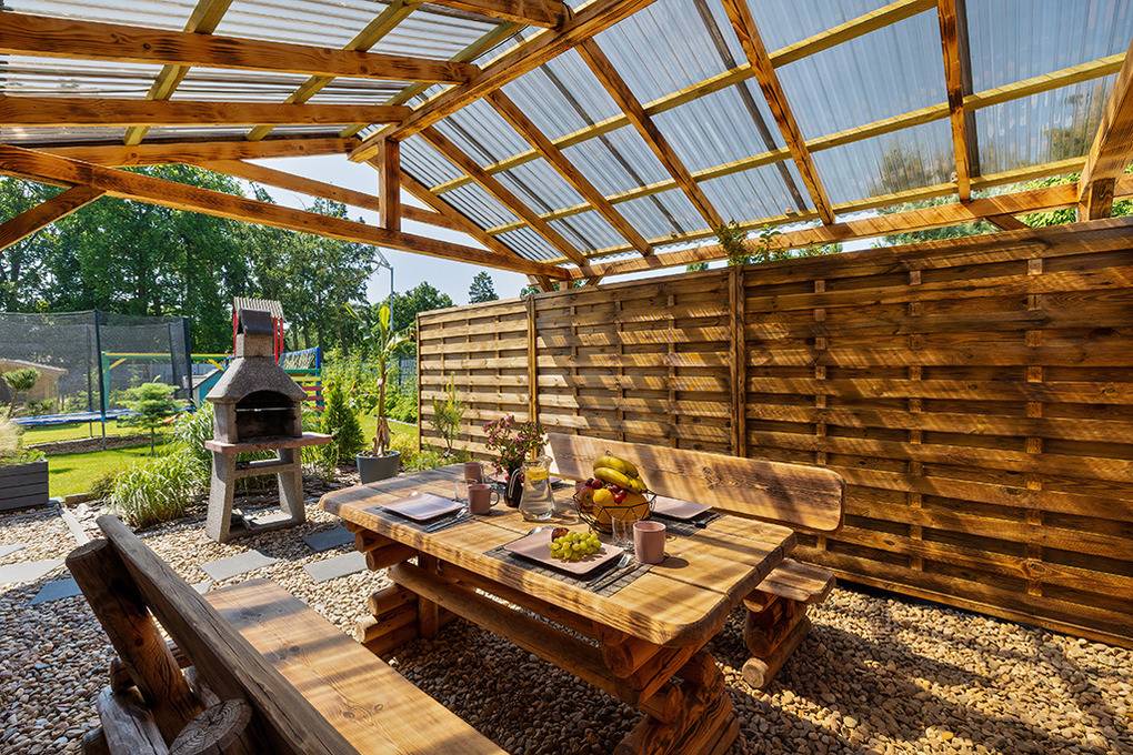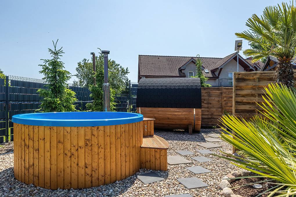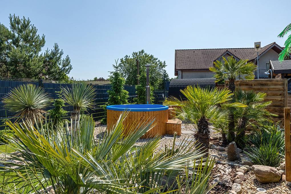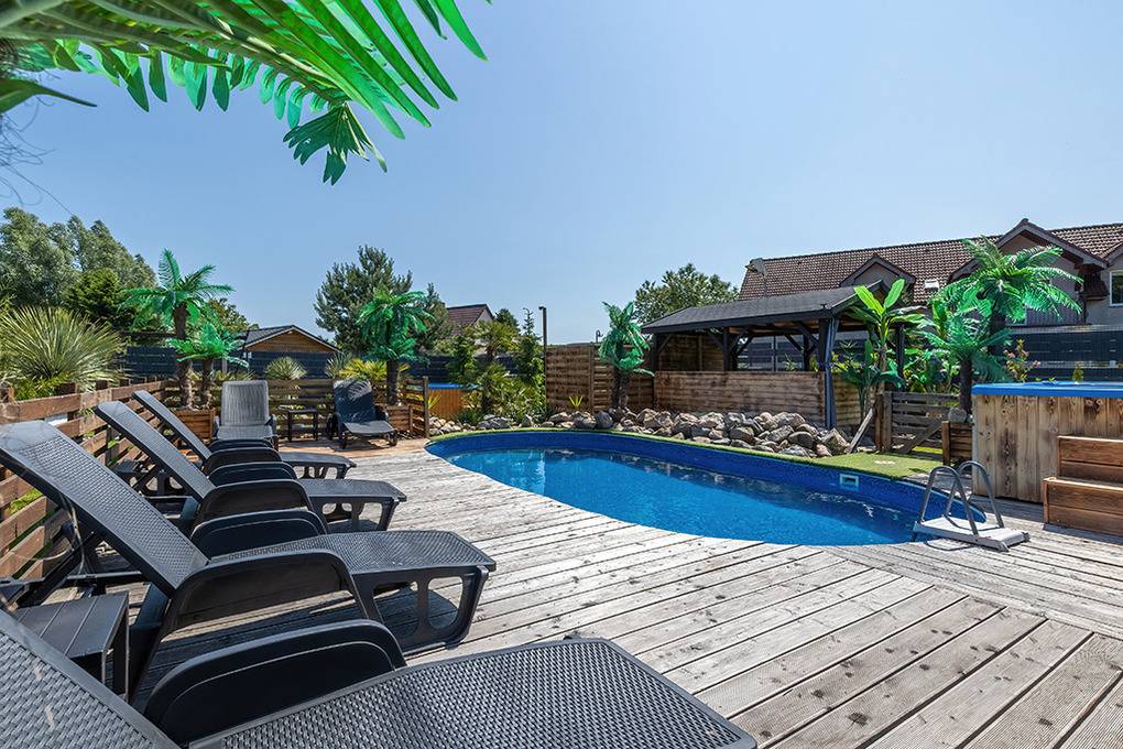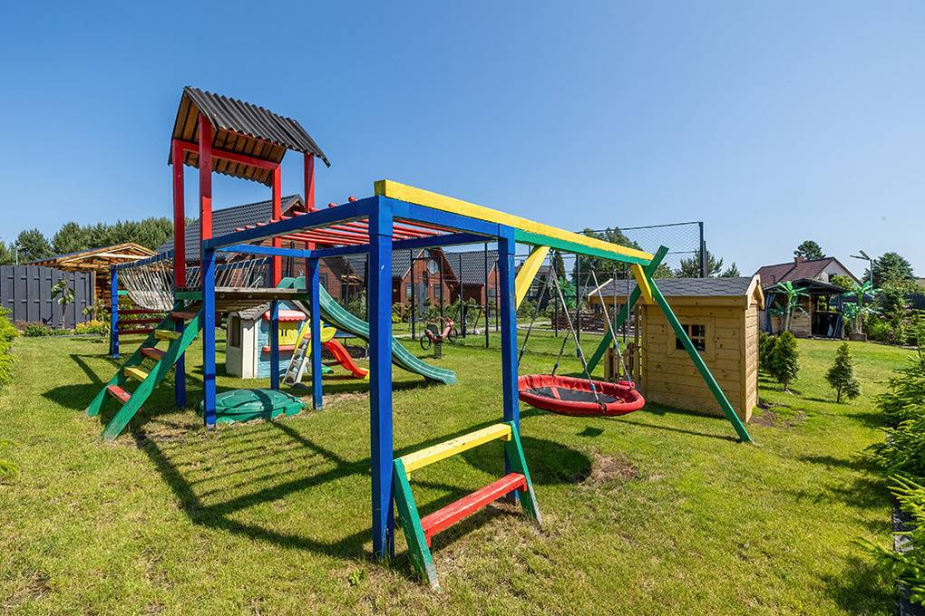 Haus: Drei sehr schöne, komfortable Ferienhäuser mit Sauna, Pool, Whirlpool, Hot Tub auf einem mit viel Liebe zum Detail begrüntem Grundstück, 2020 neu erbaut. Moderne Einrichtung mit gemütlichem Ambiente. Kostenloses Internet über WLan (LTE). Im Erdgeschoß Klimaanlage mit Heizfunktion, E-Radiatoren auf Wunsch, Warmwasser über Durchlauferhitzer. Große, überdachte Terrasse mit Sitzmöbeln, gemauertem Grill, Blick auf den Garten: gemeinschaftliches Sauna-Häuschen, Hot Tub, Whirlpool (Gebühr), Pool mit Liegen, Außendusche, Hollywoodschaukel, Holz Pavillon mit Kicker Tisch, Billard. Kinderspielplatz mit Sandkasten, Schwingbrücke, Schaukeln, Wippe, Rutsche, Trampolin. Kleiner Fußball Platz, Volleyball Feld.1 Pkw-Stellplätze/Haus im Mietpreis inklusiv. Hinweis: Die maximale Personenzahl darf 6 nicht überschreiten.