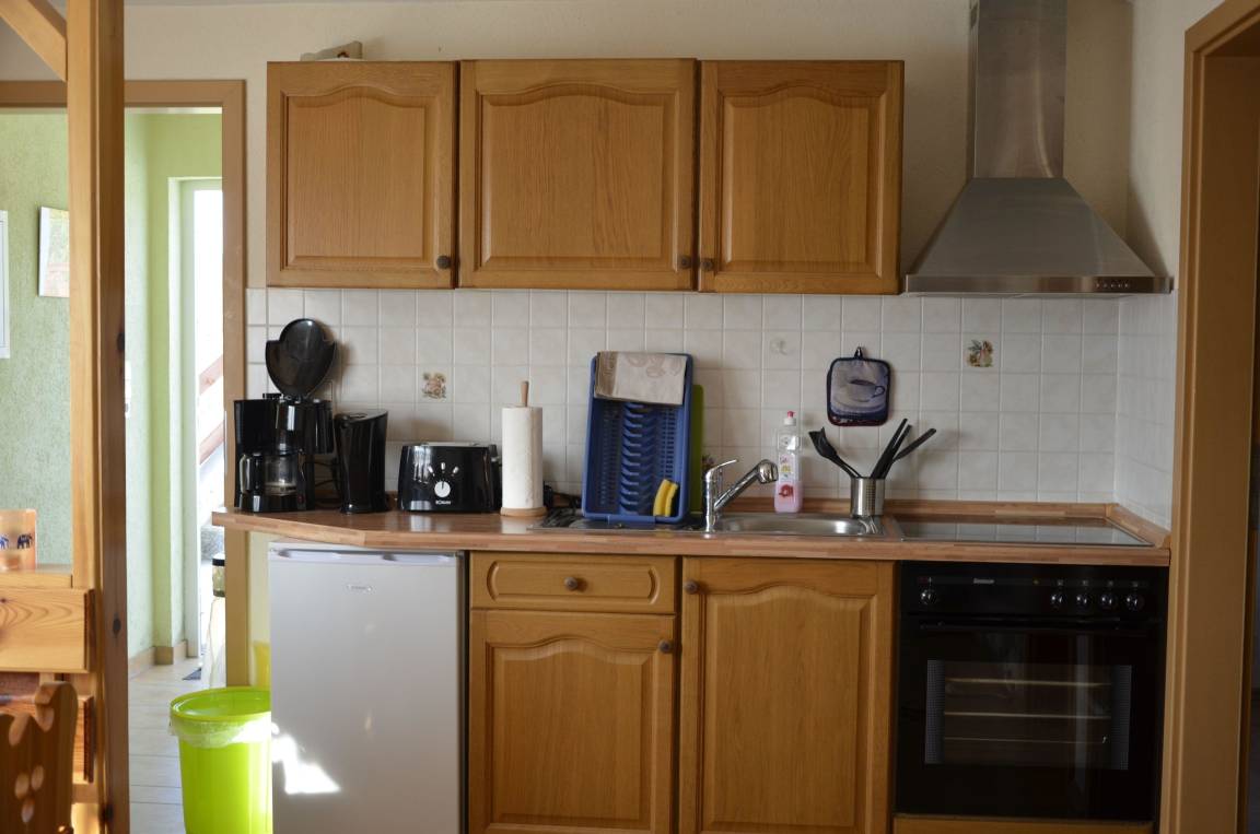 Das Ferienhaus hat eine komplette Küchenzeile mit Backofen Toaster, Kaffeemaschine, Wasserkocher, Kühlschrank und alle kleinen Dinge, die man in einer Küche benötigt. (Warm und Kaltwasser.) Der Wohnbereich ist abgetrennt durch einen Raumteiler, der die großzügige Essecke im Bauernstiel abtrennt. Im hinteren Bereich des Wohnzimmers ist eine gemütliche Sesselecke mit einem Kaminofen, der für Gemütlichkeit sorgt. Zur weiteren Ausstattung gehören Radio und SAT-TV. Sie können wahlweise mit Elektroheizkörper oder Kamin heizen. (Abrechnung nach Verbrauch.)
