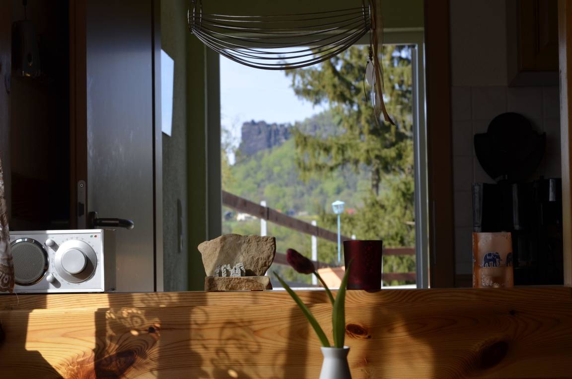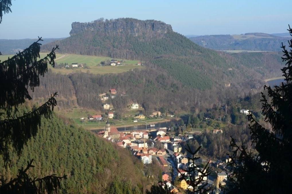 Der Panorama-Blick ist einzigartig. Quirl, Festung Königstein, Rauenstein, die Bärensteine sowie der Lilienstein und natürlich haben Sie noch einen Tiefblick zum Städtchen Königstein und der Elbe mit Schifffahrt.