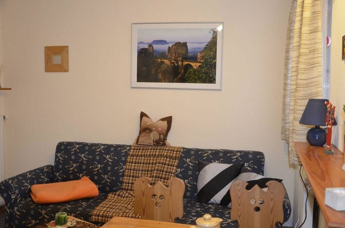Der Wohnaufenthaltsraum bietet Gemütlichkeit und ist mit der Zentralheizung verbunden. Zum Ferienhaus gehört eine Terrasse, von der man einen wundervollen Blick zum Lilienstein genießt. Eine zweite Terrasse mit Dusche (Kalt - Warm) sowie Liegen und Gartenmöbeln stehen allen unseren Urlaubern im Haus 1 und 2 zur Verfügung.