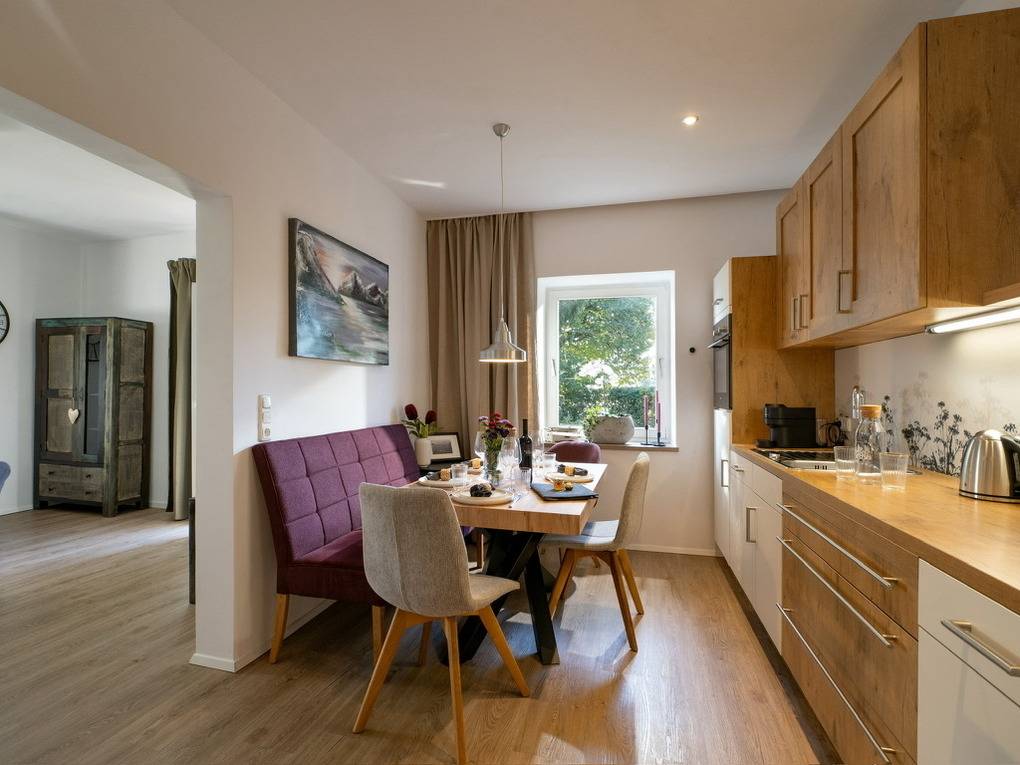Die moderne Küche ist top ausgestattet und lässt kaum Wünsche offen. Eingebaut ist ein Kühlschrank, Geschirrspülmaschine, Induktionskochfeld sowie eine Mikrowelle. Ausserdem stehen ein Toaster, ein Kontaktgrill, Wasserkocher und Töpfe sowie Pfannen zur Verfügung. Ebenso steht eine Nespresso Maschine und Riedl Weingläser für die genussvollen Momente bereit.