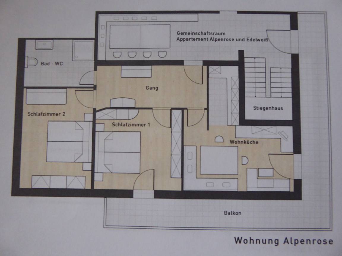 Die Ferienwohnung Alpenrose befindet sich auch im 1.Stock, ist mit ca.74 m² Gesamtfläche sehr groß, Allergiker geeignet, komplett eingerichtet, mit Geschirrspüler, 2 getrennte große Schlafzimmer, eine Wohn-Küche, ein großes Bad, einen Vorraum und einen Balkon