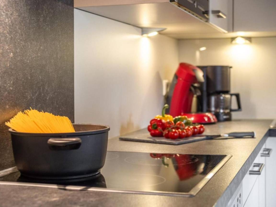 Layout : Parterre: offene Küche mit Kochplatte(4 Kochplatten, Ceranfeld), Wasserkocher, Dunstabzugshaube, Kaffeemaschine(pads), Backofen, Mikrowelle, Geschirrspüler, Kühl-/Gefrierkombination , Wohn/Esszimmer mit TV(Flatscreen, smart TV), Esstisch(8 Personen), Ofen(Holz), Sitzecke, 1x Hochstuhl , Schlafzimmer mit Einzelbett, Einzelbett , Badezimmer mit Dusche, Waschbecken , Toilette mit Waschbecken, Toilette , Waschraum mit Wäschetrockner, Waschmaschine, Bügelbrett , Terrasse