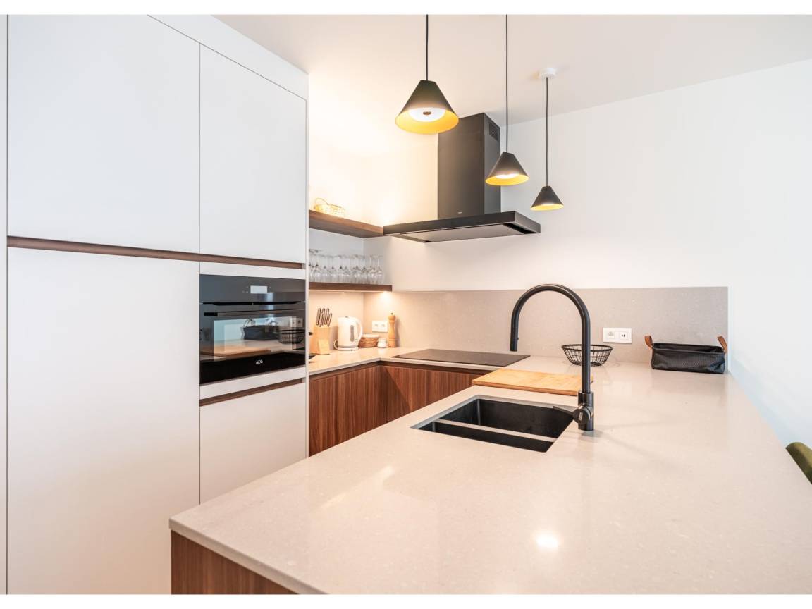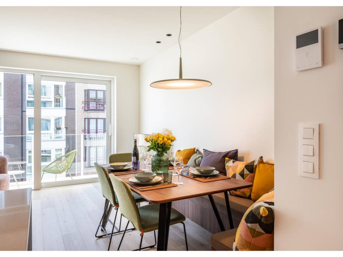 Layout : In der 3. Etage: offene Küche mit Kochplatte(Induktion), Wasserkocher, Toaster, Dunstabzugshaube, Kaffeemaschine(nespresso cups), Backofen, Grill, Kombi-Mikrowelle, Geschirrspüler, Kühlschrank(+ Gefrierfach), Stabmixer , Wohn/Esszimmer mit TV(Flatscreen, digital, smart TV), Esstisch, Sitzecke, Radio , Schlafzimmer mit Doppelbett(Zwei Einzelbettdecken) , Schlafzimmer mit 2x Einzelbett(Bettdecke) , Badezimmer mit Dusche(ebenerdige Dusche), Waschbecken, Föhn , Toilette mit Toilette , Abstellraum mit Waschmaschine, Staubsauger , 2x Balkon, Gartenmöbel, 1x Hochstuhl