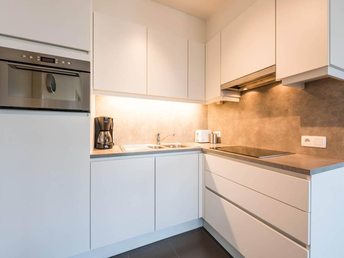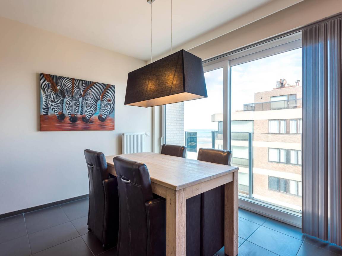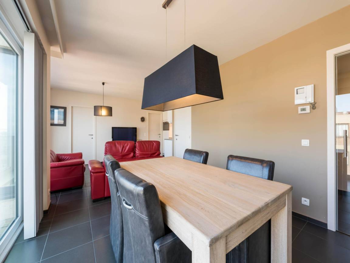 Hausbeschreibung : Schöne Wohnung in einer neuen Residenz mit 2 Schlafzimmern und seitlichem Meerblick. Die Wohnung befindet sich im 6. Stock mit Aufzug, modern gestaltet mit hochwertigen Materialien und ausgestattet mit allen Annehmlichkeiten und einer voll ausgestatteten Küche. Die Wohnung hat eine Top-Lage im Zentrum von Koksijde als auch direkt am Strand