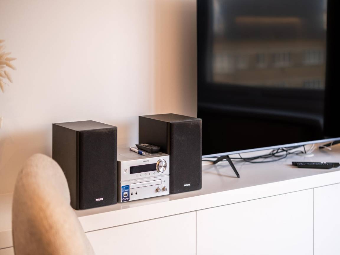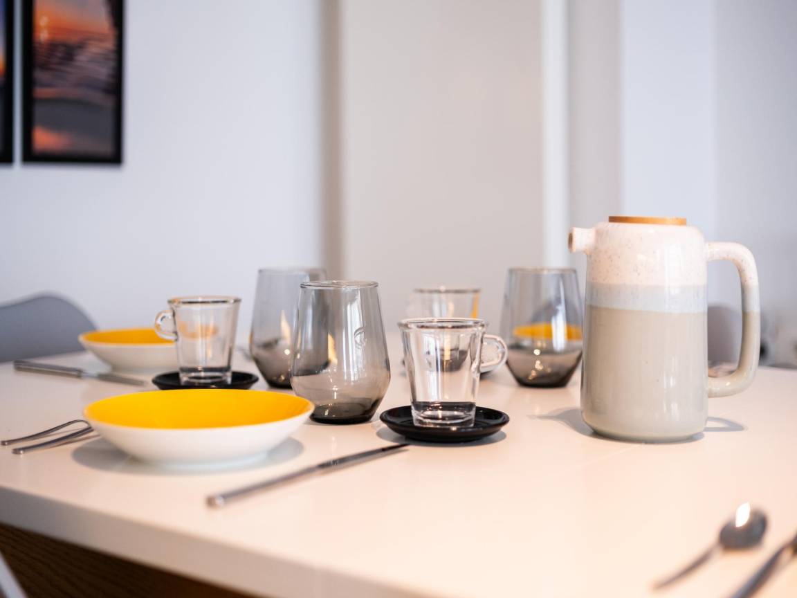 Layout : In der 2. Etage: offene Küche mit Kochplatte(Induktion), Wasserkocher, Toaster, Dunstabzugshaube, Kaffeemaschine(Filter, senseo pads), Backofen, Geschirrspüler, Kühl-/Gefrierkombination, Stabmixer , Wohn/Esszimmer mit TV(Flatscreen, digital, smart TV), Esstisch, Sitzecke, DVD-Player, Stereoanlage , Schlafzimmer mit Doppelbett(Doppelbettdecke) , Schlafzimmer mit 2x Einzelbett(Bettdecke) , Badezimmer mit Dusche(ebenerdige Dusche), Waschbecken , Toilette mit Toilette , Abstellraum mit Wäschetrockner, Waschmaschine, Staubsauger, Bügelbrett, Bügeleisen , 2x Balkon, Gartenmöbel(2 Personen)