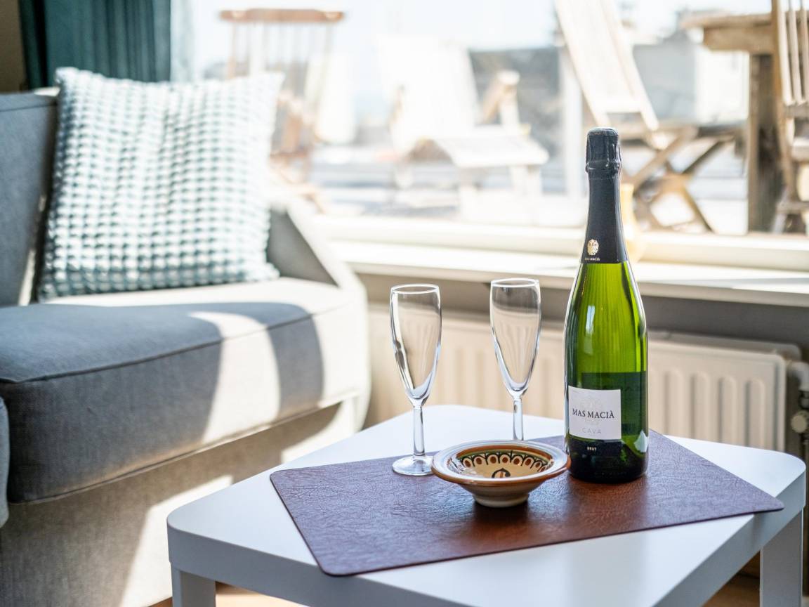 Layout : In der 6. Etage: Küche mit Kochplatte(Gas), Wasserkocher, Toaster, Dunstabzugshaube, Kaffeemaschine(Filter, senseo pads), Mikrowelle, Kühlschrank(+ Gefrierfach), Stabmixer , Wohn/Esszimmer mit Doppelschlafcouch(Doppelbettdecke), TV(Flatscreen, digital), Esstisch, Sitzecke , Durchgangsschlafzimmer mit Doppelbett(Doppelbettdecke) , Badezimmer mit Dusche, Waschbecken, Toilette , Staubsauger, Dachterasse, Gartenmöbel, 2x Liegen, 2x Liegestühle
