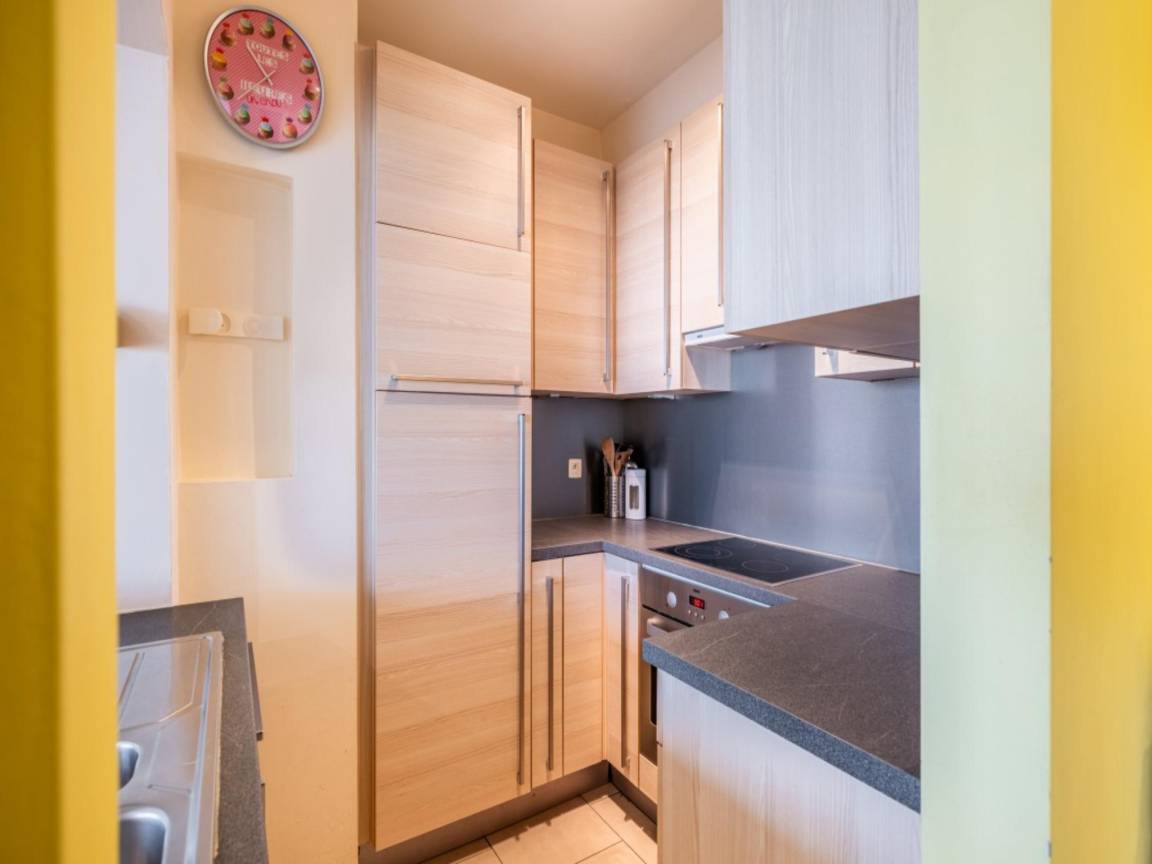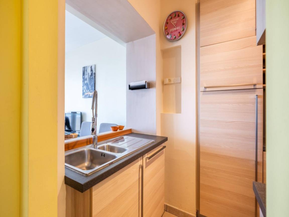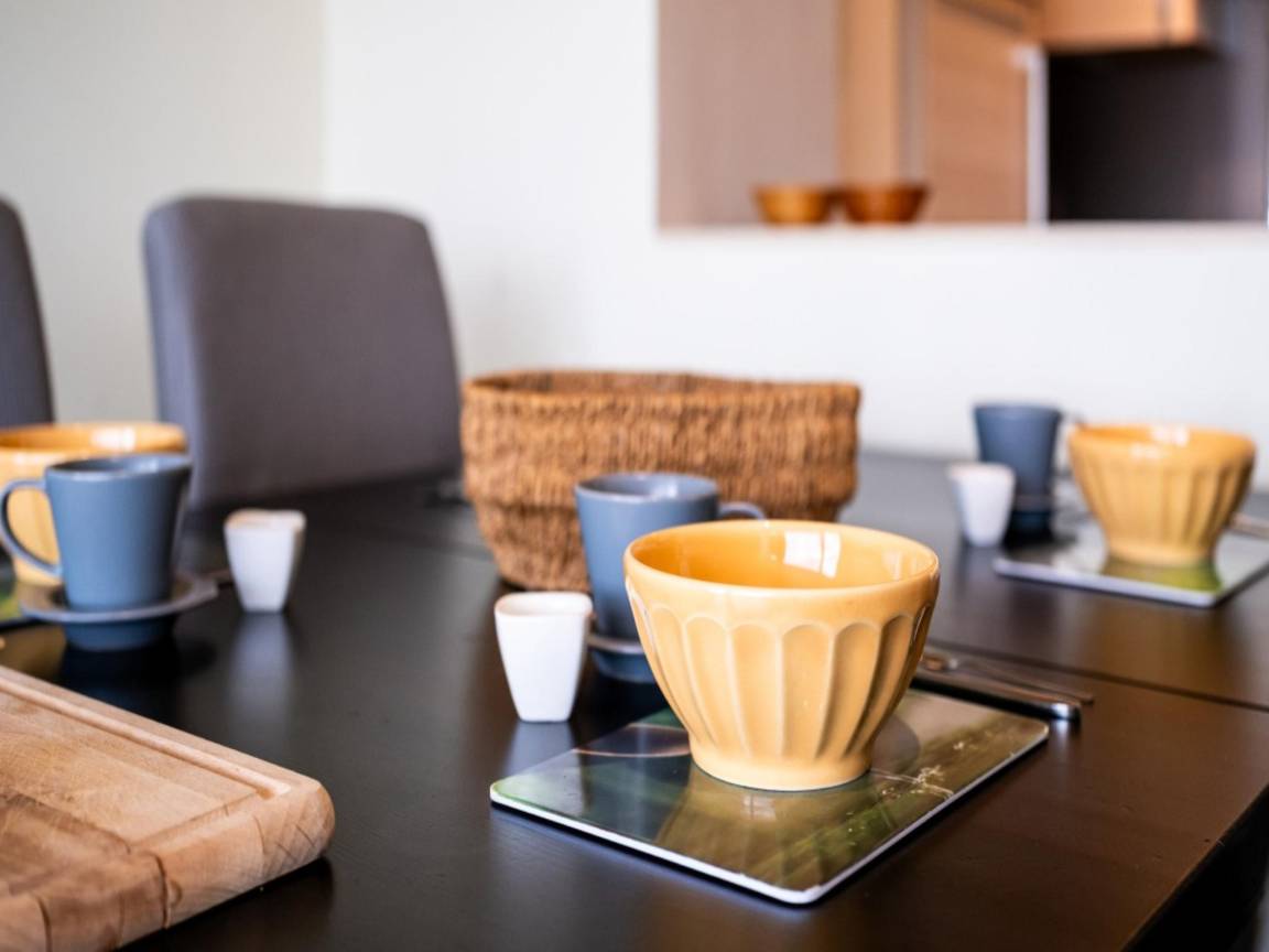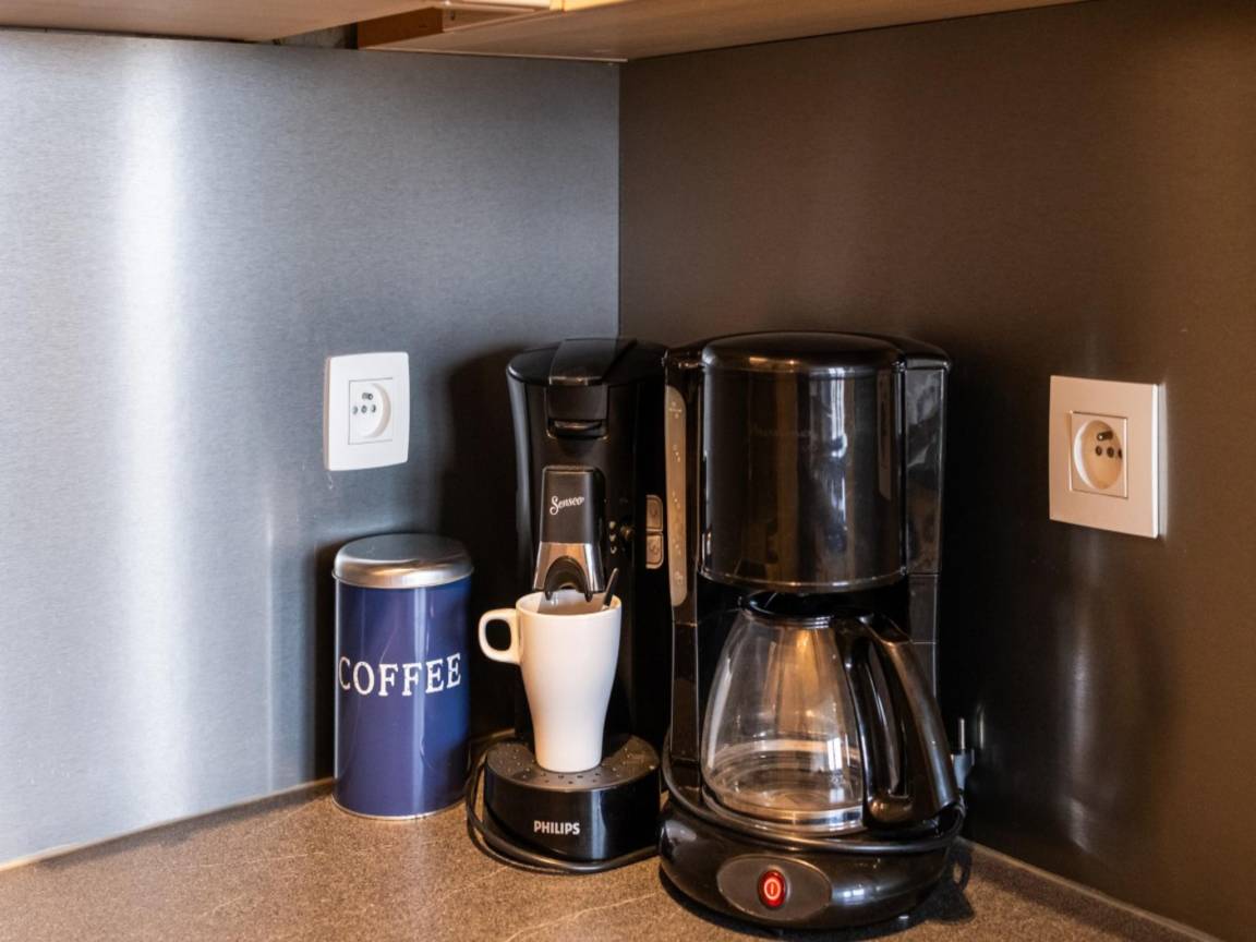 Layout : In der 1. Etage: Küche mit Kochplatte(Ceranfeld), Wasserkocher, Dunstabzugshaube, Kaffeemaschine(Filter, senseo pads), Backofen, Mikrowelle, Geschirrspüler, Kühlschrank(+ Gefrierfach) , Wohn/Esszimmer mit Doppelschlafcouch(Doppelbettdecke), TV(Flatscreen, digital), Esstisch, Sitzecke , Schlafzimmer mit Doppelbett(Doppelbettdecke), Waschbecken , Schlafzimmer mit Etagenbett(Bettdecke), Waschbecken , Badezimmer mit Dusche, Waschbecken , Toilette mit Toilette , Staubsauger, Balkon, Bügelbrett, Bügeleisen