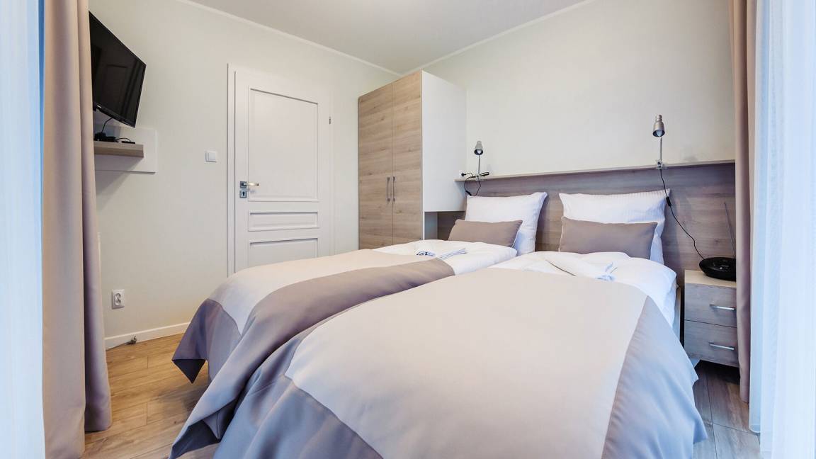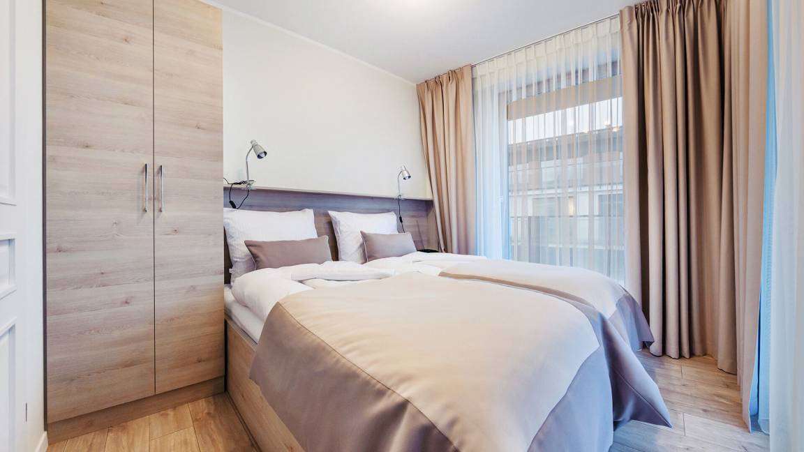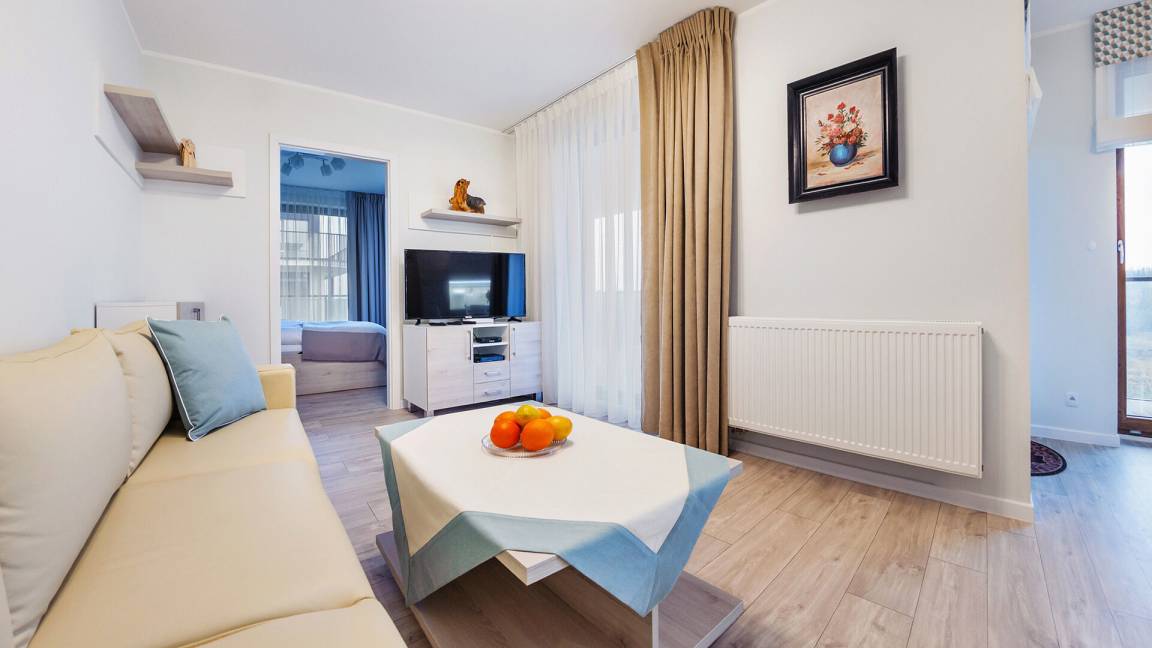Die Apartments im Objekt Resorts Kołobrzeg befinden sich im westlichen Teil von Kołobrzeg, abseits des städtischen Trubels, umgeben vom Grün des NATURA-2000-Parks. Diese Lage garantiert saubere Luft, malerische Ausblicke und direkten Kontakt zur Natur. Die Plażowa-Straße mit ihren breiten Gehwegen und Radwegen ist ein Teil der R10-Fahrradroute. Ein fünfminütiger Spaziergang über einen direkten Zugang zum Meer reicht aus, um den breiten, sandigen „Weststrand" zu erreichen; ganz in der Nähe befindet sich auch ein Hundestrand. Alle Apartments sind hochwertig ausgestattet und verfügen über funktionale, voll ausgestattete Küchenzeilen sowie geräumige Terrassen mit Blick auf den Innenhof oder das Grün des NATURA-2000-Parks. Vor dem Gebäude gibt es einen öffentlichen, kostenpflichtigen Stadtparkplatz (begrenzte Anzahl an Stellplätzen). Auf dem Gelände stehen ein nummerierter Außenparkplatz sowie Parkplätze in der Tiefgarage zur Verfügung, die den meisten Apartments zugeordnet sind und gegen Aufpreis genutzt werden können. Im Objekt befindet sich ein Schwimmbad, das täglich von 10:00 bis 21:00 Uhr geöffnet ist, sowie eine Sauna, die täglich von 16:00 bis 21:00 Uhr geöffnet ist. Der Pool befindet sich im Gebäude A; aus Gebäude B gibt es keinen direkten Zugang zu Gebäude A.