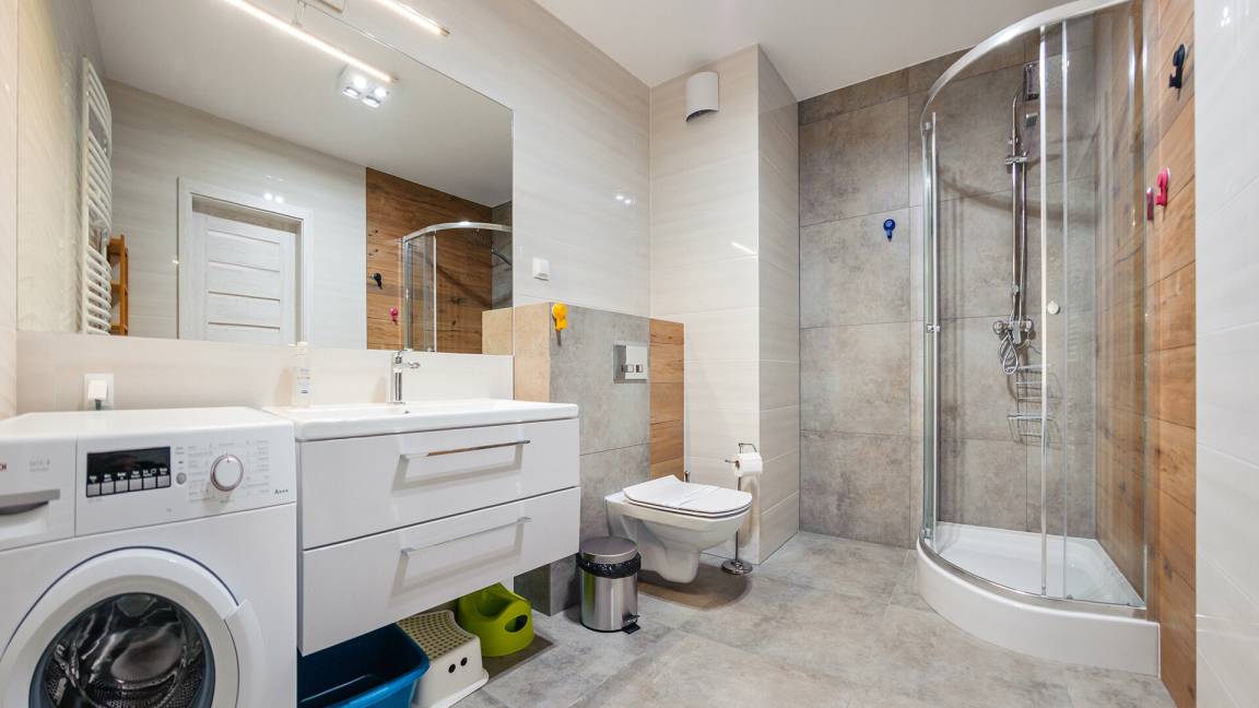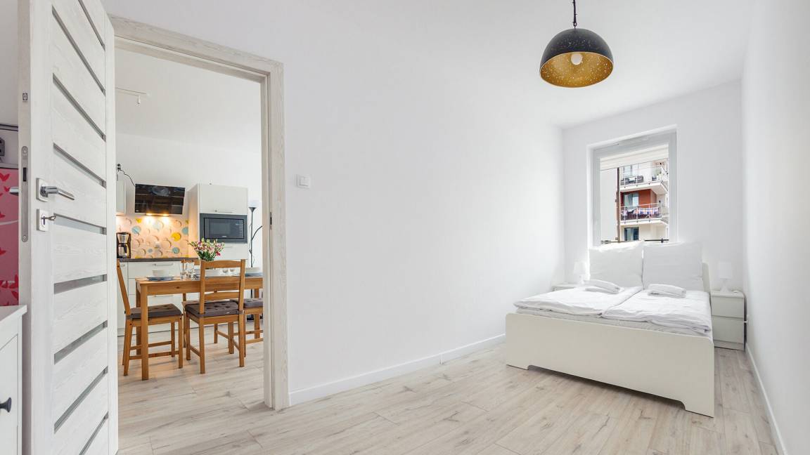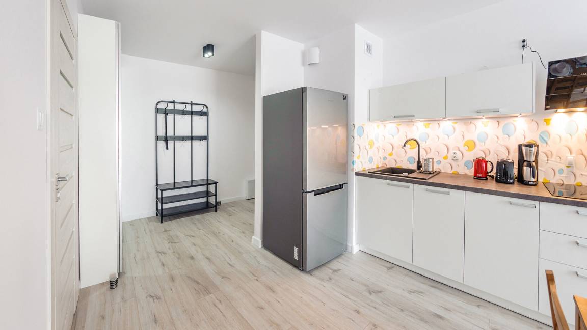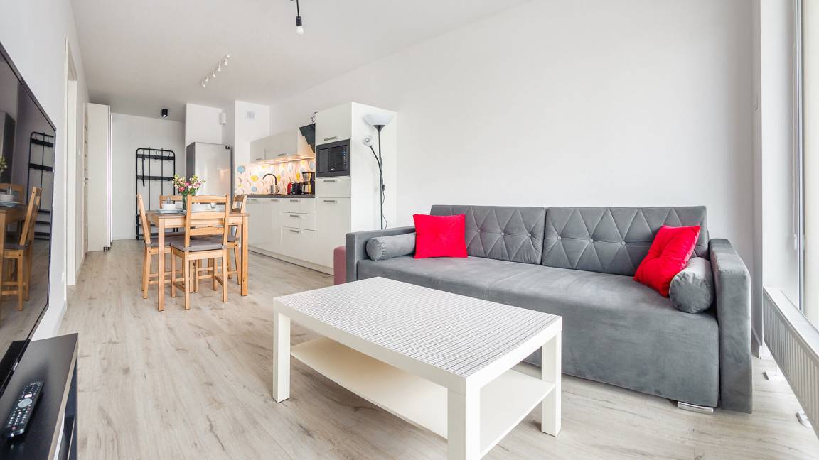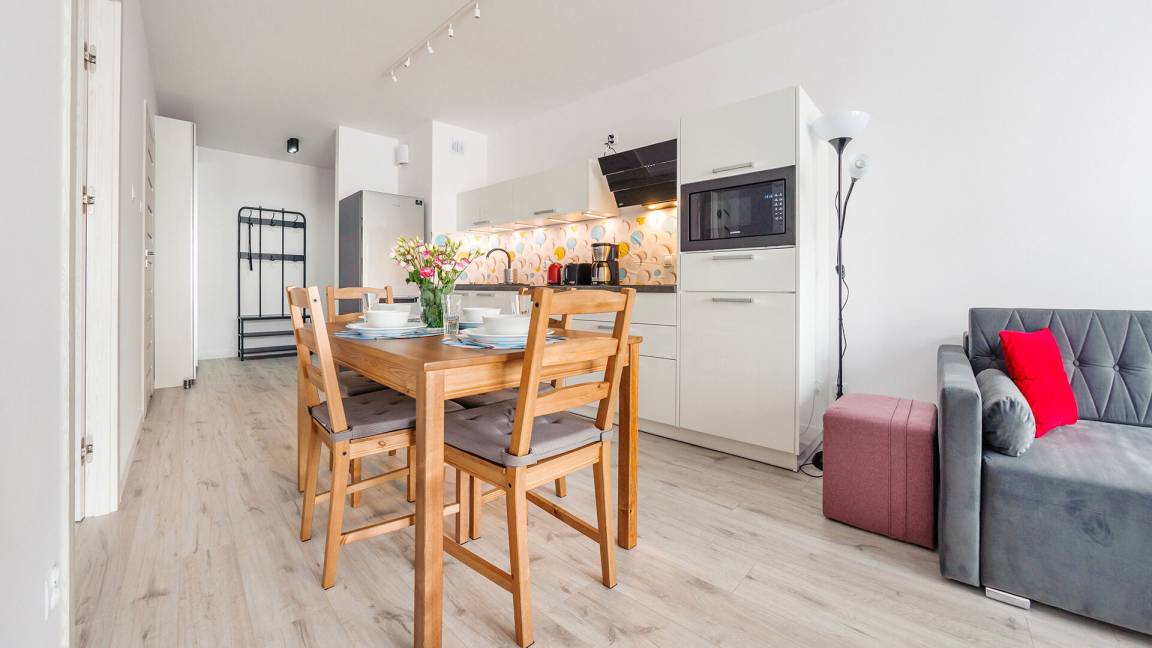 • Haustiere sind in der ausgewählten Wohnung erlaubt. Die Kosten für den Aufenthalt mit einem Haustier betragen 40 PLN pro Tag.