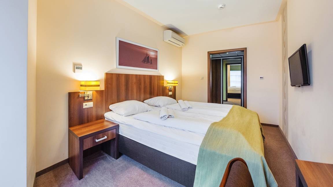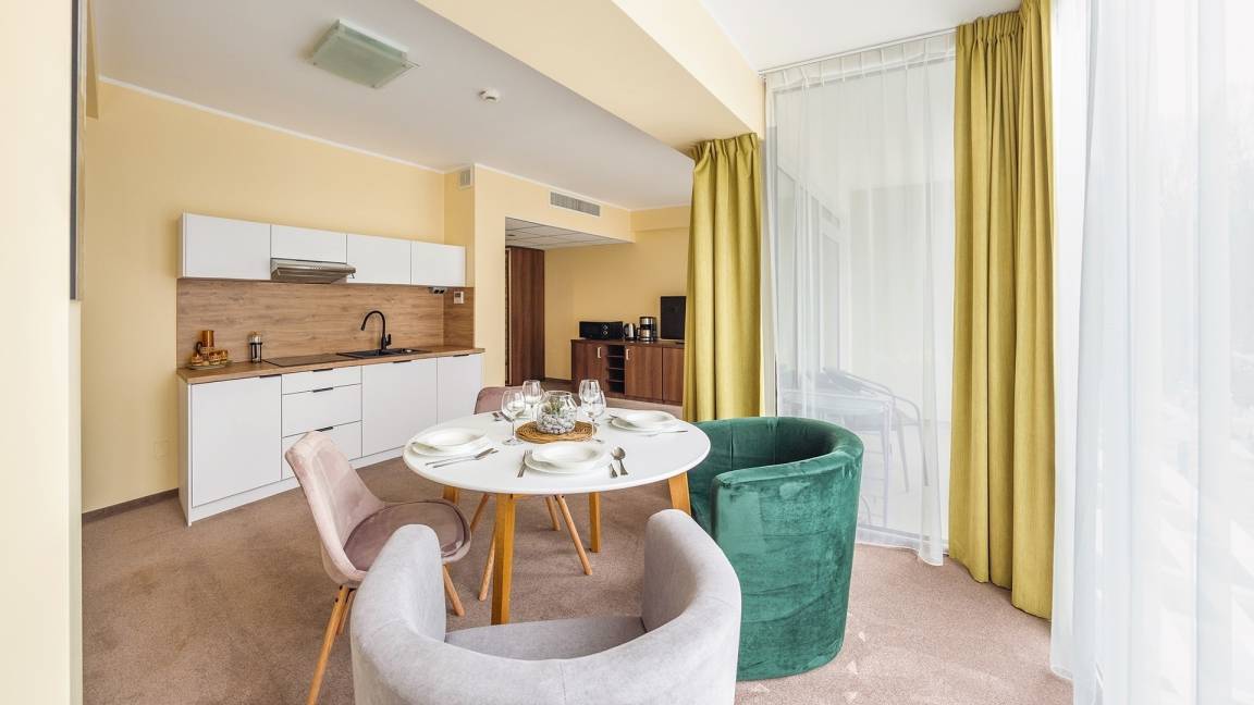 Die Unterkunft liegt in kurzer Entfernung zum Strand, direkt an der Promenade. Die Umgebung ist grün und ruhig. Das Gebäude befindet sich direkt am Küstenpark. In der Nähe gibt es zahlreiche Restaurants, Pubs und Geschäfte. Vor Ort gibt es ein Café sowie einen Kinderspielplatz. Die Gäste können gegen Gebühr das Solebad und SPA-Anwendungen nutzen. Die Unterkunft bietet auch eine breite Palette an Kurbehandlungen, und es gibt kostenpflichtige Parkplätze (Parkplatzreservierung an der Hotelrezeption möglich).