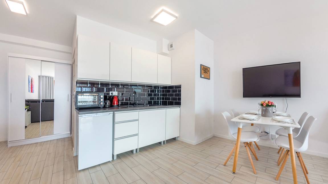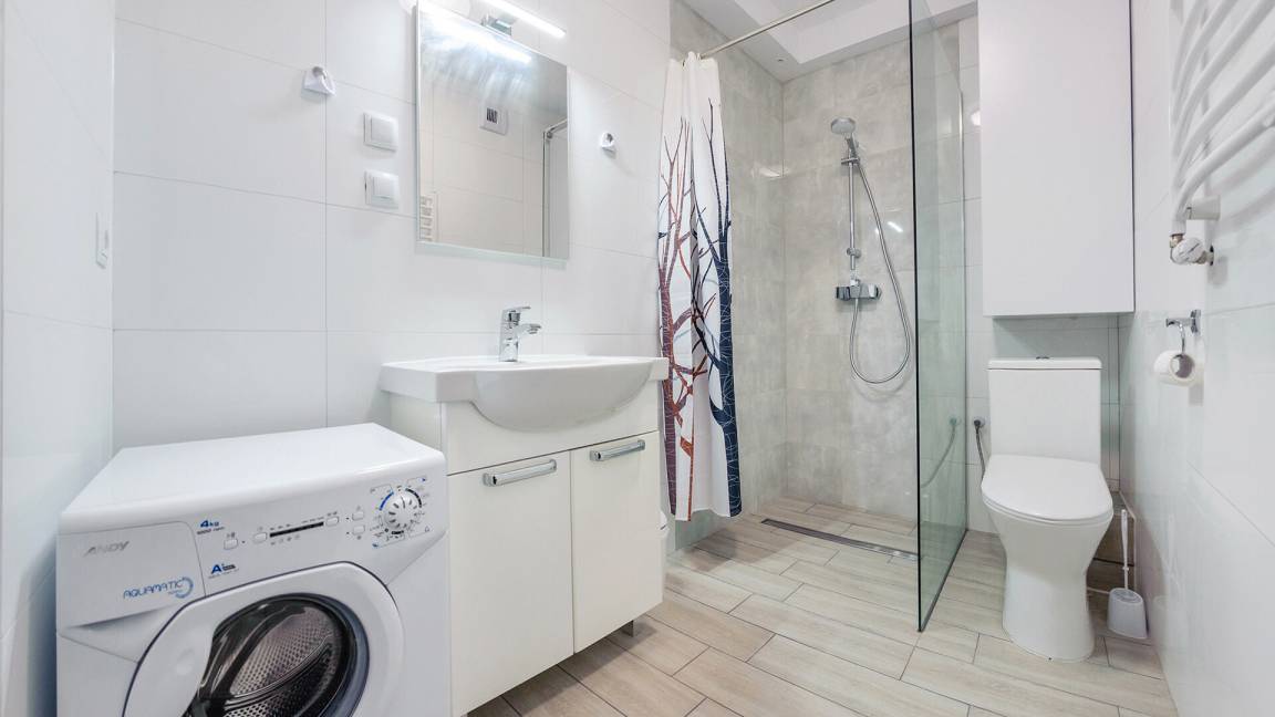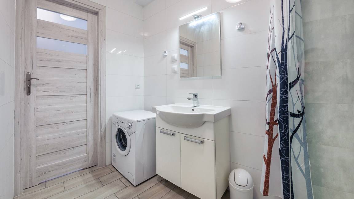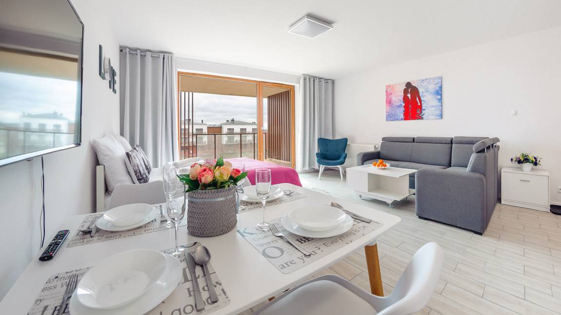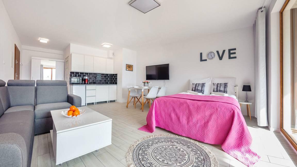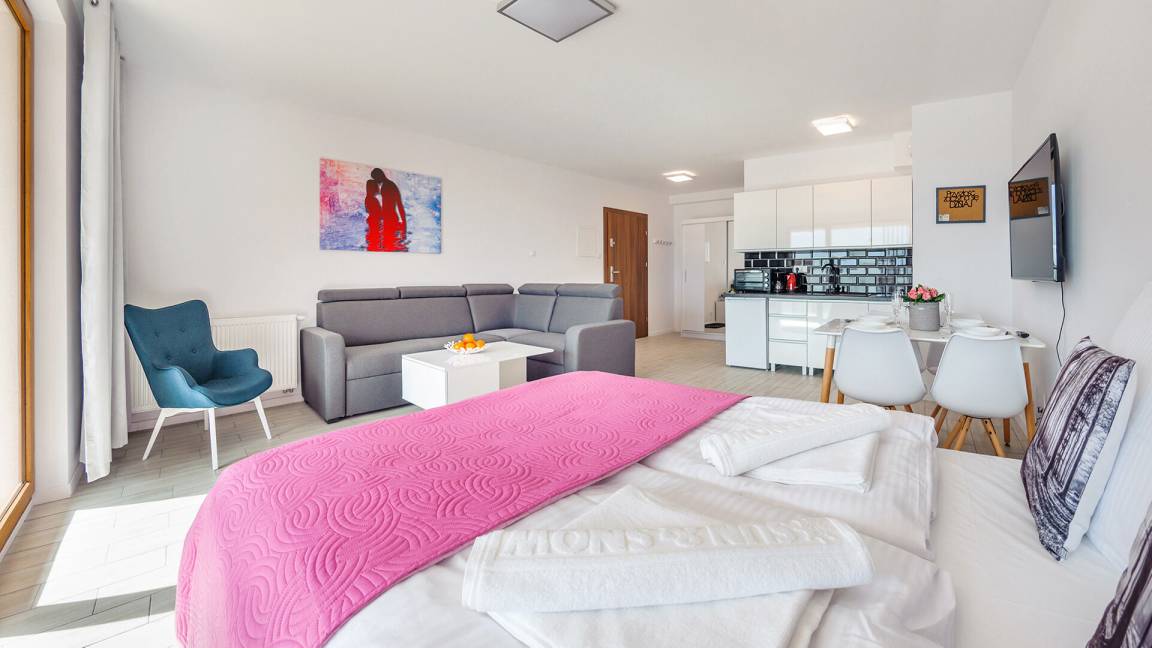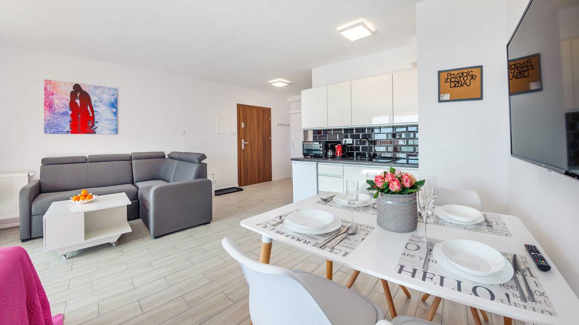 • Haustiere sind in der ausgewählten Wohnung erlaubt. Die Kosten für den Aufenthalt mit einem Haustier betragen 40 PLN pro Tag.