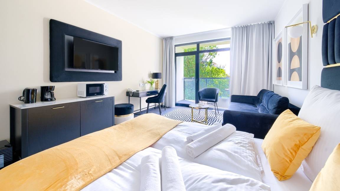 Das Solny Resort ist ein modernes 4-Sterne-Hotel in einer ruhigen, grünen Gegend von Kołobrzeg, nur wenige Schritte vom Strand und dem Amphitheater entfernt. Es bietet komfortable Apartments mit sauberer Bettwäsche und Handtüchern. Gäste können den Außenpool kostenlos, den Innenpool gegen Gebühr sowie die Sauna und Ermäßigungen auf Massagen nutzen. In der Umgebung gibt es viele Restaurants und Erholungsgebiete.