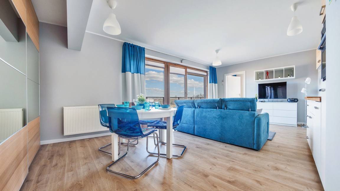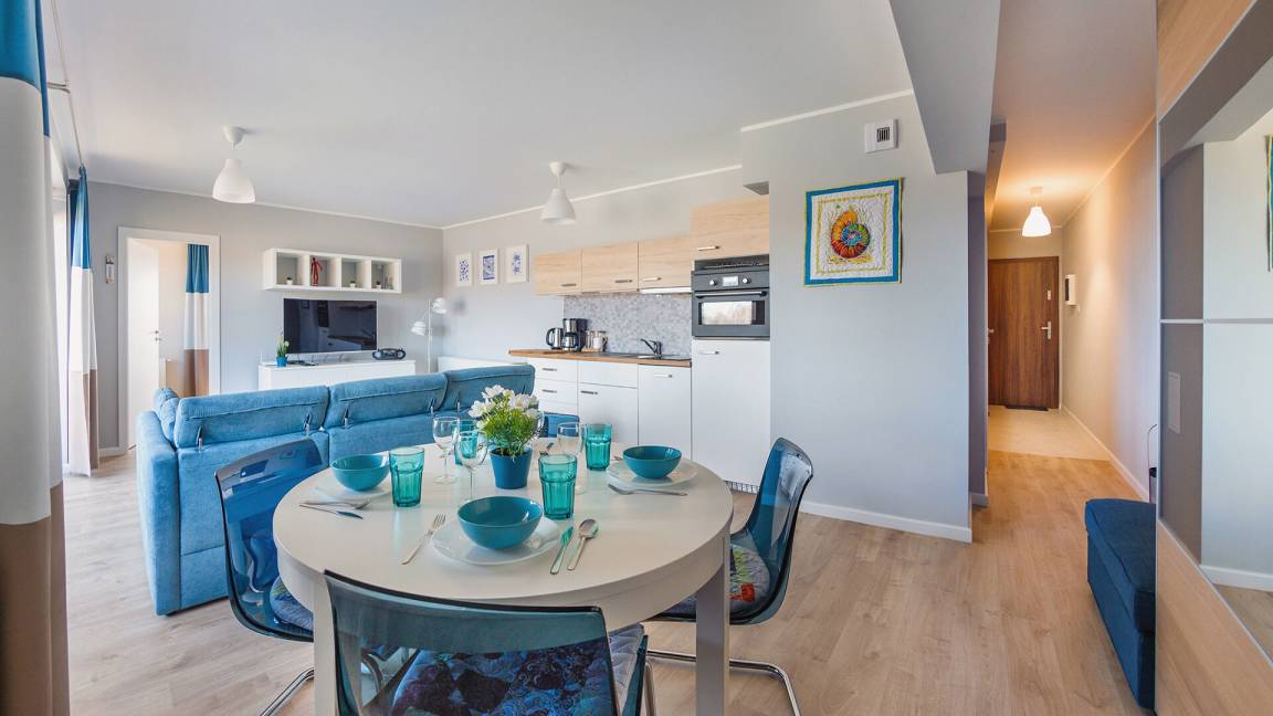 Die Apartments im Resorts Kołobrzeg liegen im ruhigen, westlichen Teil der Stadt, umgeben vom NATURA-2000-Park und nur wenige Minuten vom breiten Weststrand sowie einem Hundestrand entfernt. Die Lage bietet saubere Luft, direkten Kontakt zur Natur und Zugang zu Rad- und Spazierwegen. Die Apartments sind hochwertig ausgestattet und verfügen über voll ausgestattete Küchenzeilen sowie große Terrassen. Auf dem Gelände stehen nummerierte Außenparkplätze und Tiefgaragenplätze gegen Aufpreis zur Verfügung, zudem gibt es einen öffentlichen, kostenpflichtigen Parkplatz vor dem Gebäude. Gästen stehen ein täglich geöffneter Pool sowie eine Sauna zur Verfügung. Kołobrzeg bietet das ganze Jahr über zahlreiche Freizeit- und Kulturangebote sowie eine vielfältige Gastronomie.
