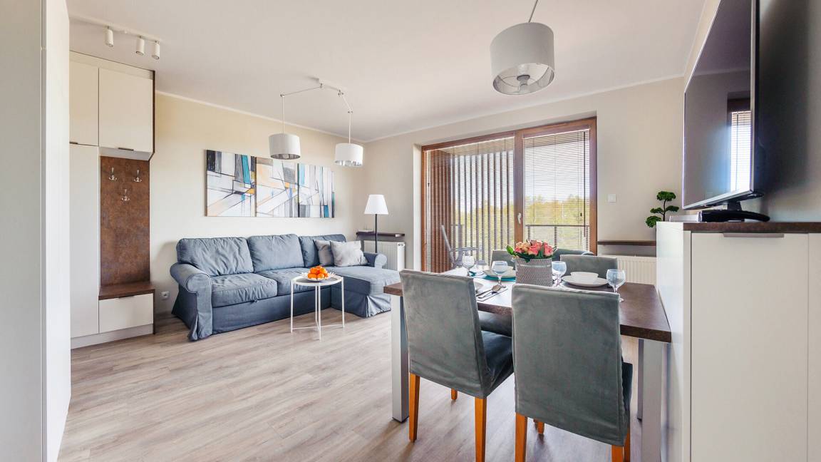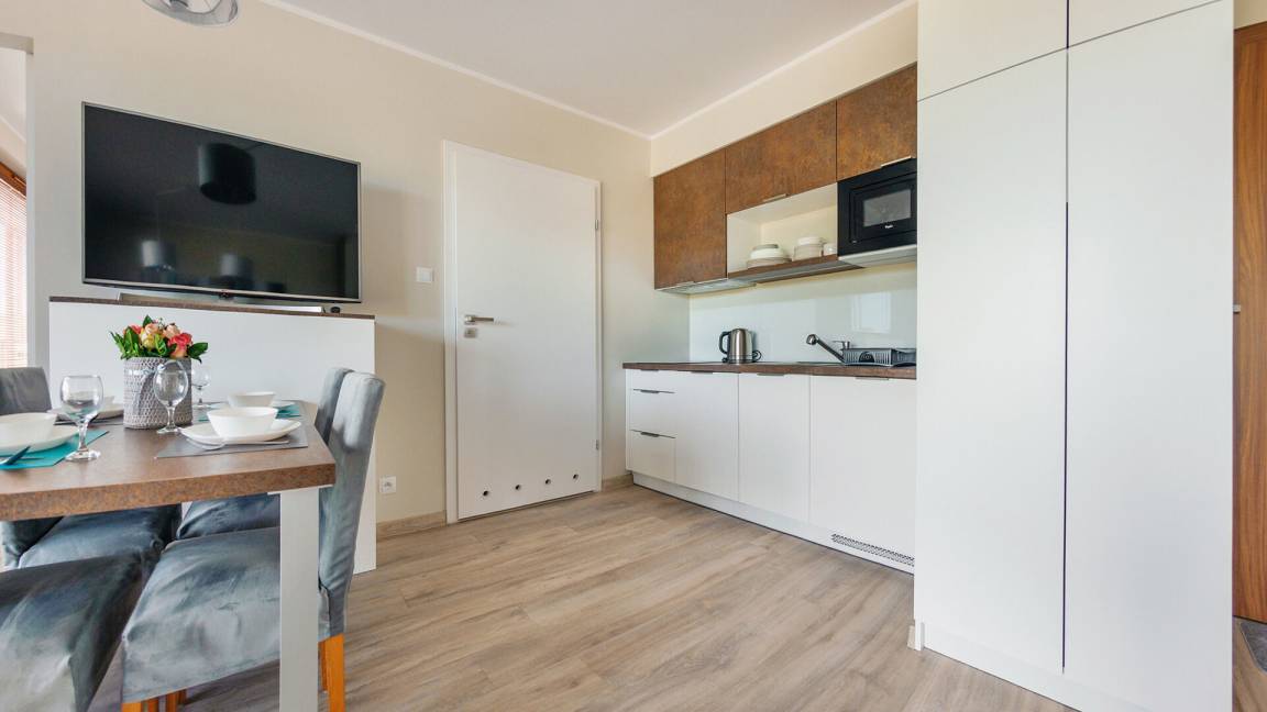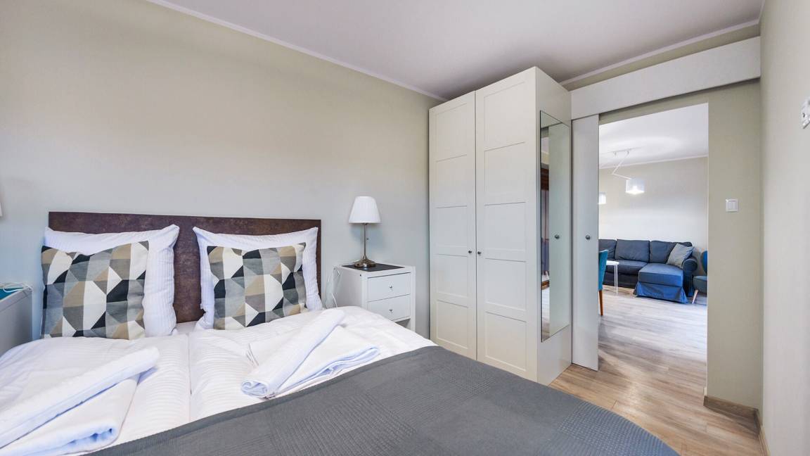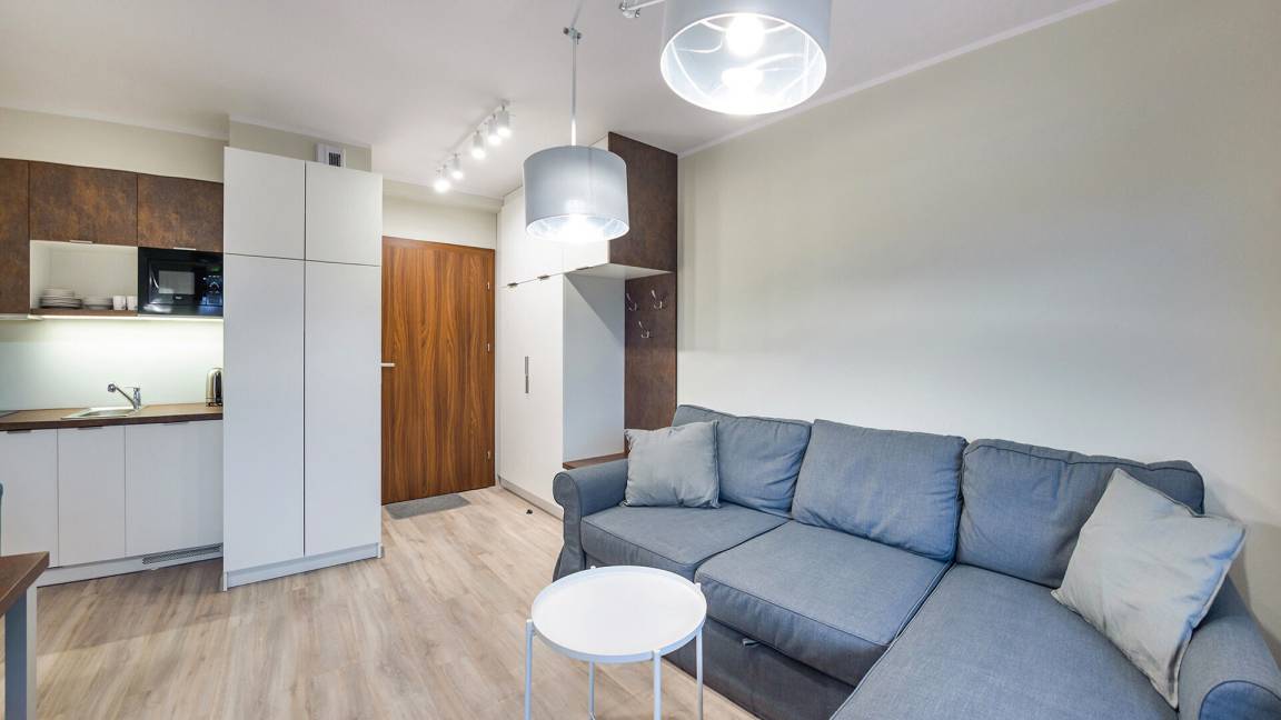• Haustiere sind in der ausgewählten Wohnung erlaubt. Die Kosten für den Aufenthalt mit einem Haustier betragen 40 PLN pro Tag.